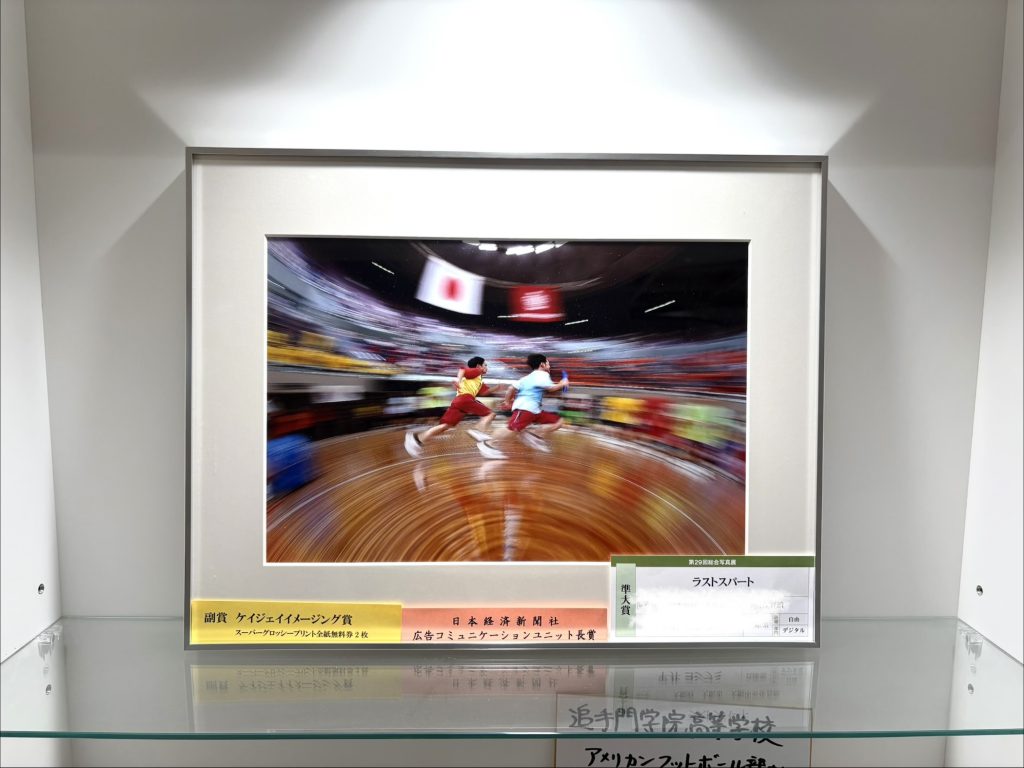 『ラストスパート』というタイトルの写真で、コンテストで賞を受けられた作品です。生徒の躍動感、地球が自転しているような不思議で目が回るような感覚、面白い写真ですね。
