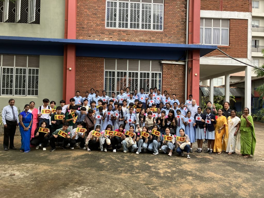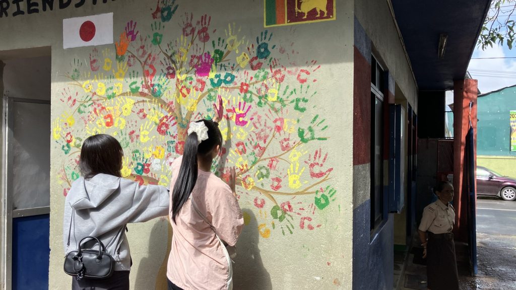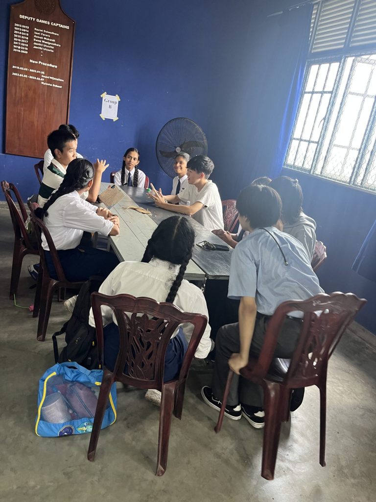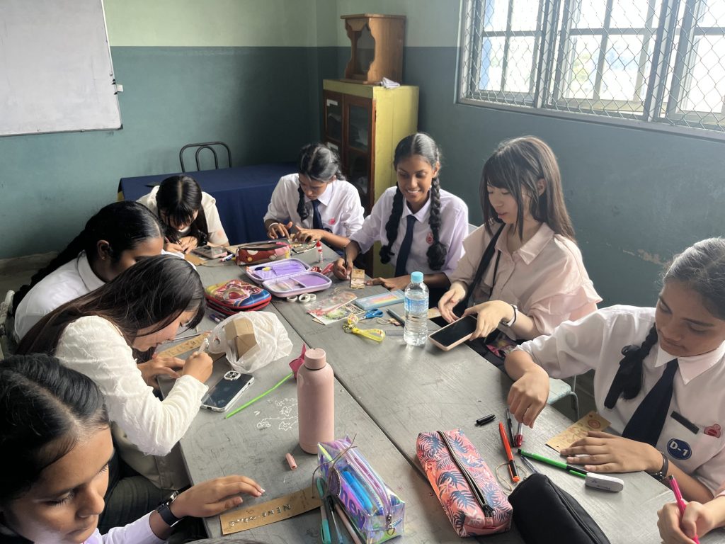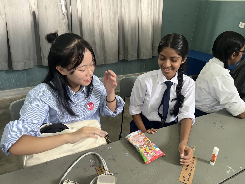 学校交流では、積極的に現地の学生とコミュニケーションをとろうとする姿が見られました。2人1組のペア4つ程でグループになって、スリランカの言葉を教えてもらったり、日本ことを伝えたりしていました。お寿司を作る知育菓子が人気で盛り上がっていたグループもありました。