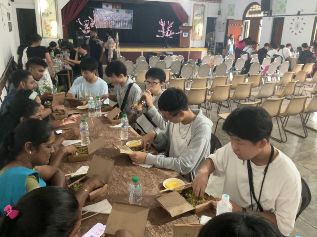 昼食も相手の文化を知るを意識し、スリランカの学生に箸の使い方を教えてあげ、こちらは手で食べる方法を教えてもらいました。みんな苦戦しながら頑張って手で食べていました。