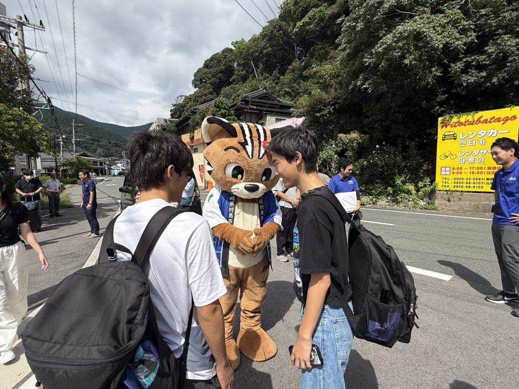 対馬の厳原港で、「ツシマヤマネコ」たモチーフのキャラクター「つばきちゃん」に出迎えてもらいました!