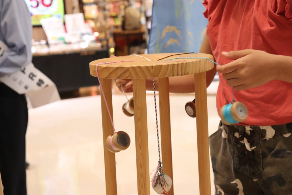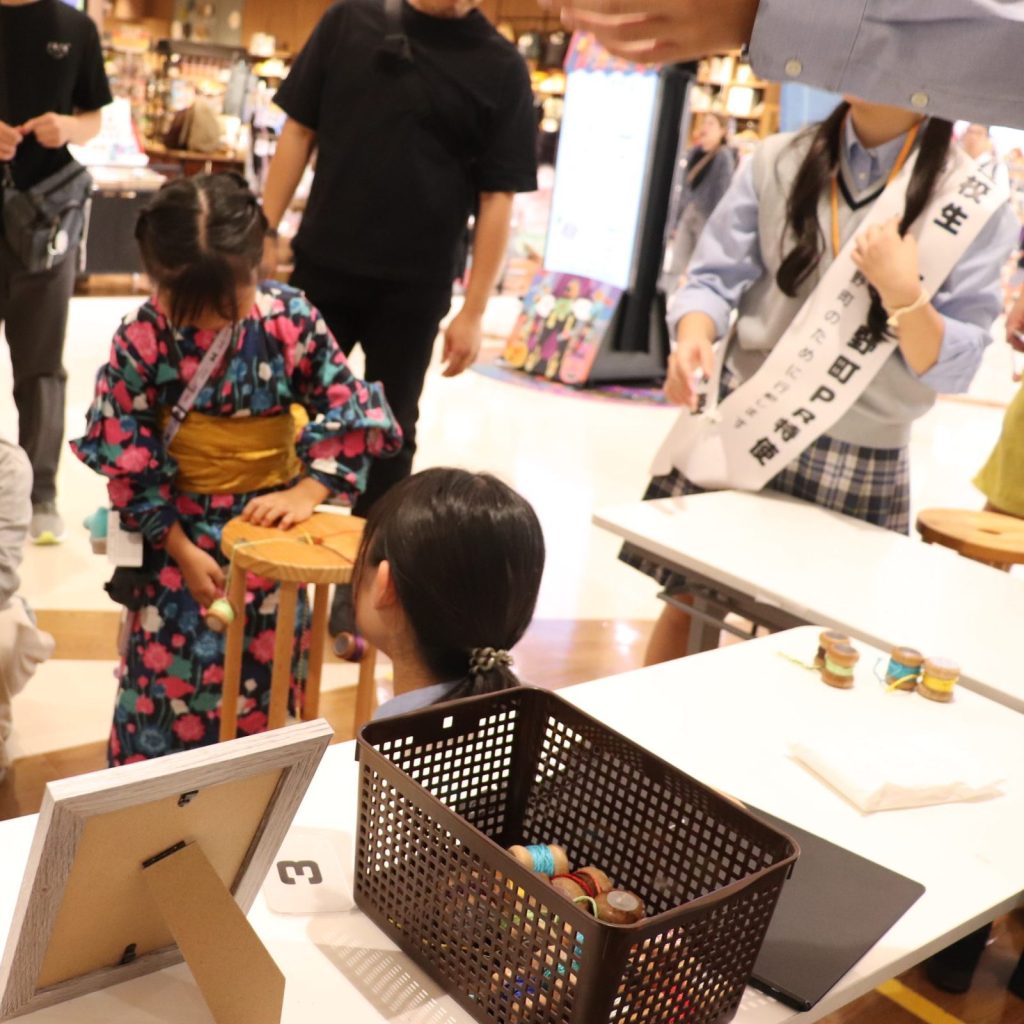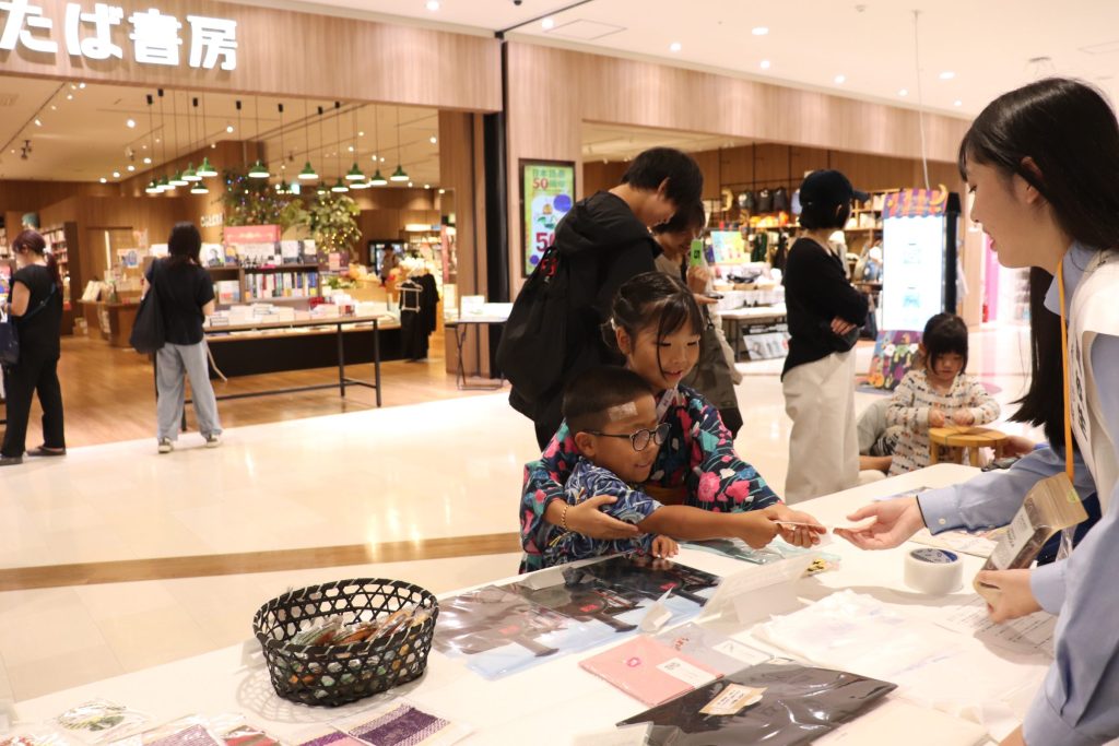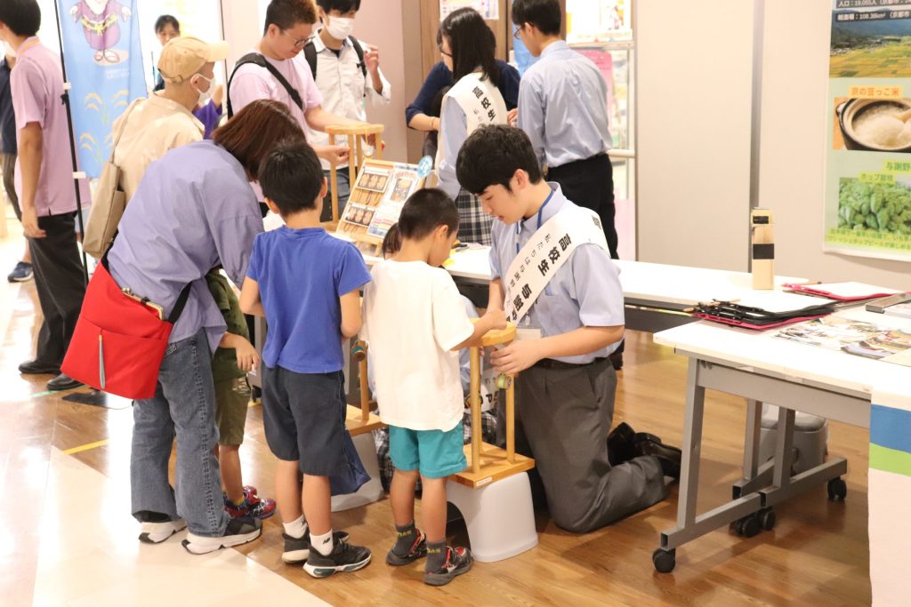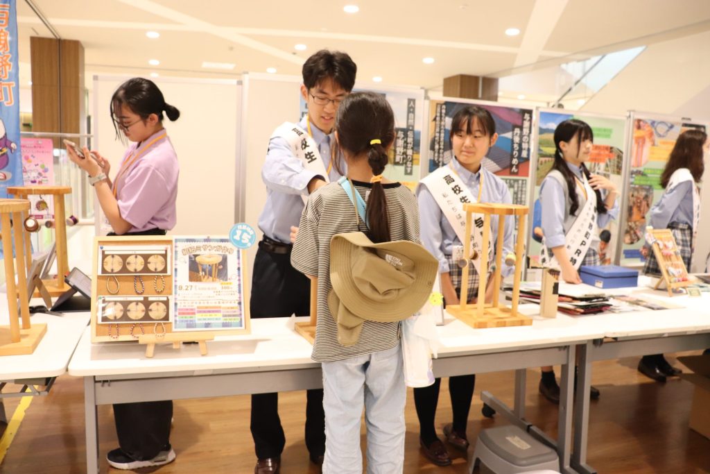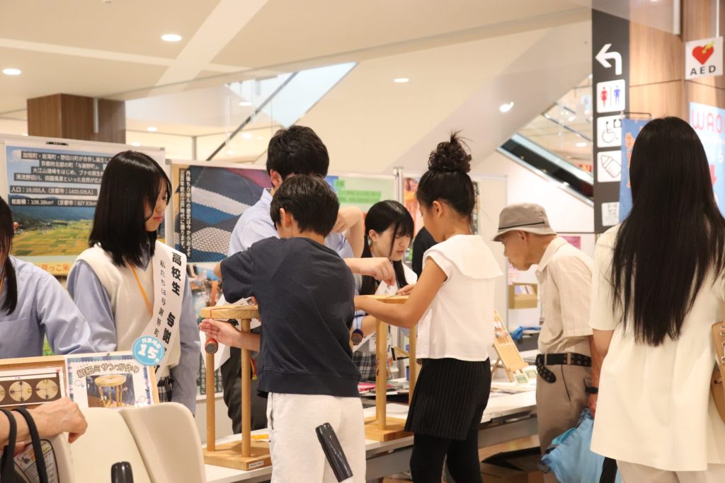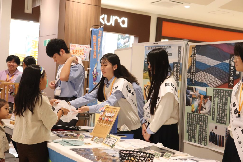 お買い物で来られたお客様がたくさん足を止めてくださいました。商品を見ていただきなたら生徒たちも与謝野町の魅力をアピール! また、丹後シルクを使ったミサンガ体験には小さなお子様もたくさん来てくれました!
