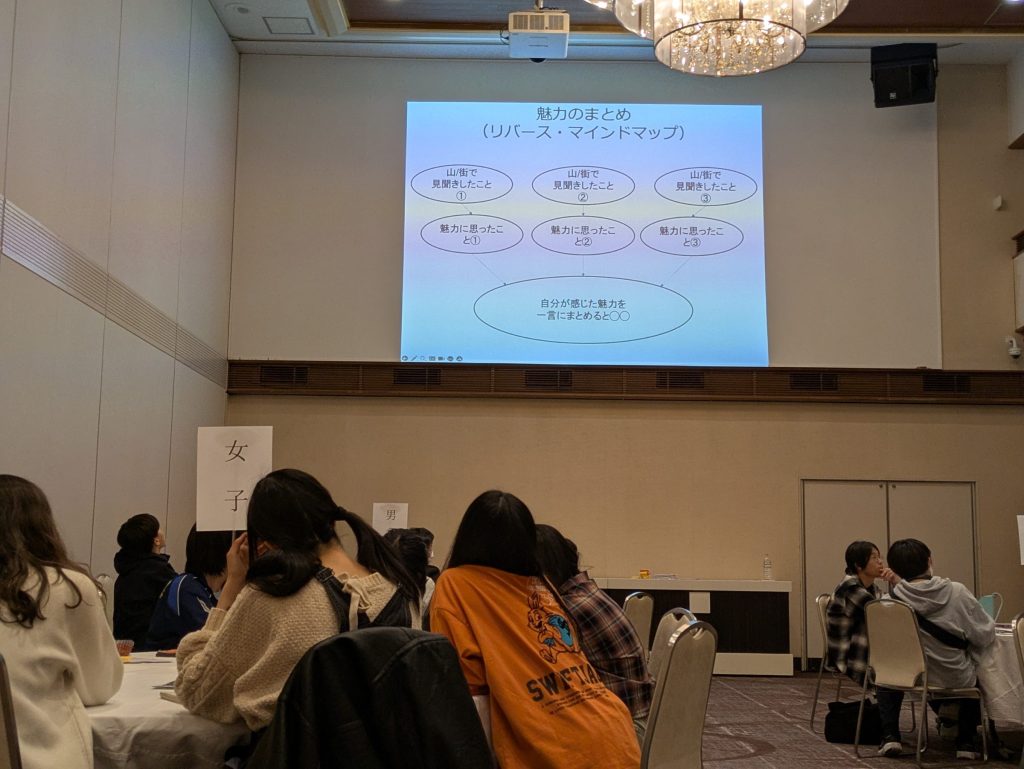 宿に戻り、山班・街班それぞれが見たこと、感じたこと、魅力に感じたことを書き出し共有しました。