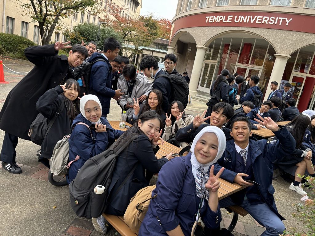 まずはグループごとに立てたプランでそれぞれ観光し、お昼はテンプル大学京都キャンパスへ全員で向かいました。お昼にピザをいただきながらテンプル大学の説明を聞き、その後は大学生によるキャンパスツアーも実施されました。創造コースの生徒もGIBSの生徒も、テンプル大学に興味津々な様子で、質疑応答では様々な質問をしていました。