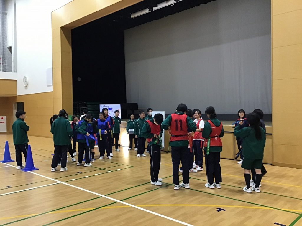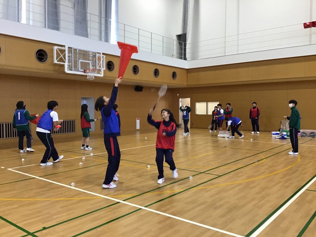創造コース3年生の体育では、1年次から3年次1学期までに行ってきた体育の種目を振り返りながら、それぞれの種目の魅力や特性を組み合わせてニュースポーツを考案するプロジェクトを行っています。