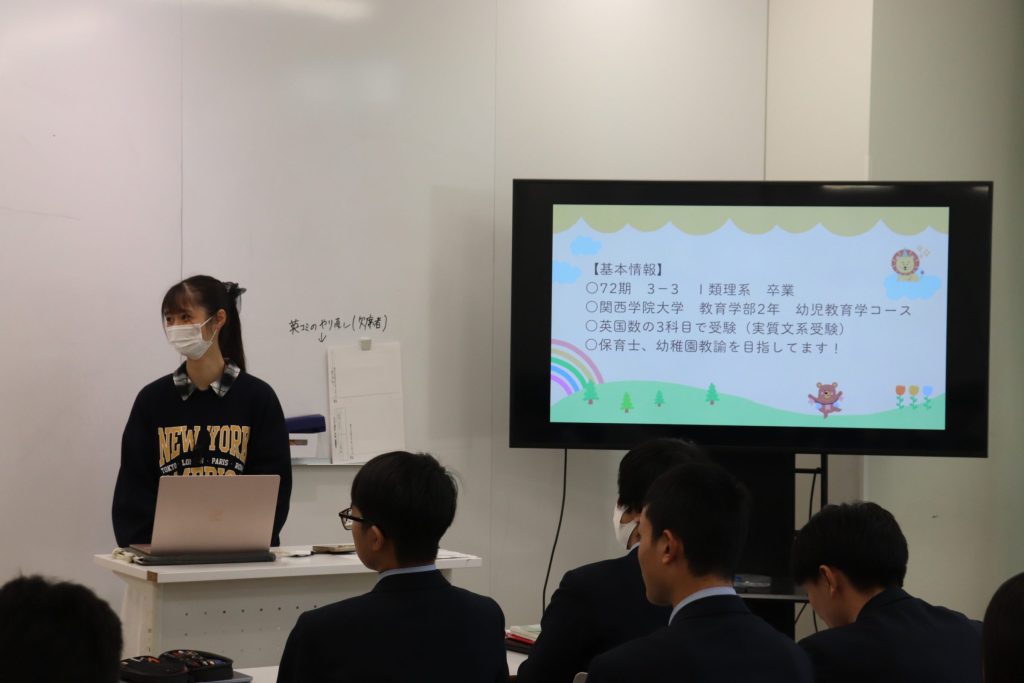 大学入試を終えた本校卒業生を招き、生徒たちに進路選択や受験勉強について実体験に基づいたお話をしてもらいました。