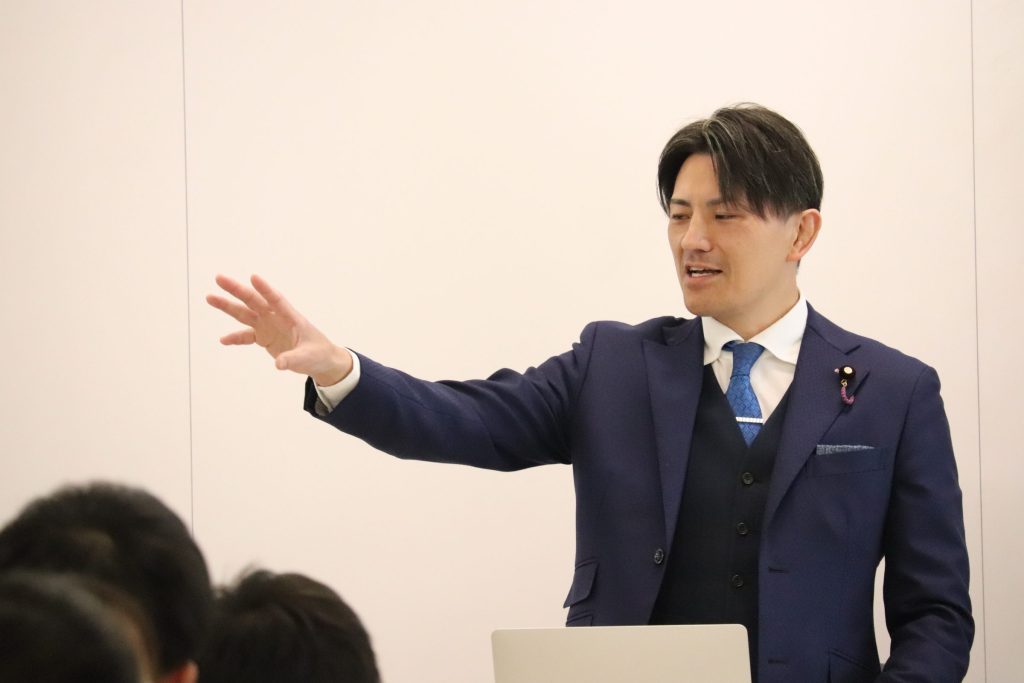 講師にお迎えした後藤翔太さんは、桐蔭学院高等学校ラグビー部で主将を務め全国ベスト8という結果を収め、早稲田大学進学後は二度の日本一を経験されました。社会人では神戸製鋼でプレーをされ、主将も務められました。引退後は追手門学院女子ラグビー部の創設と同時に監督に就任され、創部3年で高校、大学共に日本一となりました。現在は、参議院議員として活動されています。