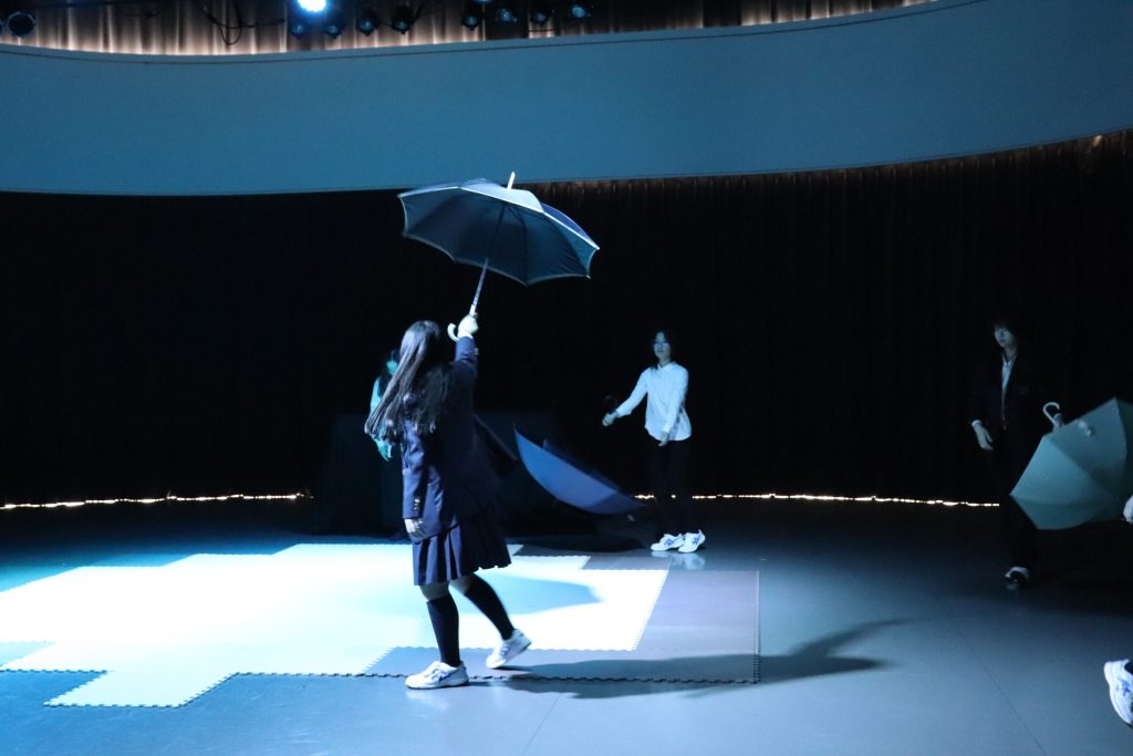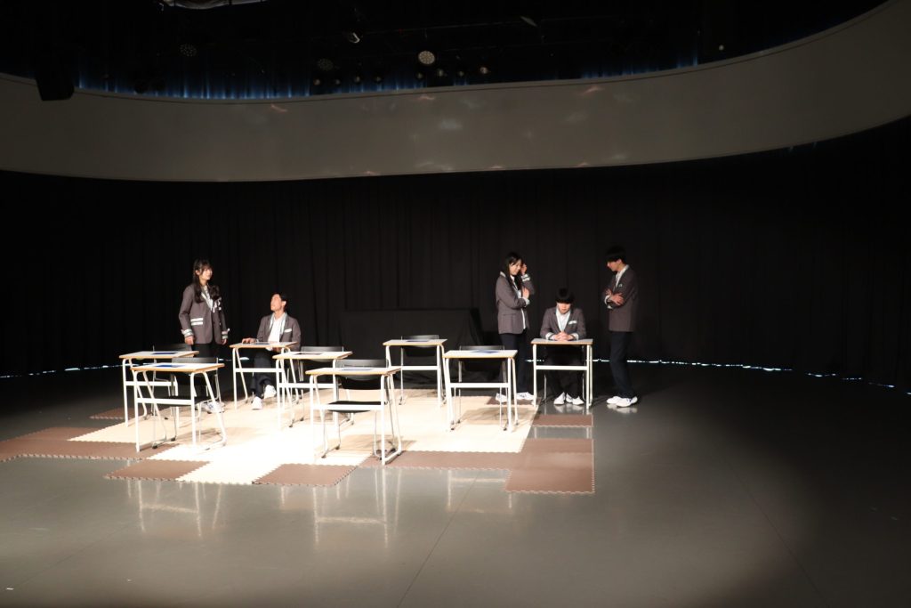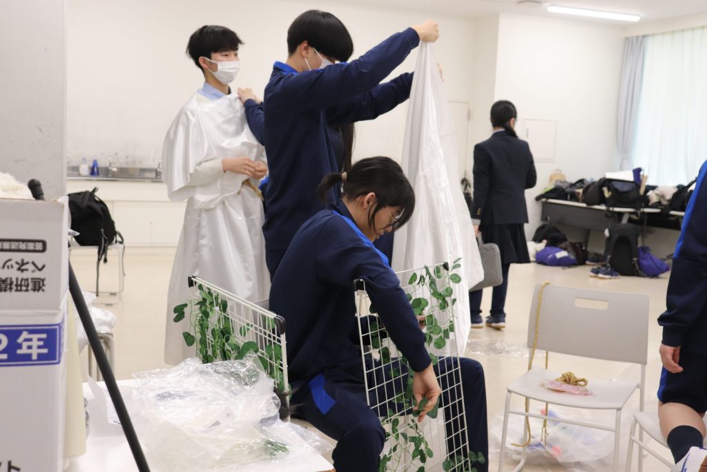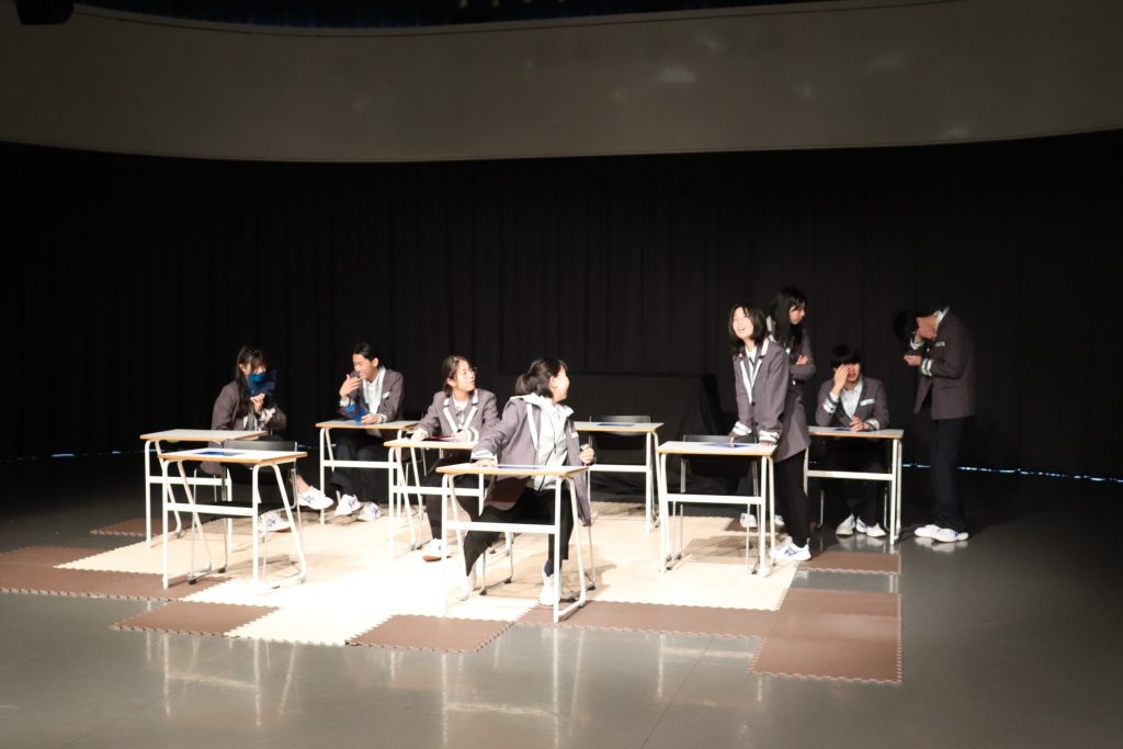 高2のテーマである「善」というキーワードをもとにクラス全員で準備を進めました。脚本から全て生徒たち自身で考え、3部構成での劇が完成しました。