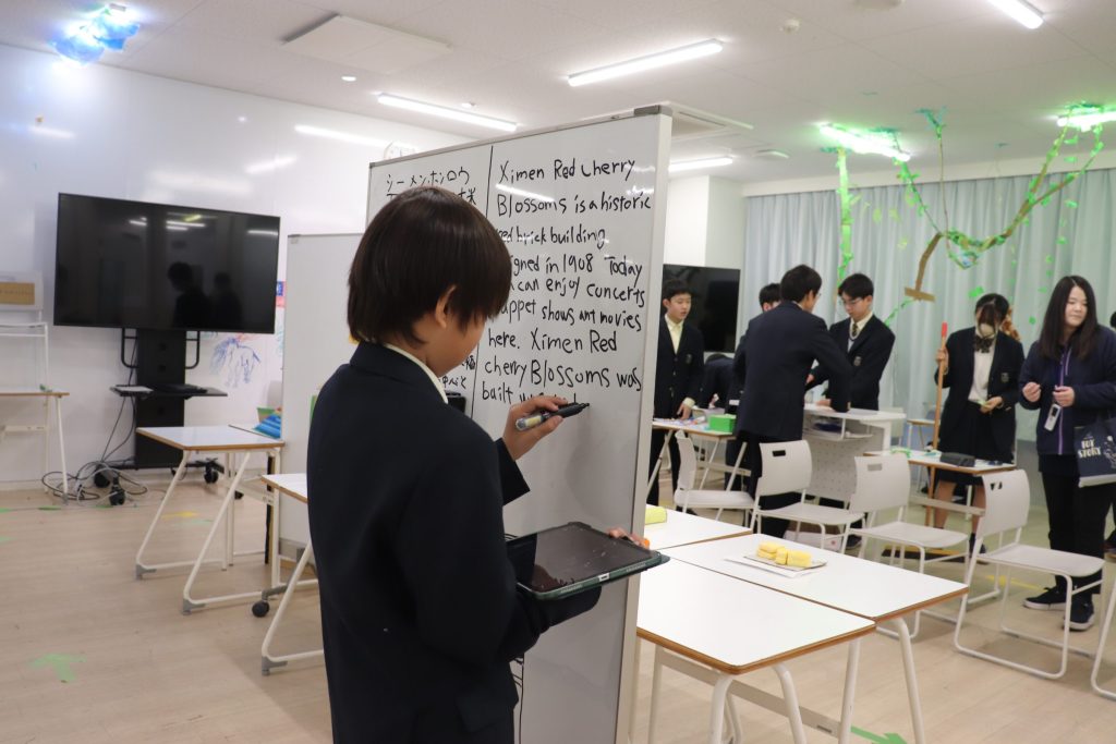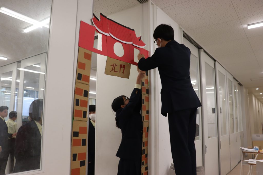 1学期から自分たちの修学旅行の行先を決めるために候補地について調べてきた59期中1。3学期期末プロジェクトでは、各地のパビリオンを制作しました。