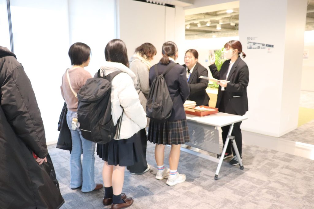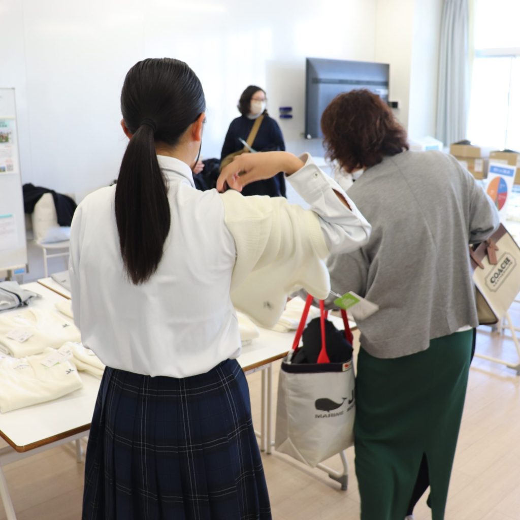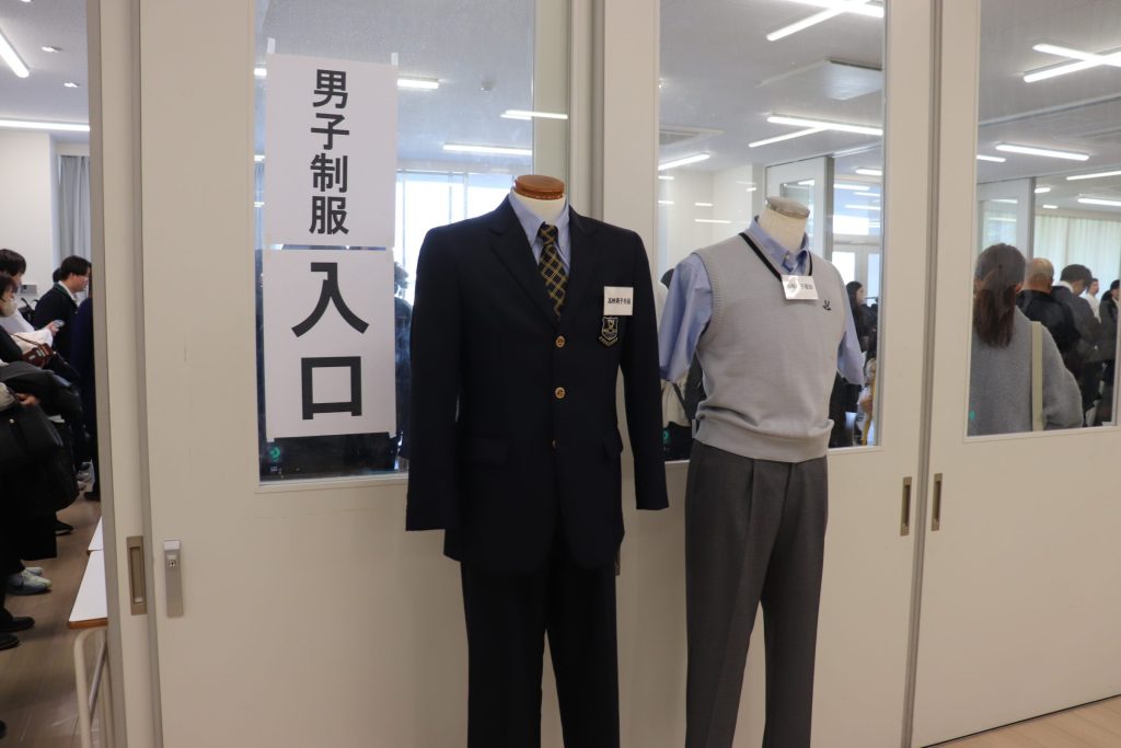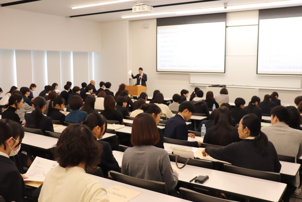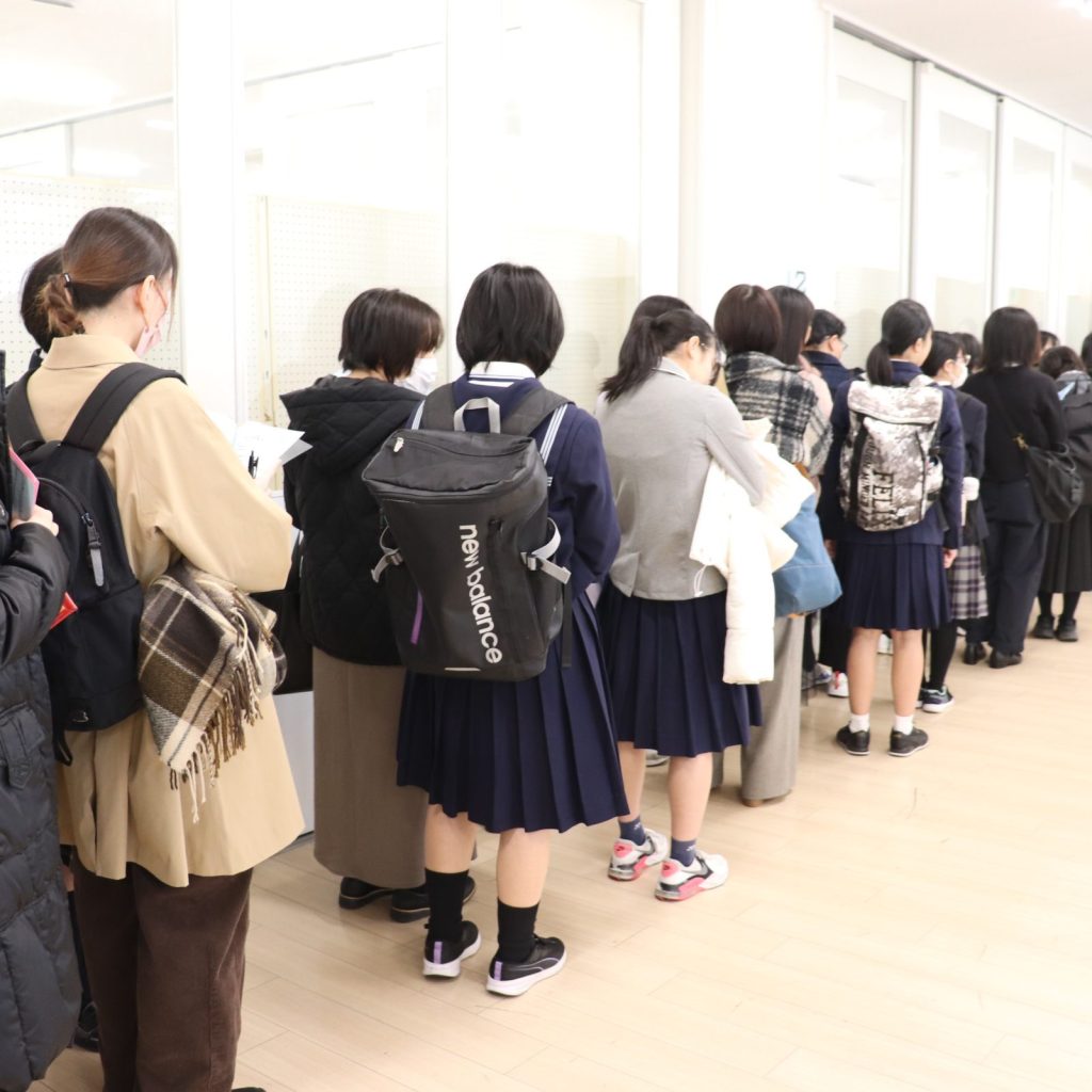 300名を超える入学予定者が参加し、まずは大学教室で書類説明を受けていただき、その後、中高校舎に移動し制服採寸を行いました。中高校舎では、イオンタウン茨木太田のコジマ×ビックカメラさんによるPCの出張販売会も行われ、多くの方がご覧になっていました。