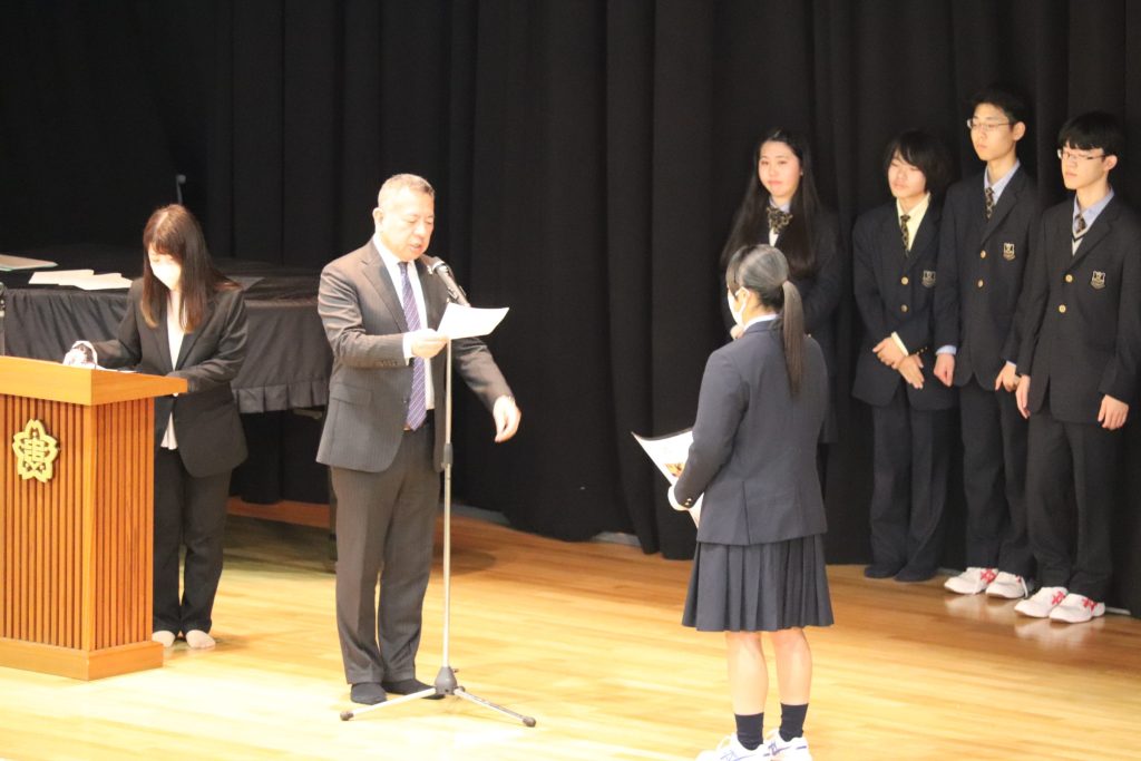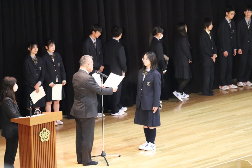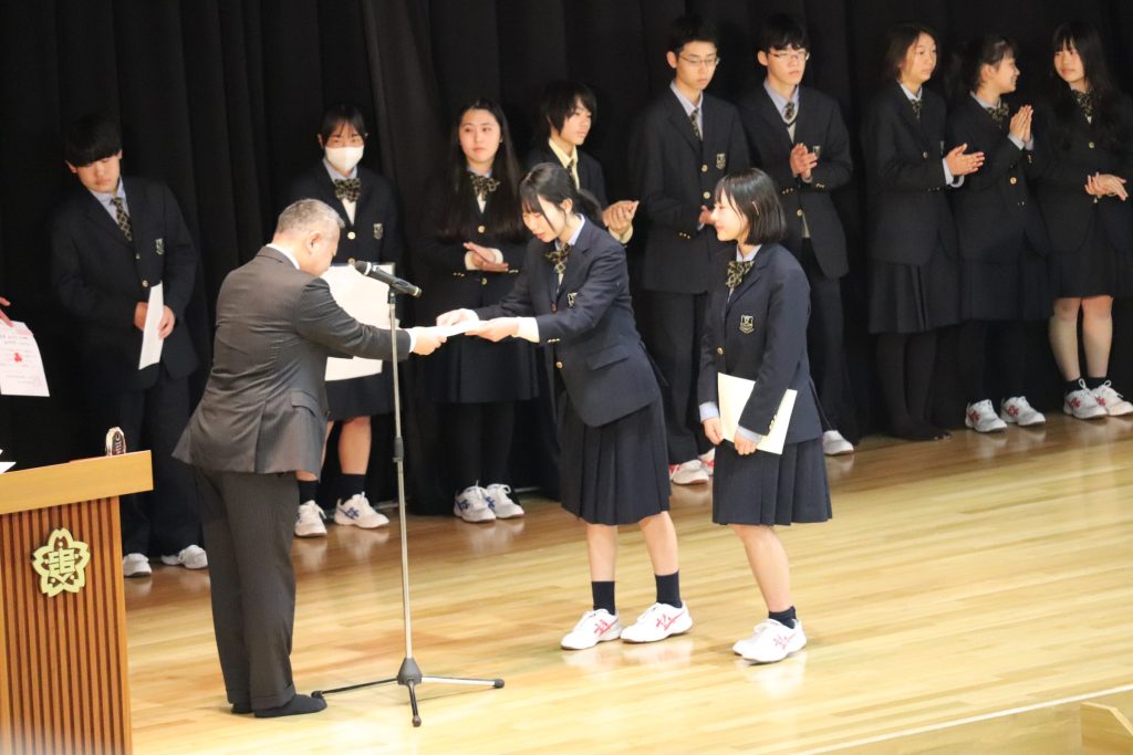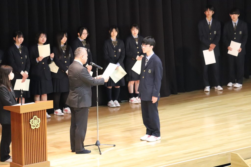 校長からの挨拶や3学期に部活動などで活躍した生徒の表彰を行いました。