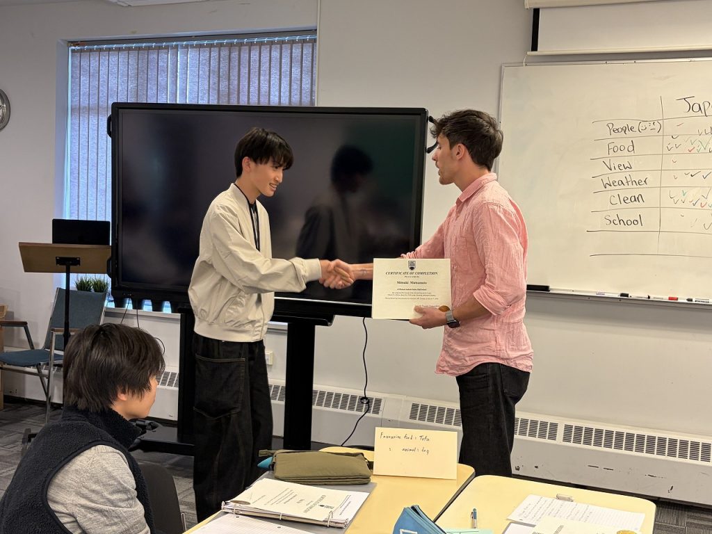 最後のレッスンでは一人ずつ英語でスピーチ。Nic先生から修了証明書をいただきました。夜は、バディとお別れパーティー。