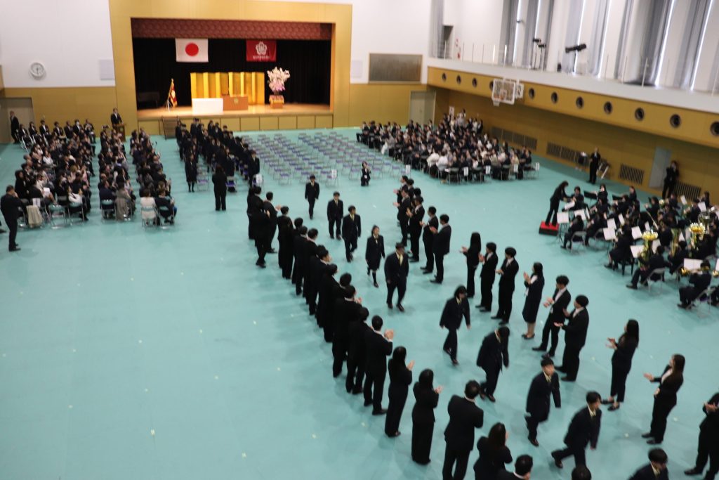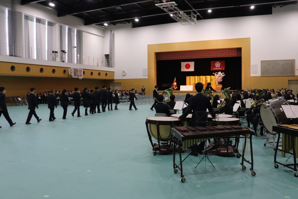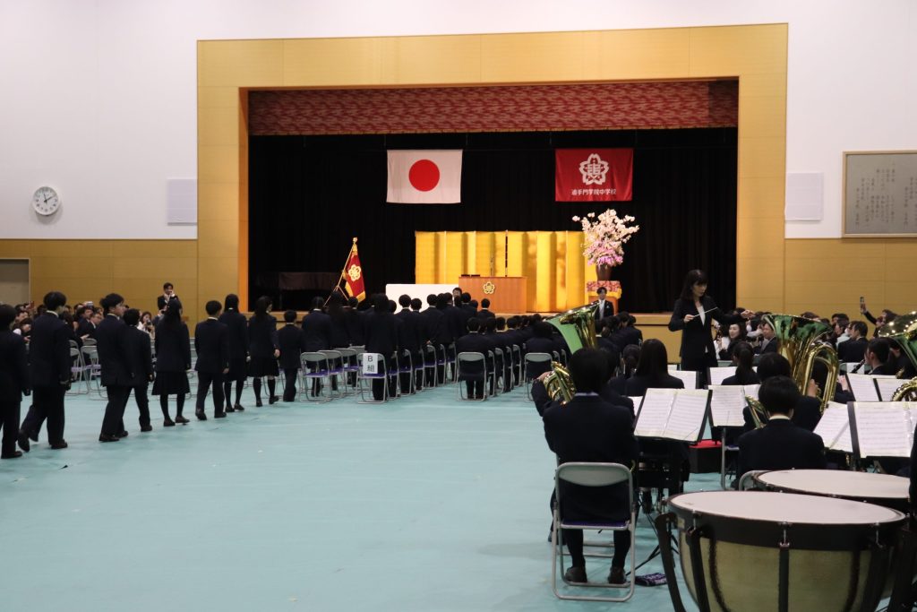 中学は、100名近い新入生を迎えました。吹奏楽部が演奏してくれる中、堂々と入場し追中生となった60期生。