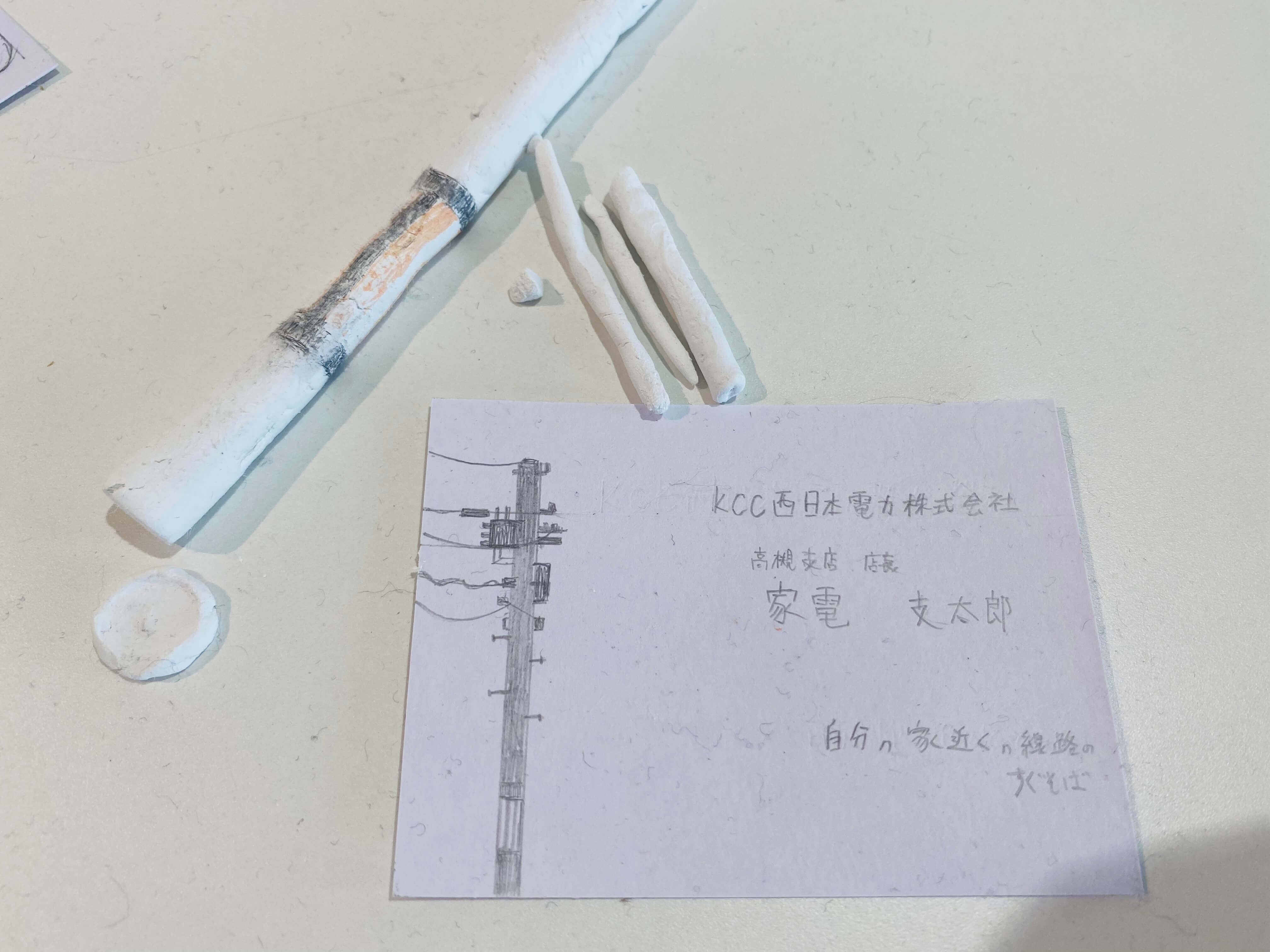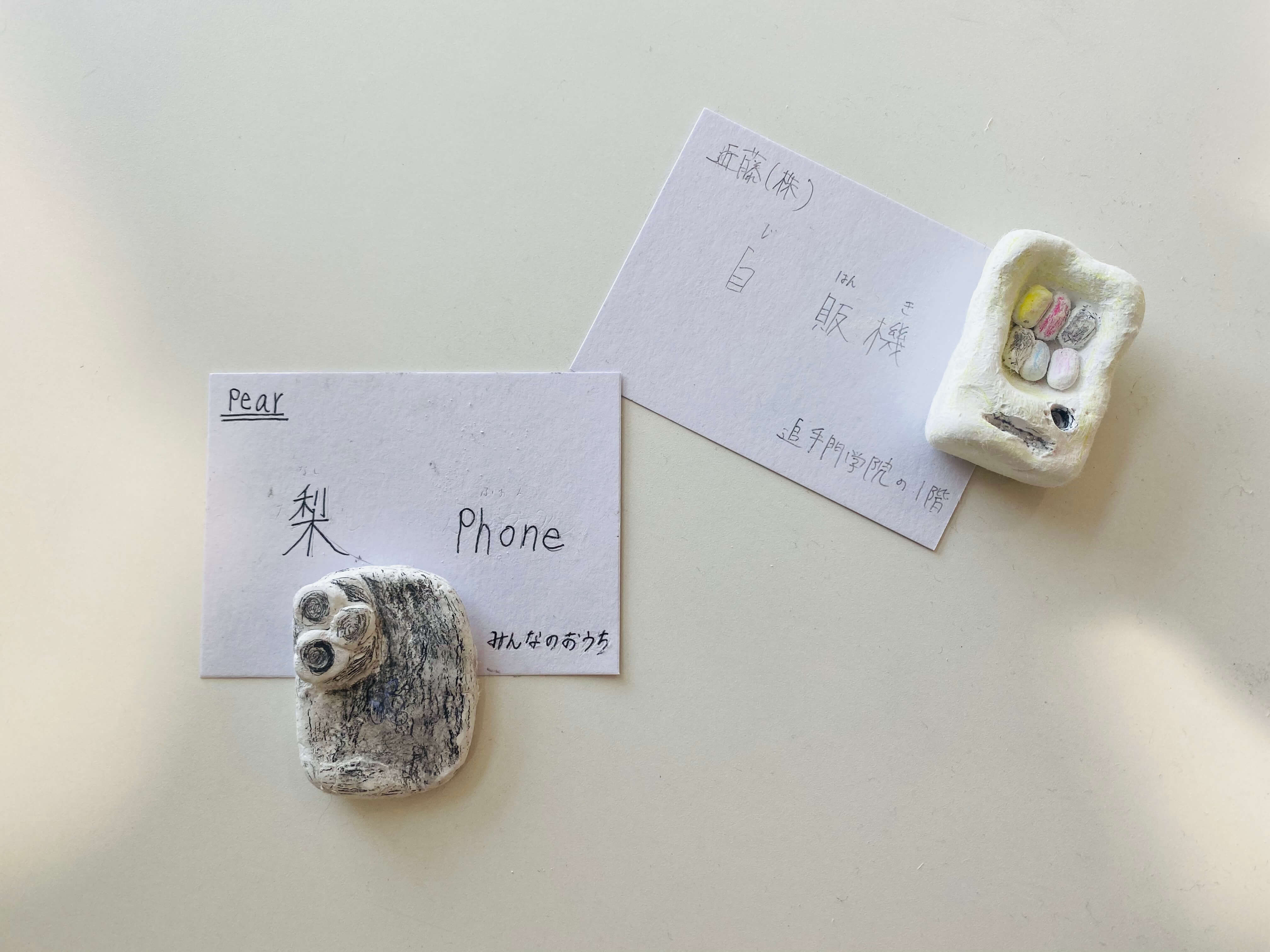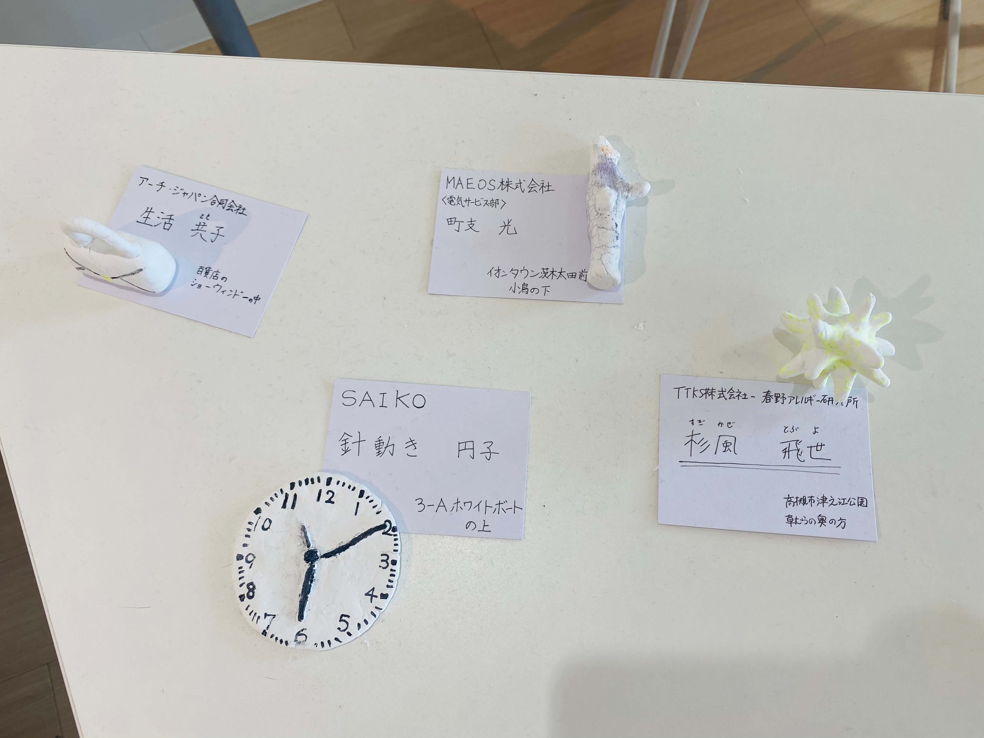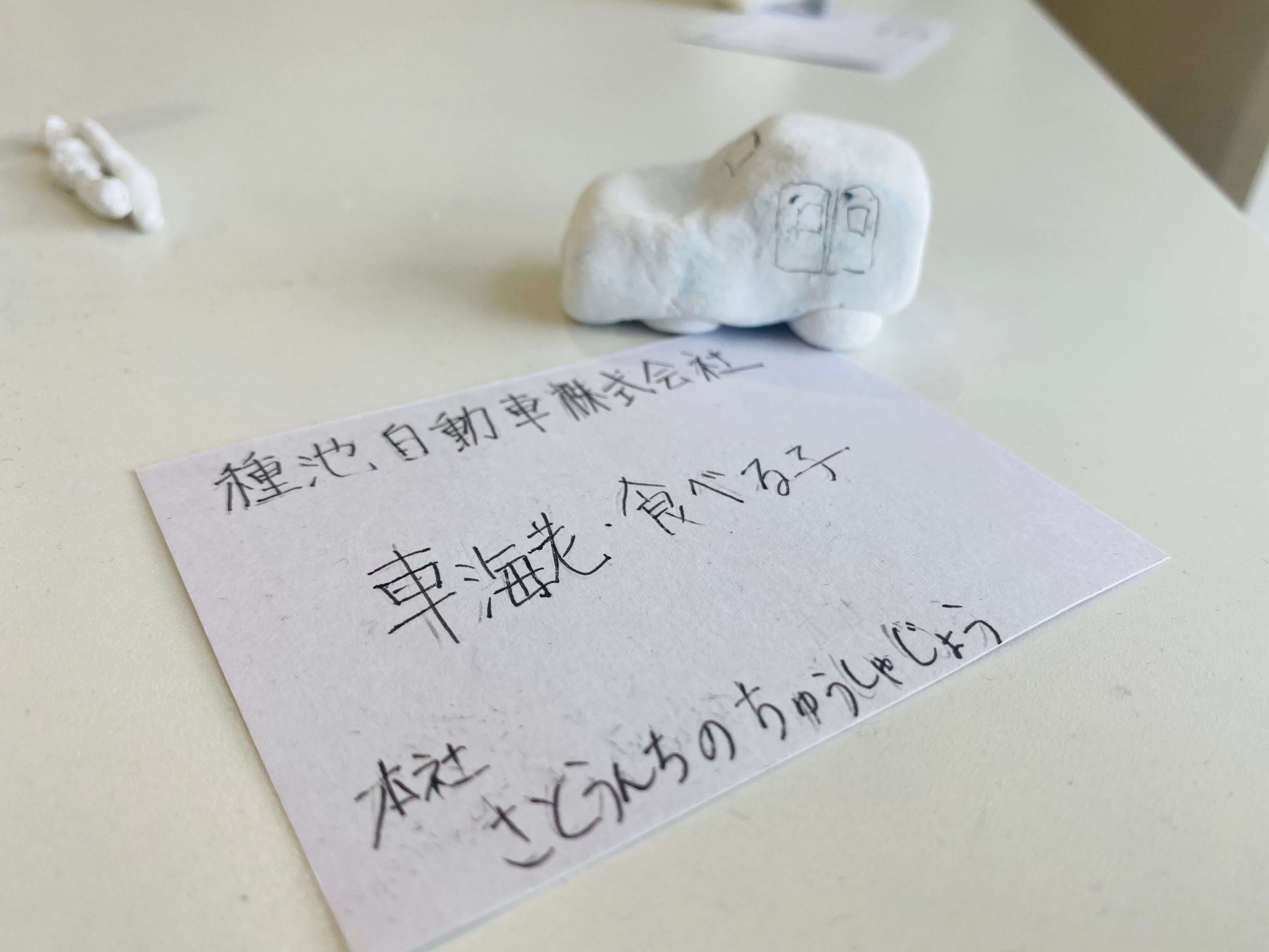 仕上げに名刺を作りました。オリジナル会社名、名前、住所(そのモノがある場所)。想像から始まったモノを創造する頃には、シンプルには言い表すことができない情報が詰まったモノに変身する不思議な体験でした。