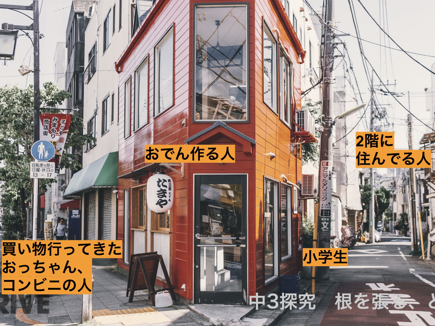 - その中にある建物や標識などをじっくり観察して、それを作った人などを考える。考えついた想像からさらに連想される物をと、網状につなげていったこと。