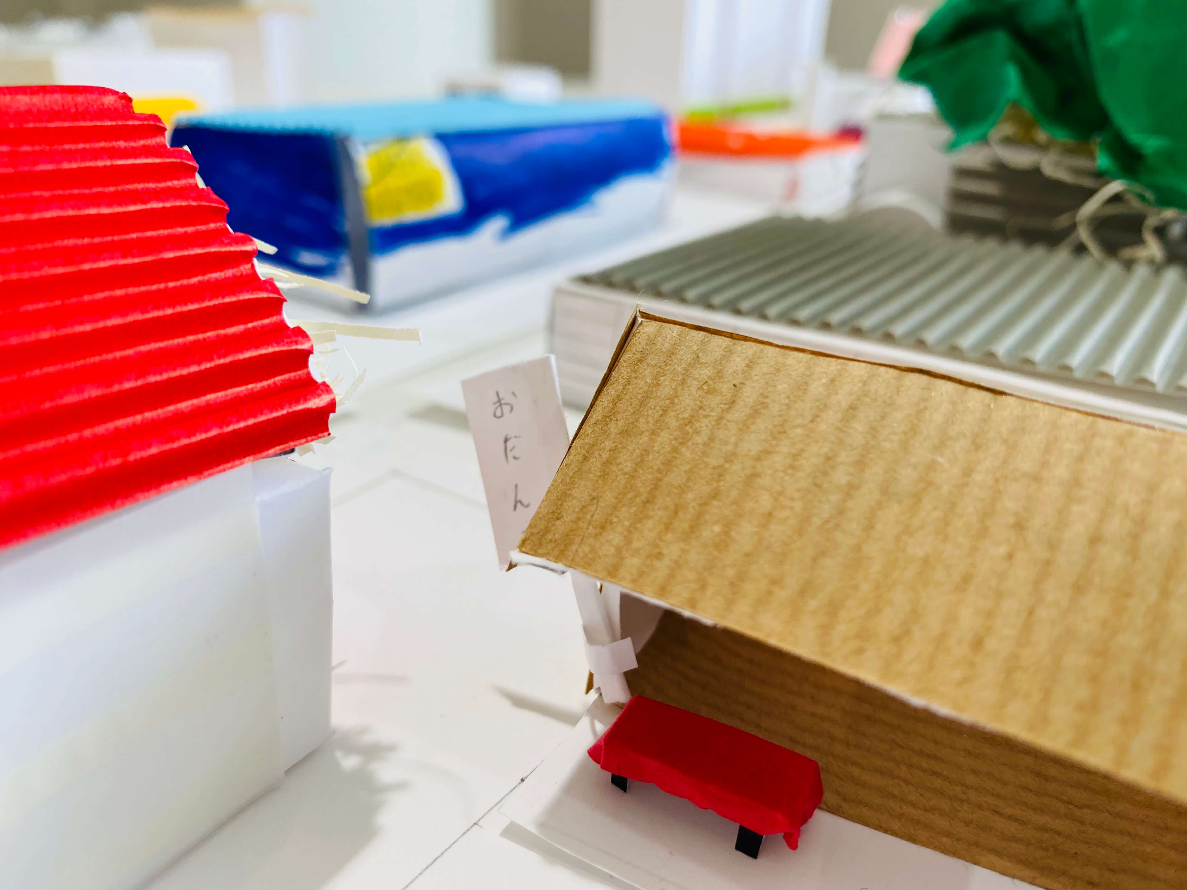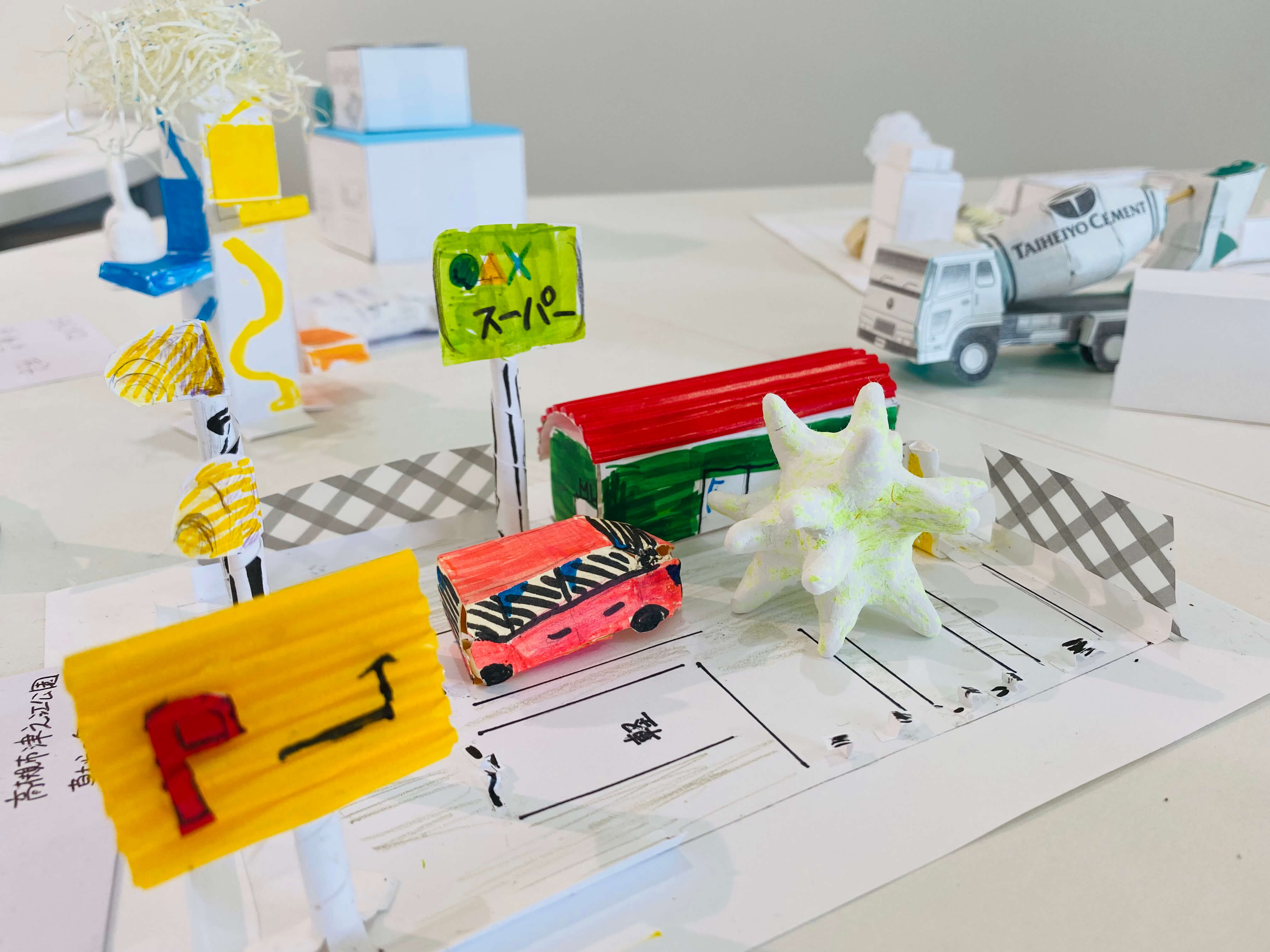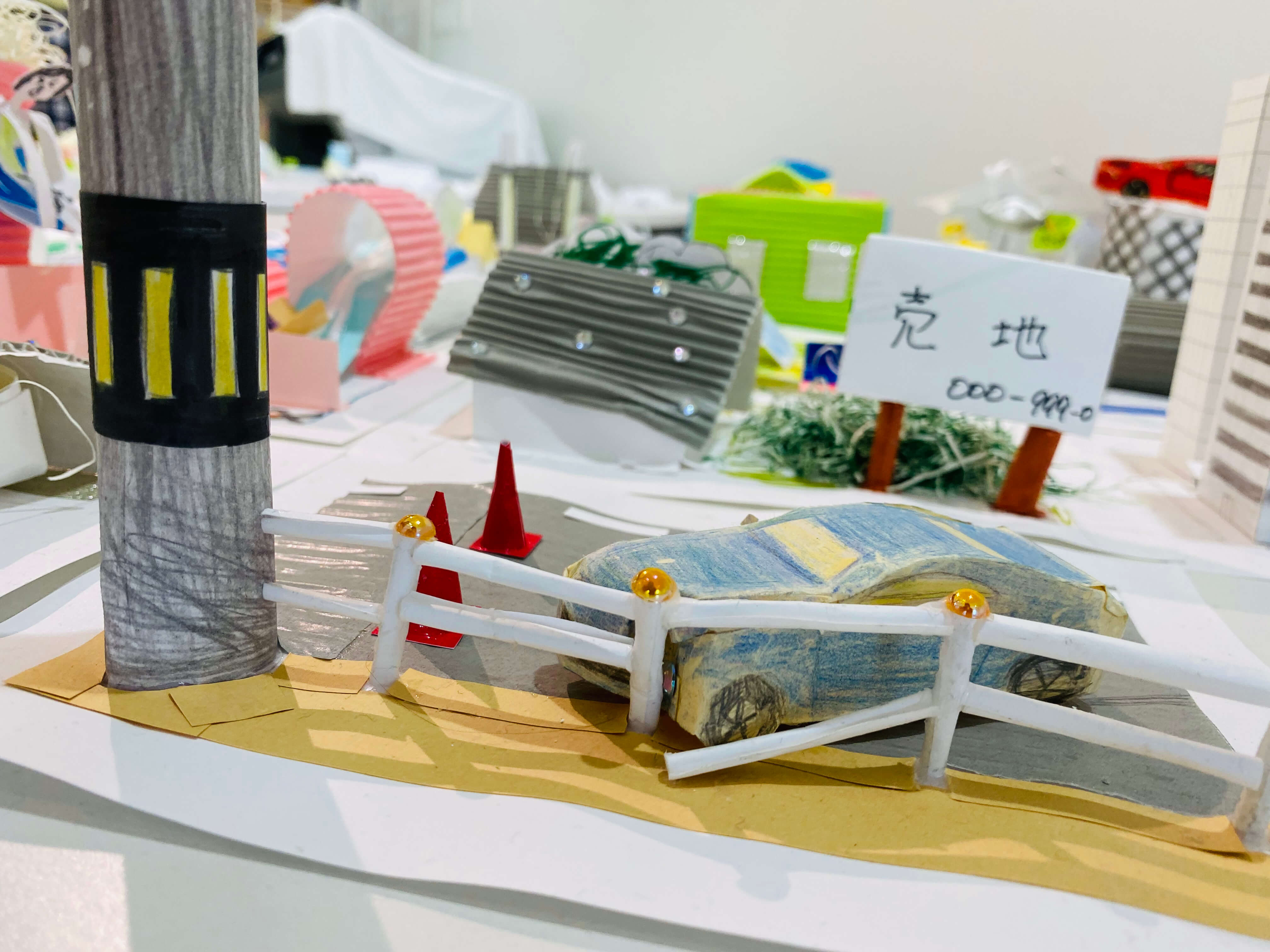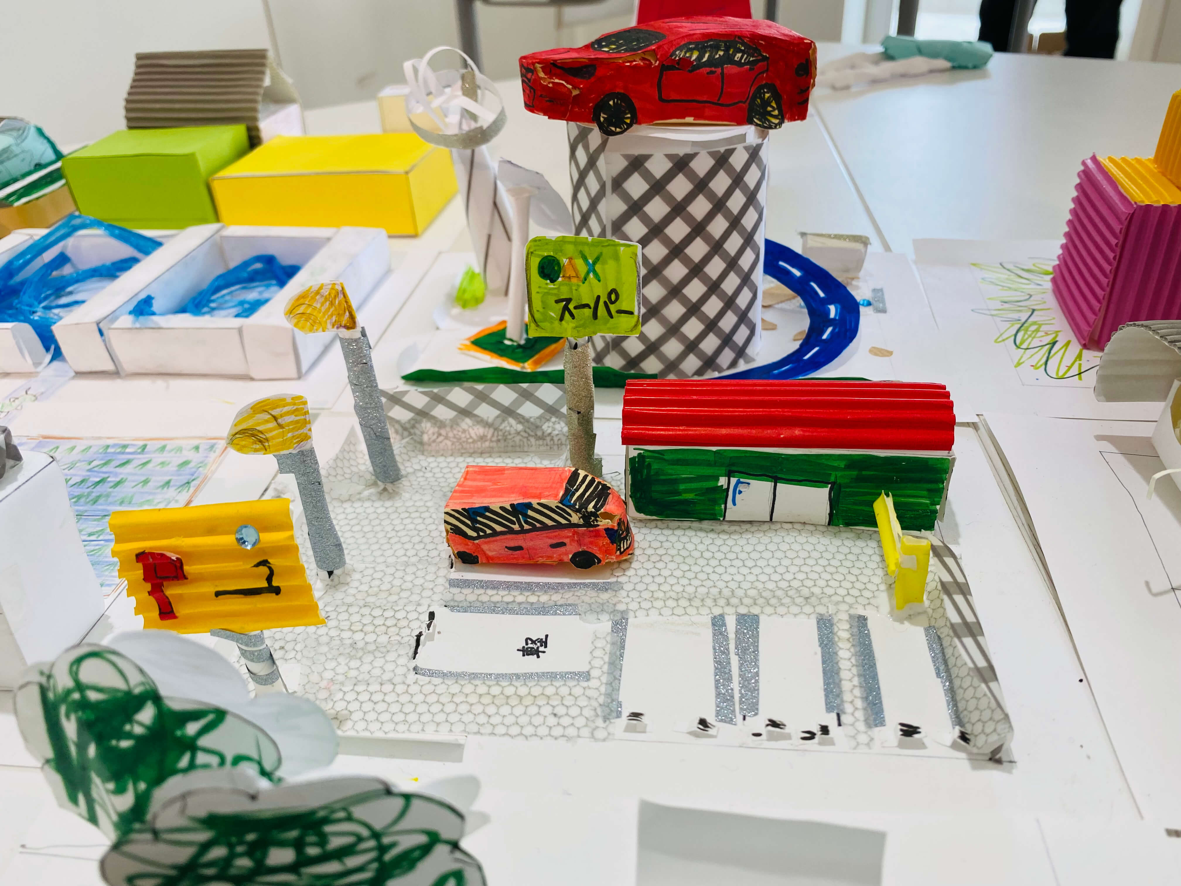 まちにあるものをブレストするところから始め、自分だけの小さなまちに入れたいものだけをピックアップ。今回はミニチュア版「自分のまち」を紙でデザインします。家だったり、車だったり。観覧車、公園、田んぼ、駐車場笑。これまで何となく感じた自分の役割や、自分に働かせることができる想像力。ちょっとでもいいから生かしながら考えてくれているといいなー。