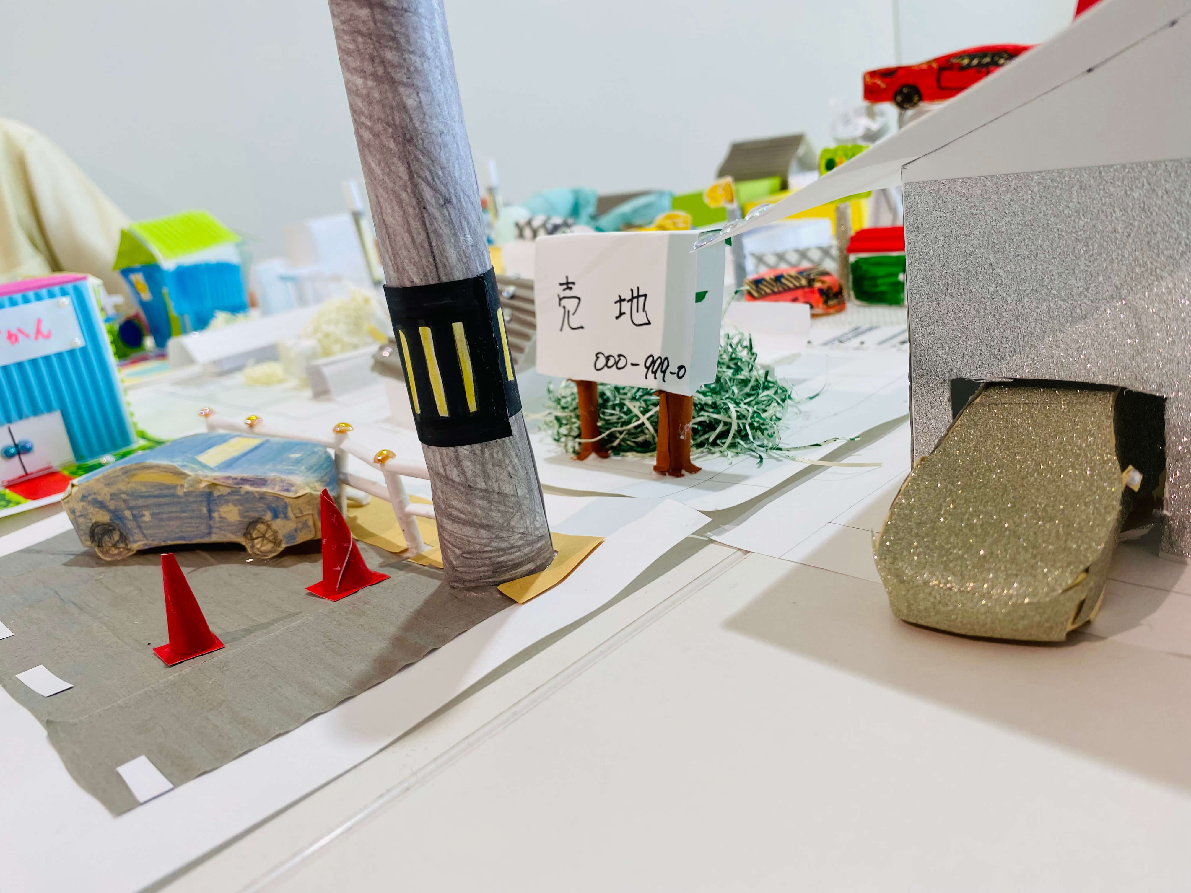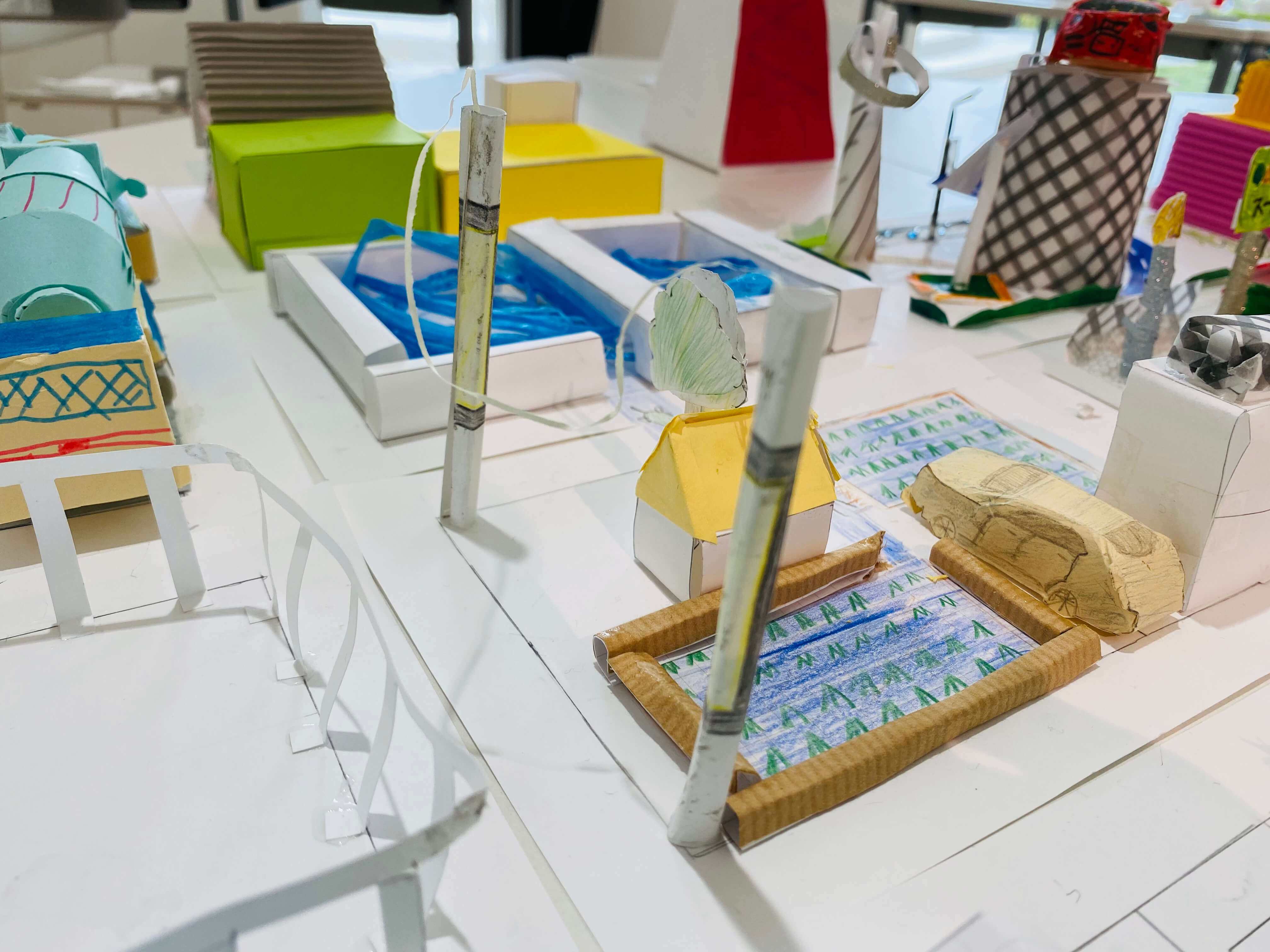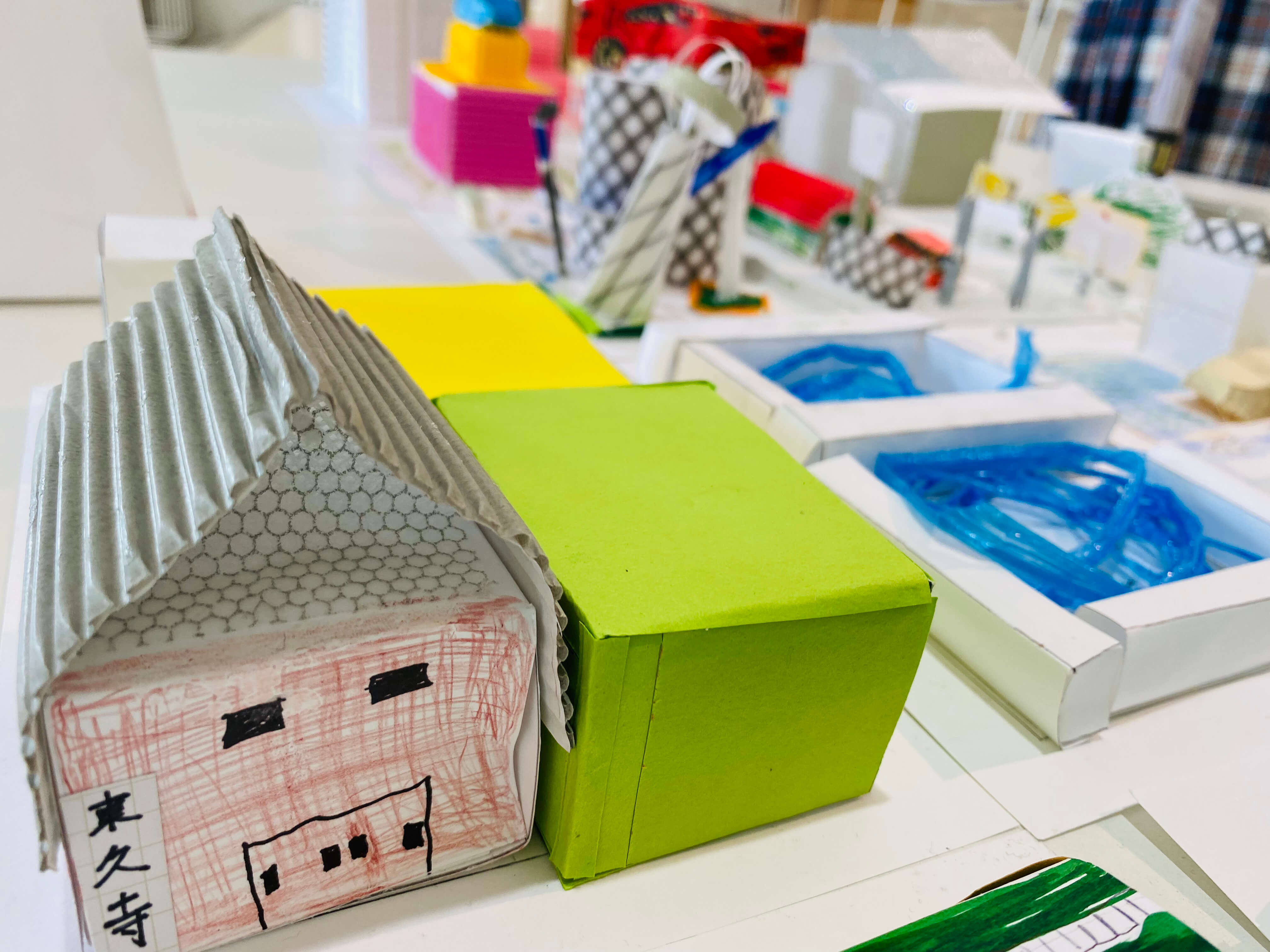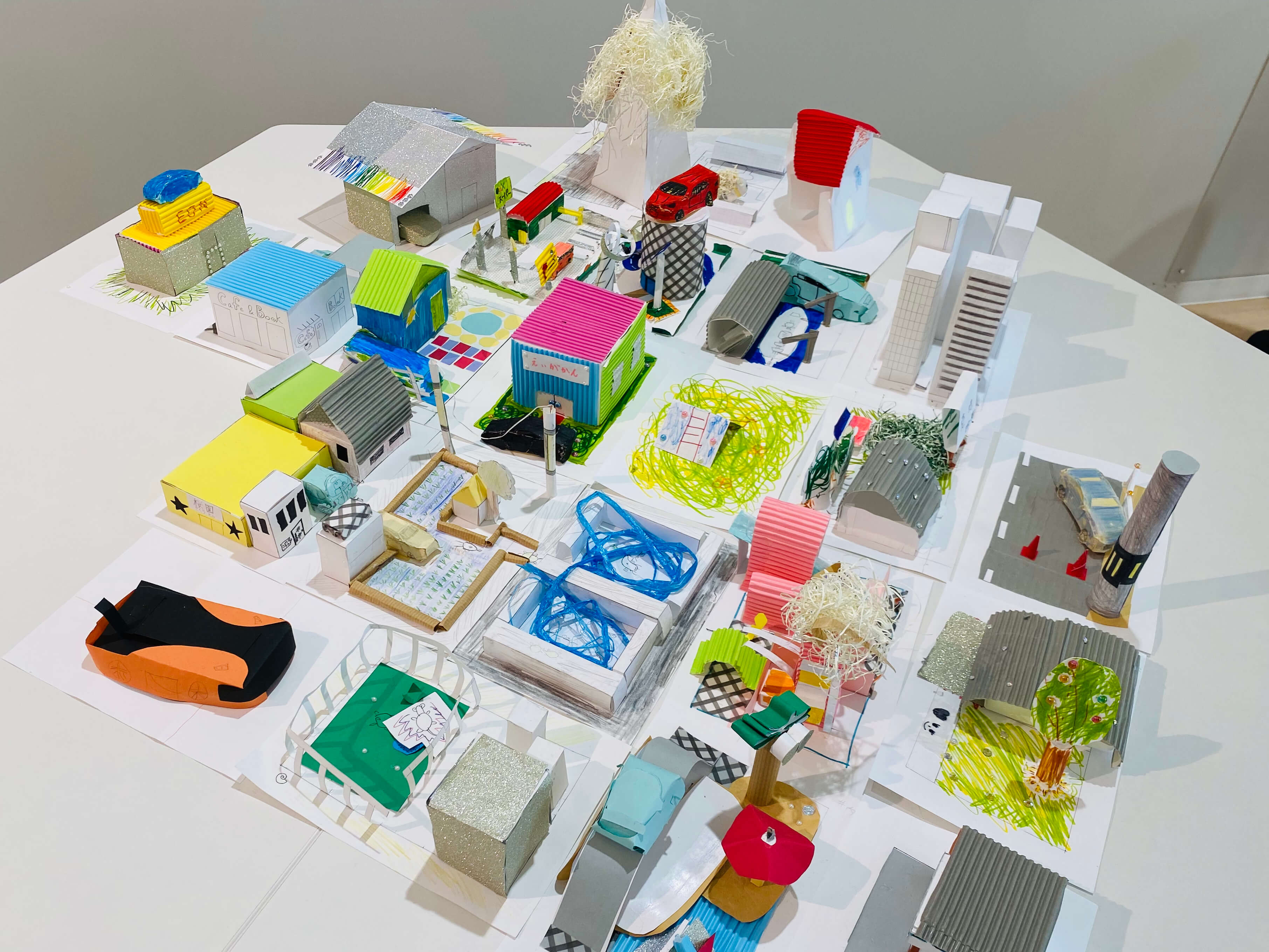 まちにあるものをブレストするところから始め、自分だけの小さなまちに入れたいものだけをピックアップ。今回はミニチュア版「自分のまち」を紙でデザインします。家だったり、車だったり。観覧車、公園、田んぼ、駐車場笑。これまで何となく感じた自分の役割や、自分に働かせることができる想像力。ちょっとでもいいから生かしながら考えてくれているといいなー。
