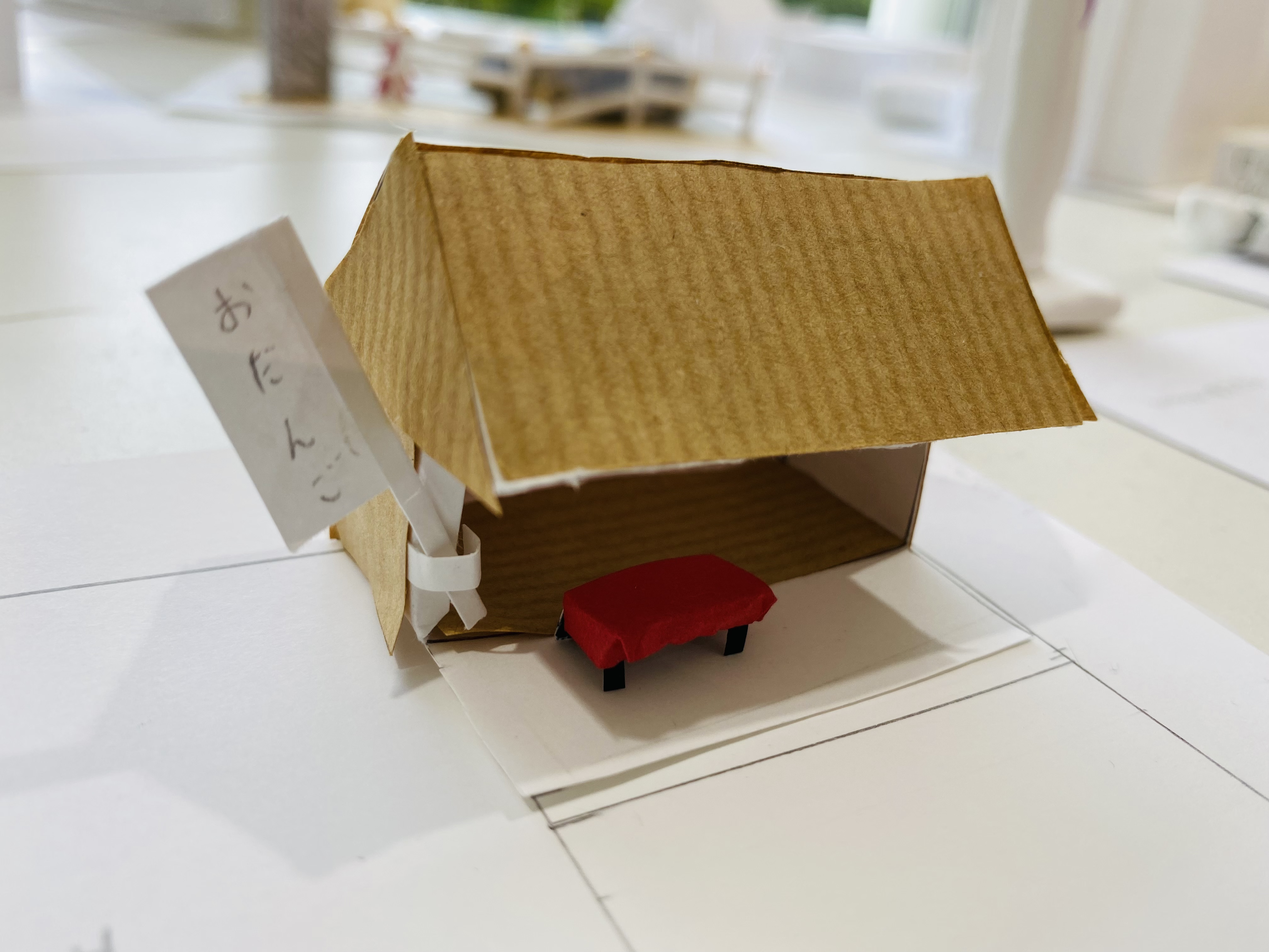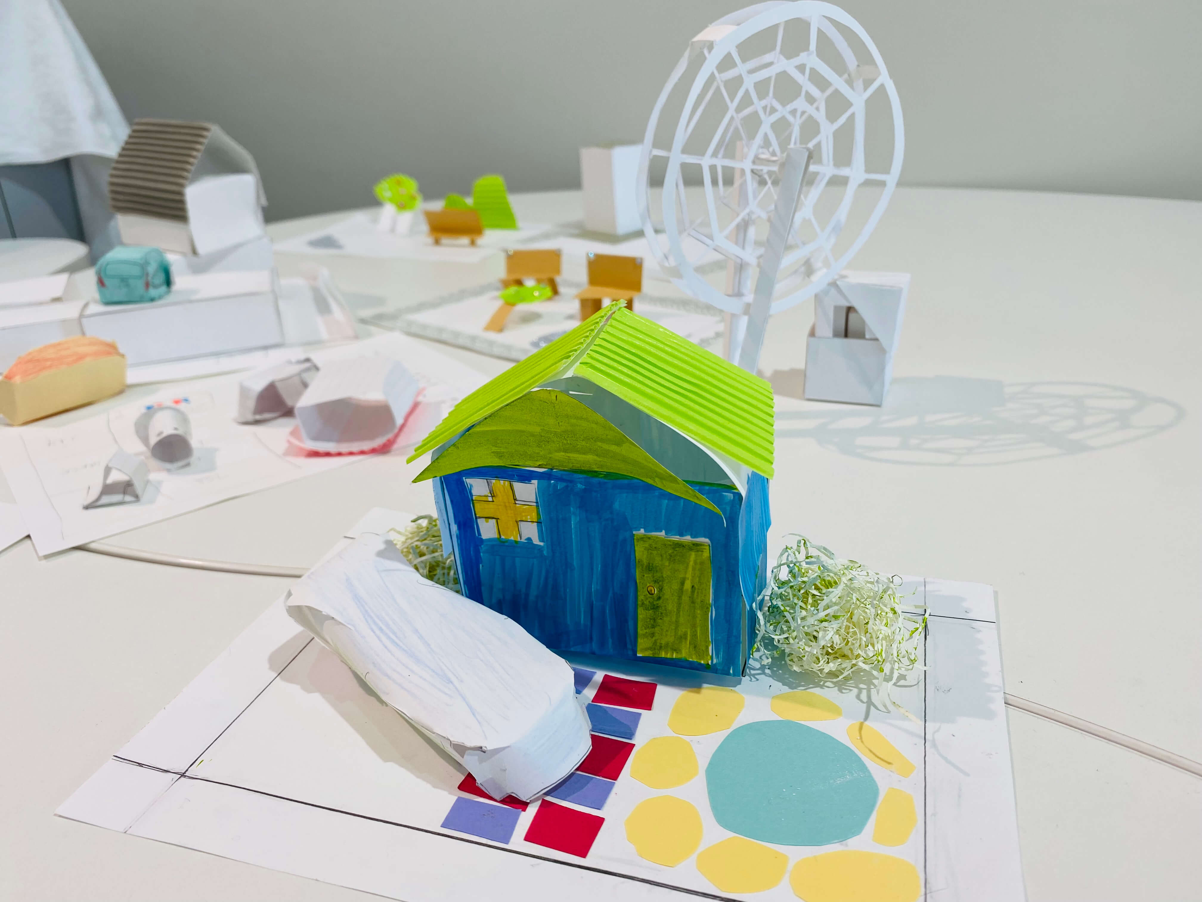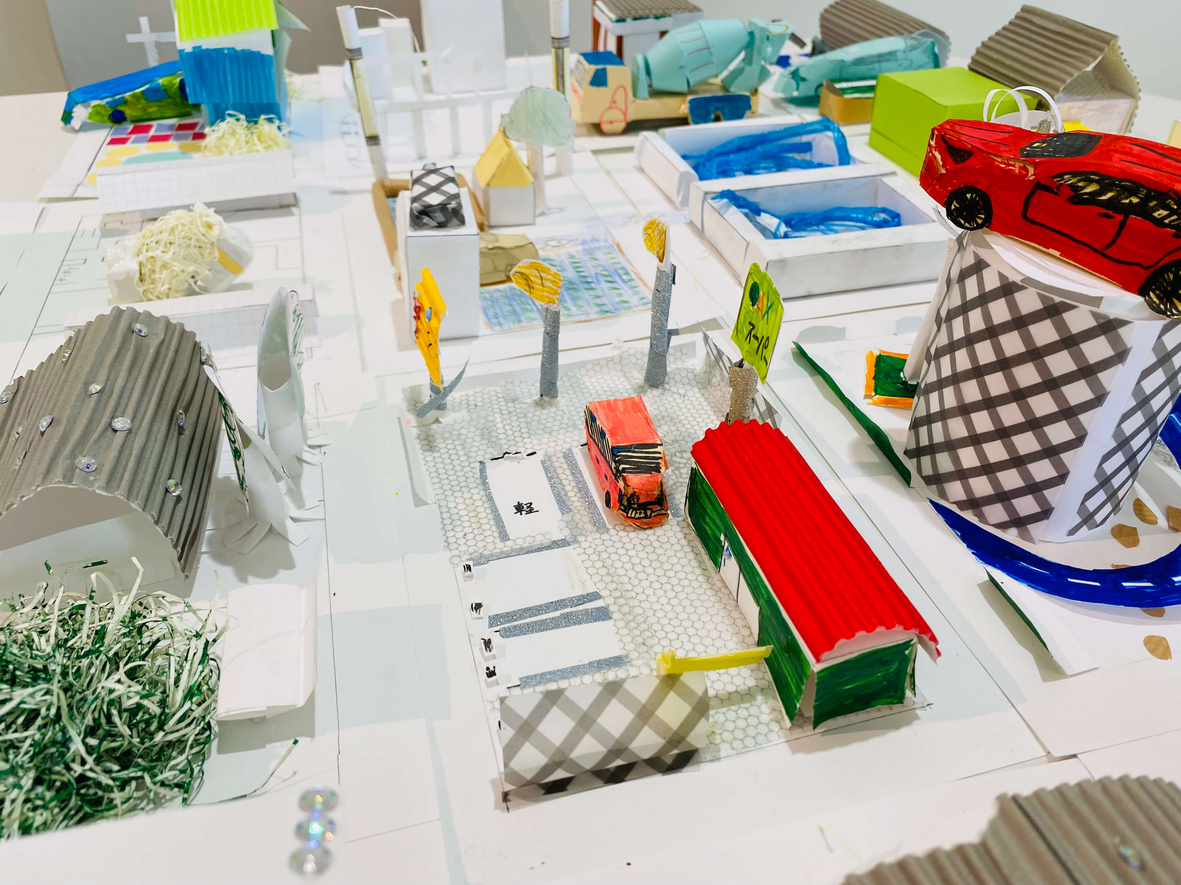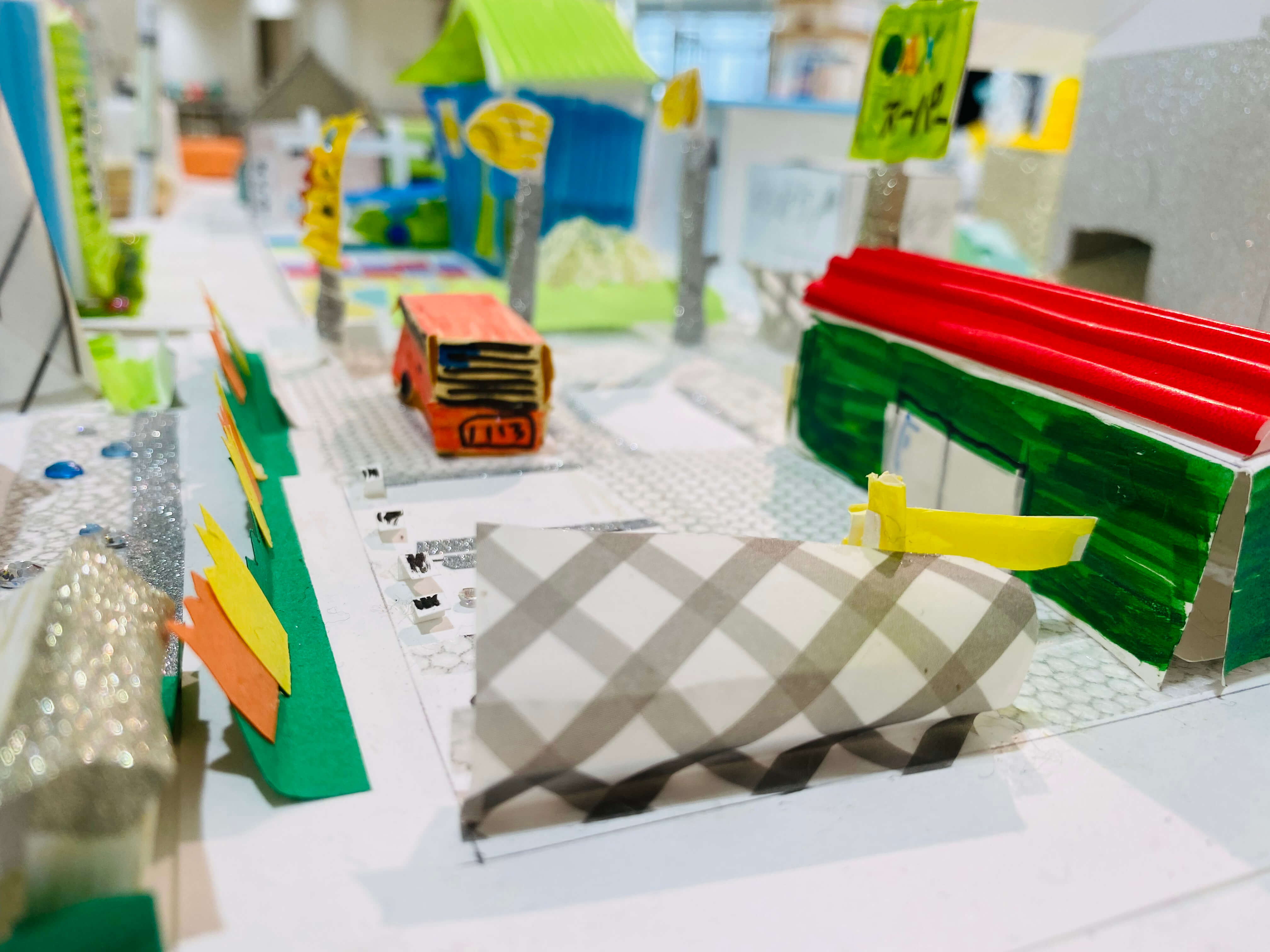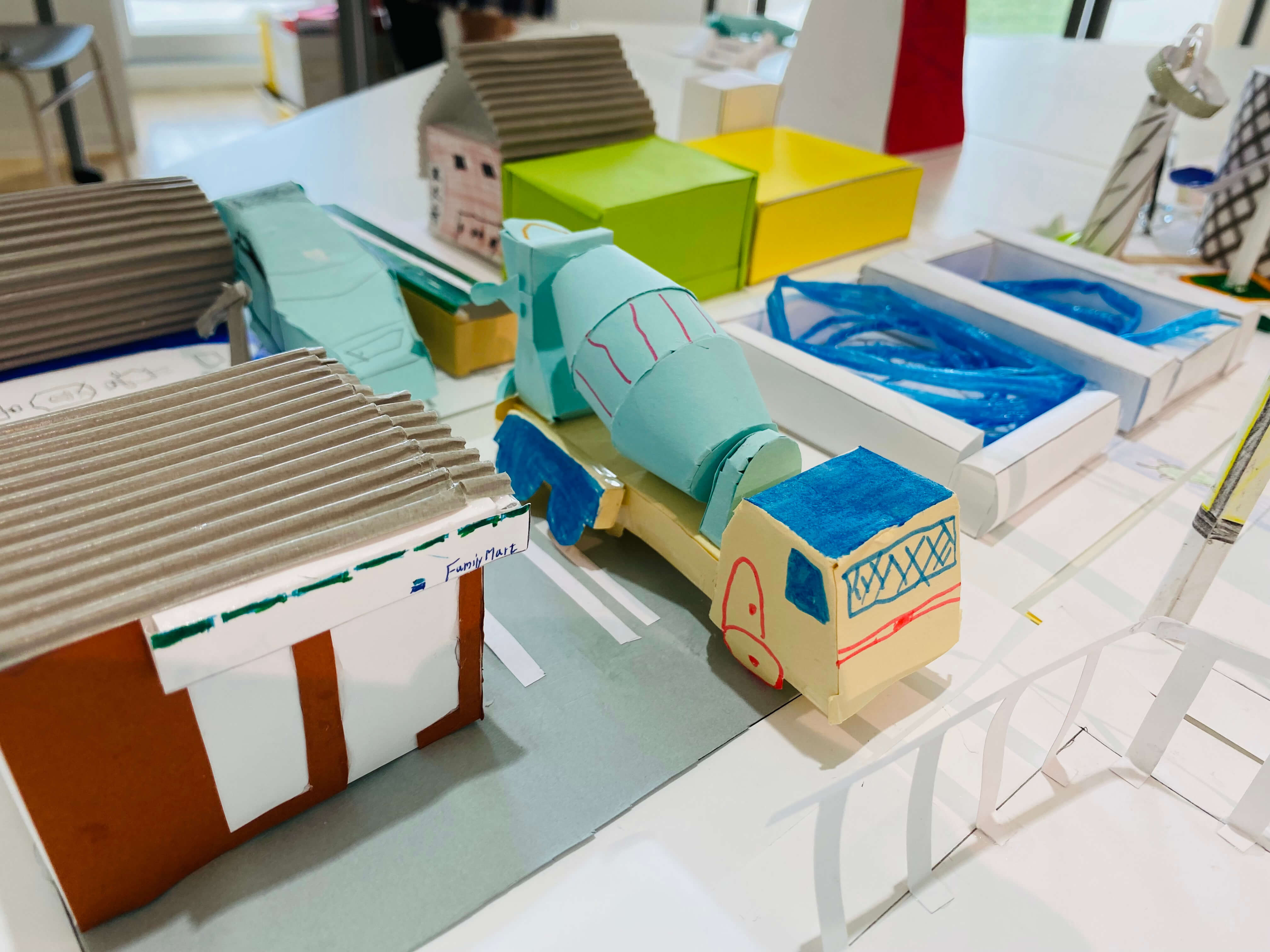 まちにあるものをブレストするところから始め、自分だけの小さなまちに入れたいものだけをピックアップ。今回はミニチュア版「自分のまち」を紙でデザインします。家だったり、車だったり。観覧車、公園、田んぼ、駐車場笑。これまで何となく感じた自分の役割や、自分に働かせることができる想像力。ちょっとでもいいから生かしながら考えてくれているといいなー。