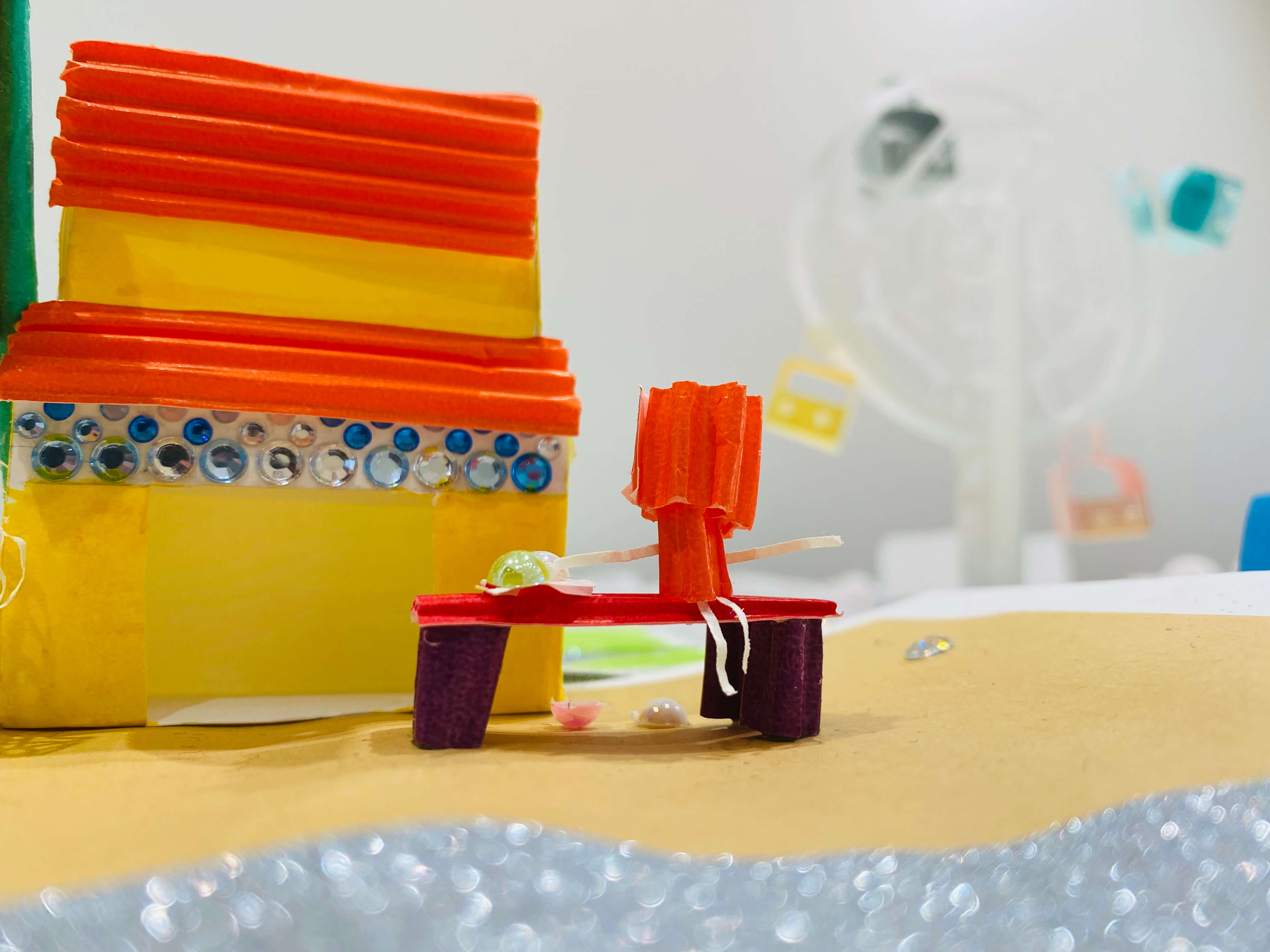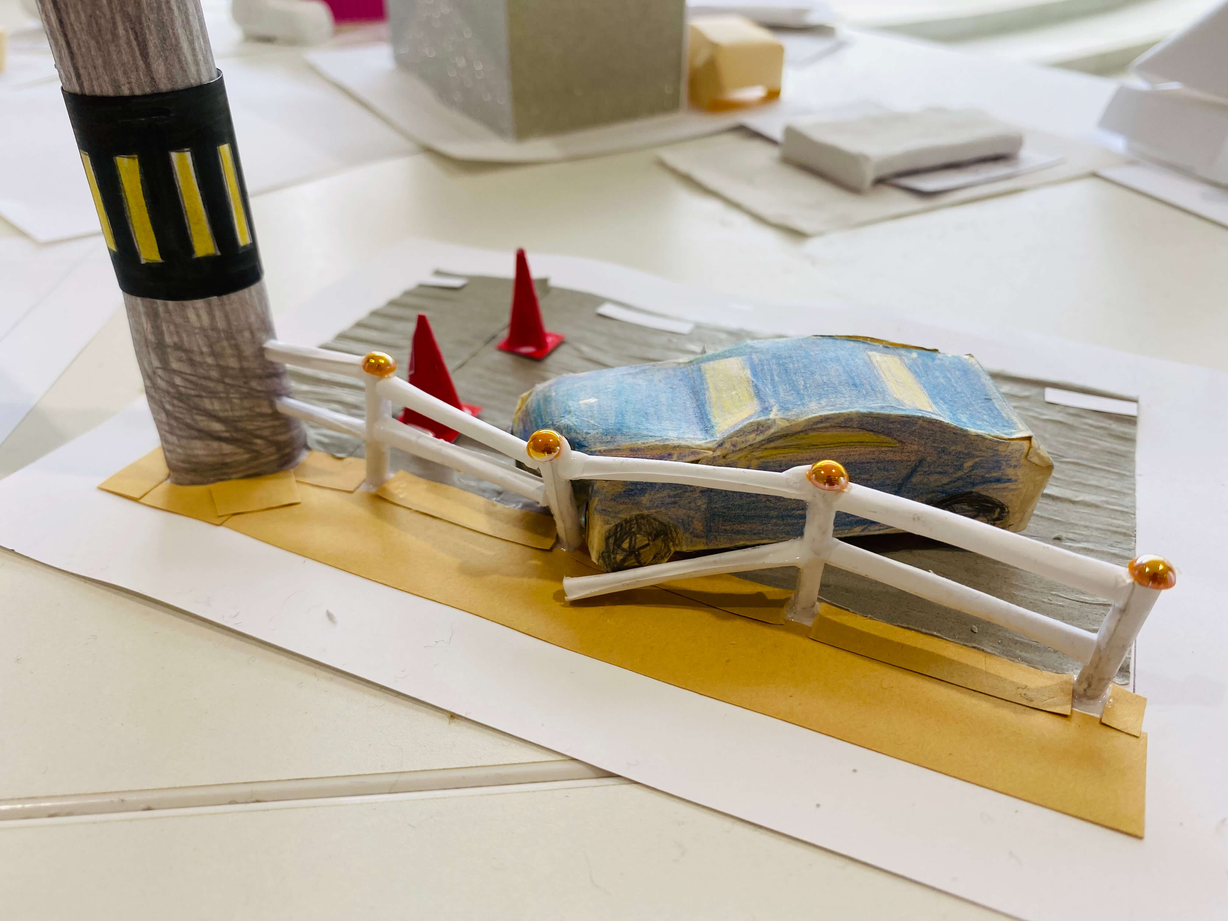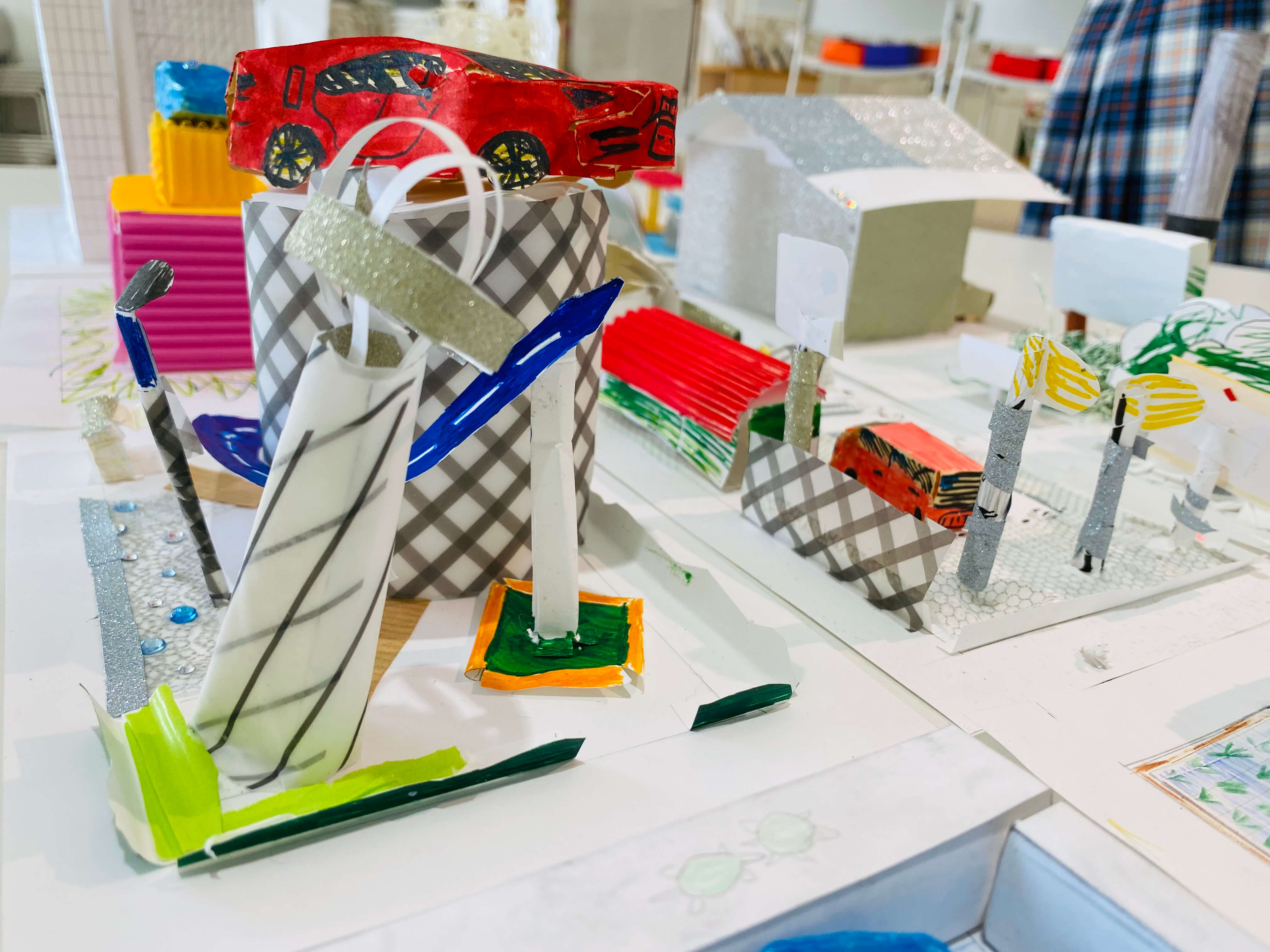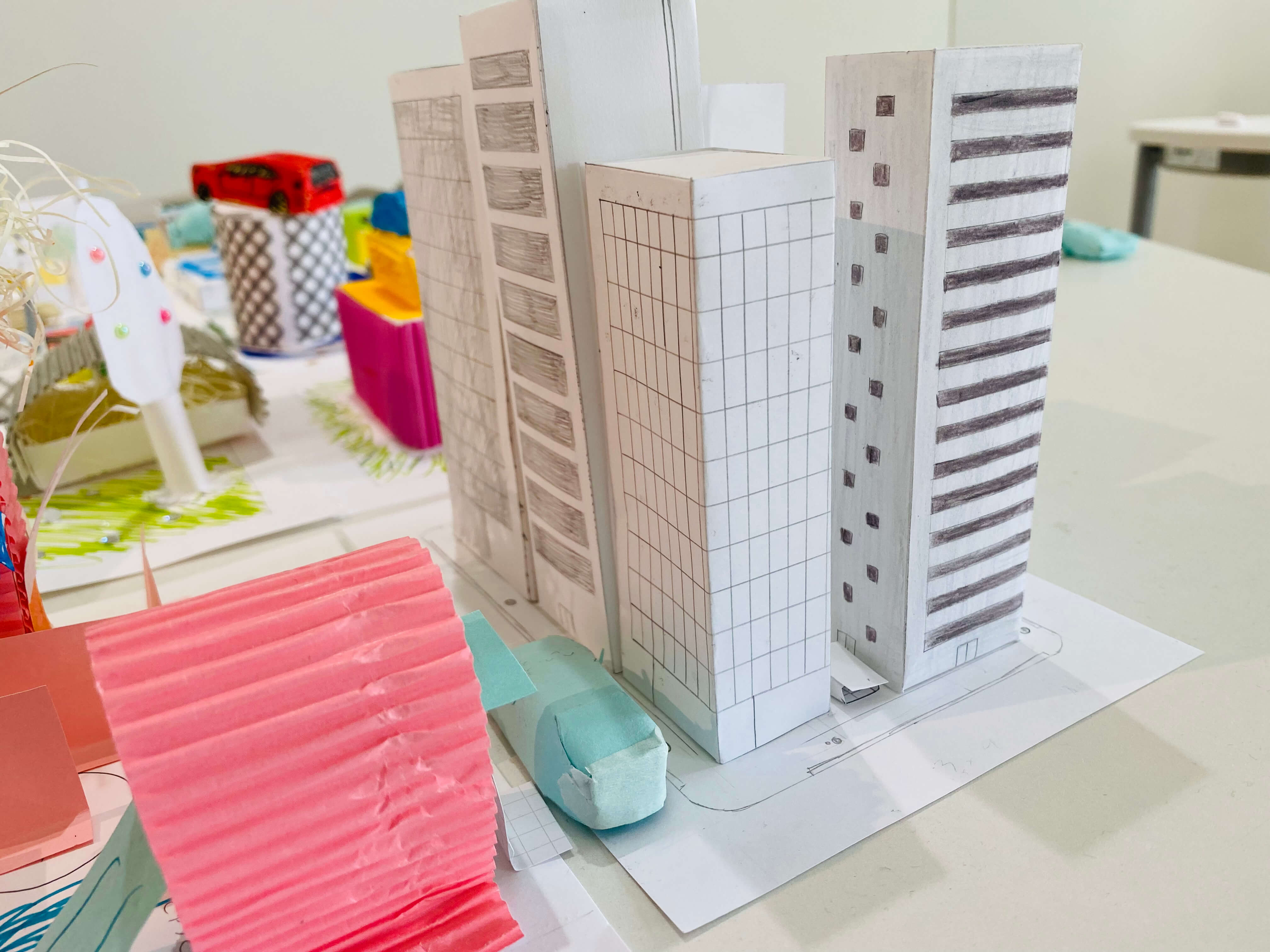 まちにあるものをブレストするところから始め、自分だけの小さなまちに入れたいものだけをピックアップ。今回はミニチュア版「自分のまち」を紙でデザインします。家だったり、車だったり。観覧車、公園、田んぼ、駐車場笑。これまで何となく感じた自分の役割や、自分に働かせることができる想像力。ちょっとでもいいから生かしながら考えてくれているといいなー。