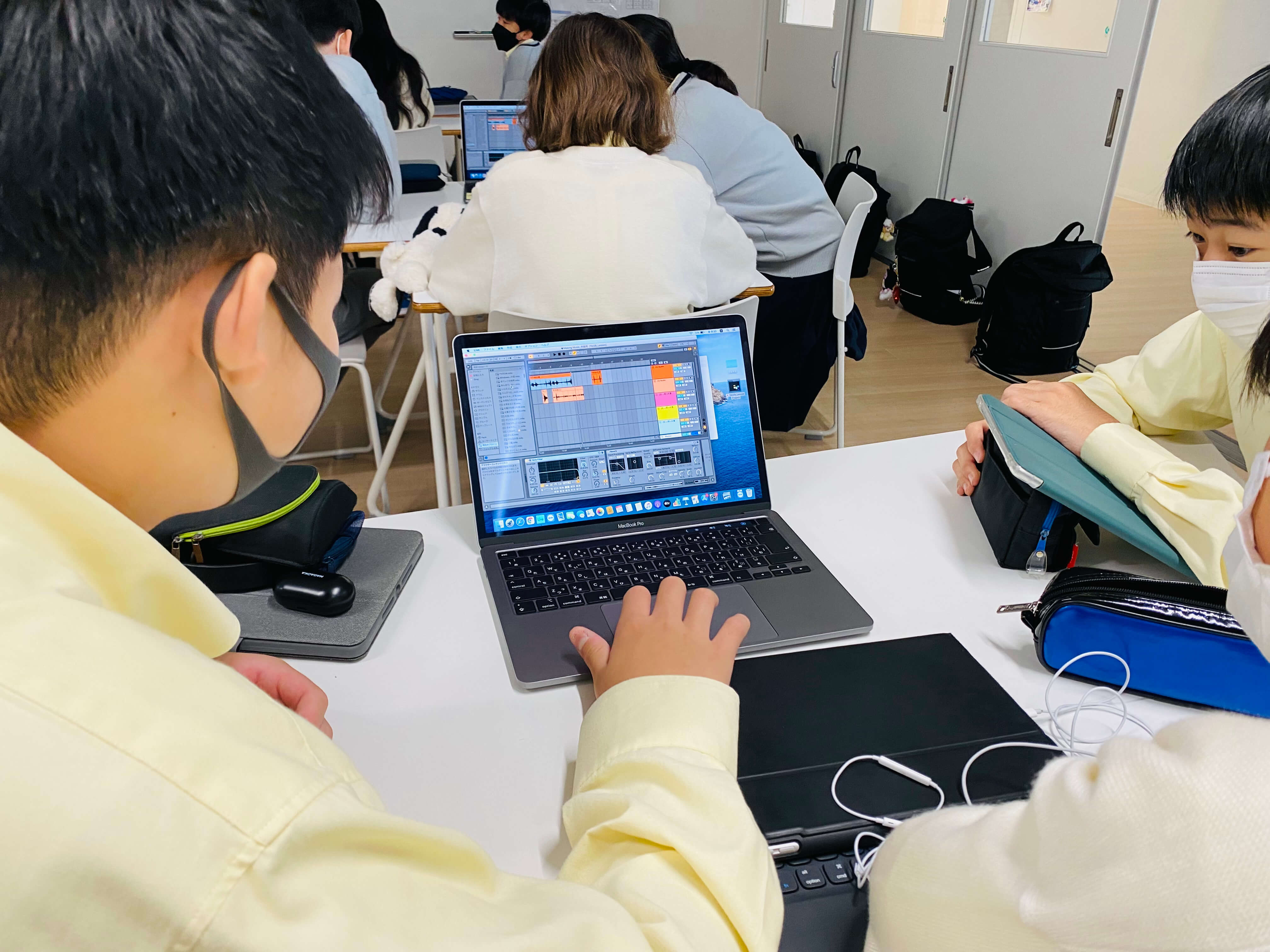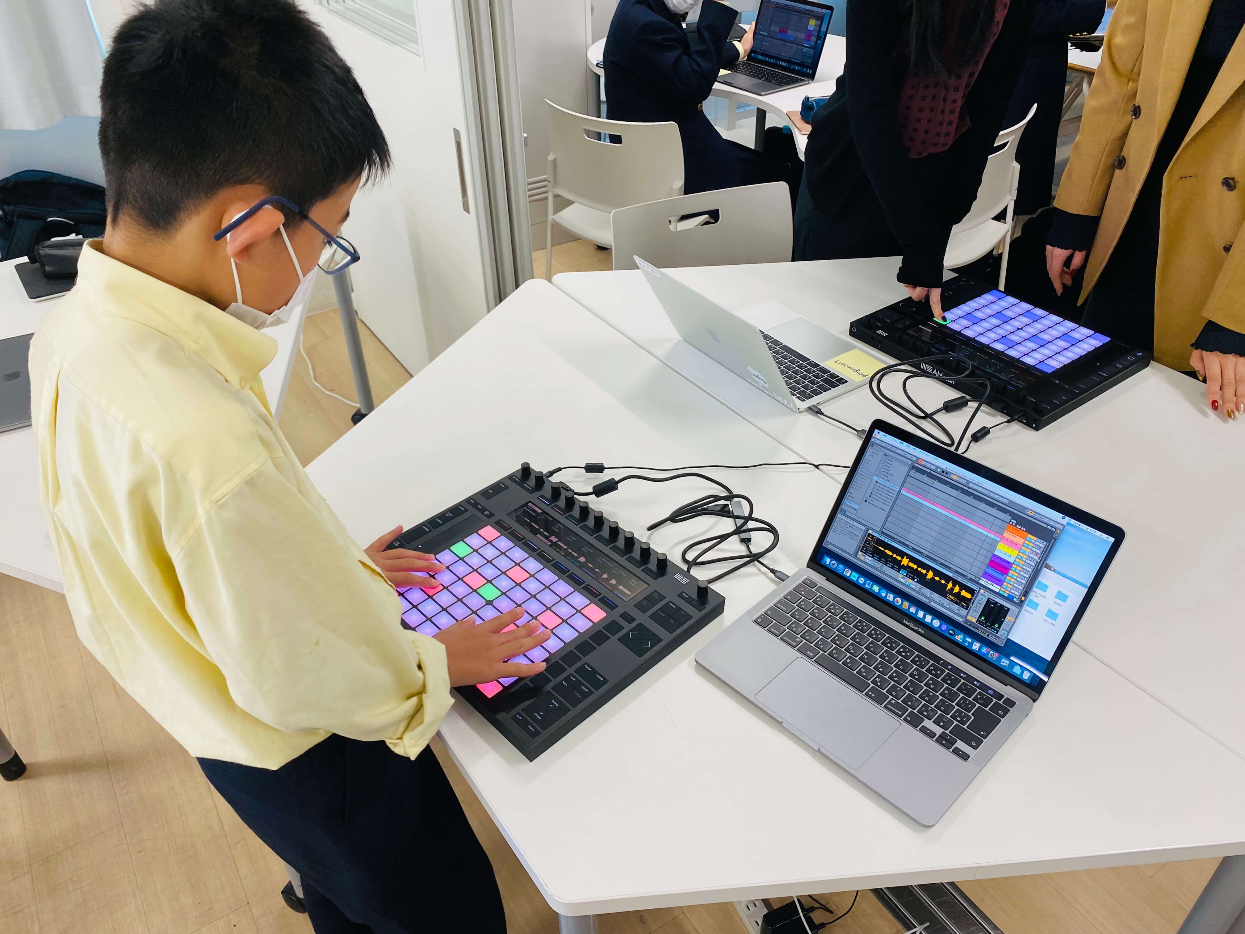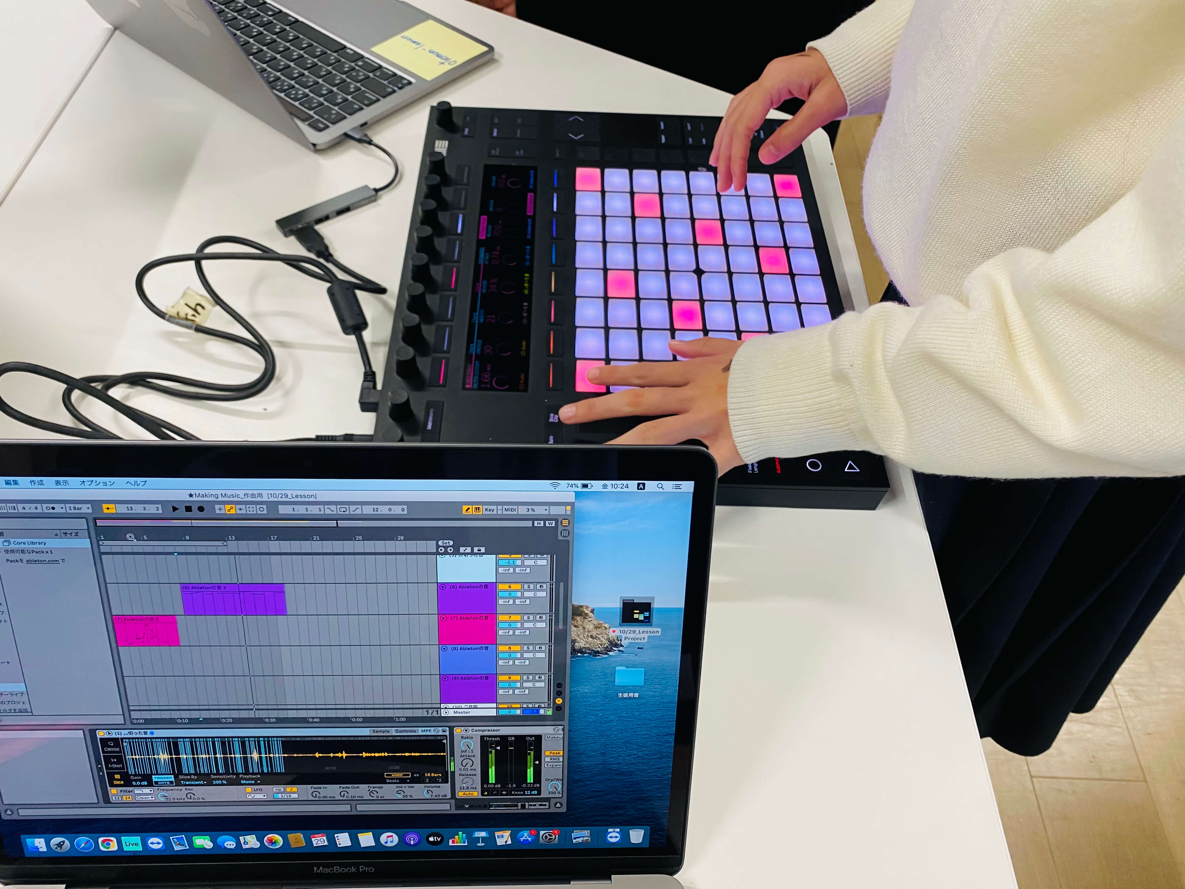 Abletonの認定トレーナのあやこさんに、今回の授業を担当していただいています!AbletonのDAWである「Live」の操作や、楽曲制作用インストゥルメント「Push」の使い方など、プロの指導で生徒たちはDTMに挑戦です!全て計算された入念な準備に脱帽。さすがです。