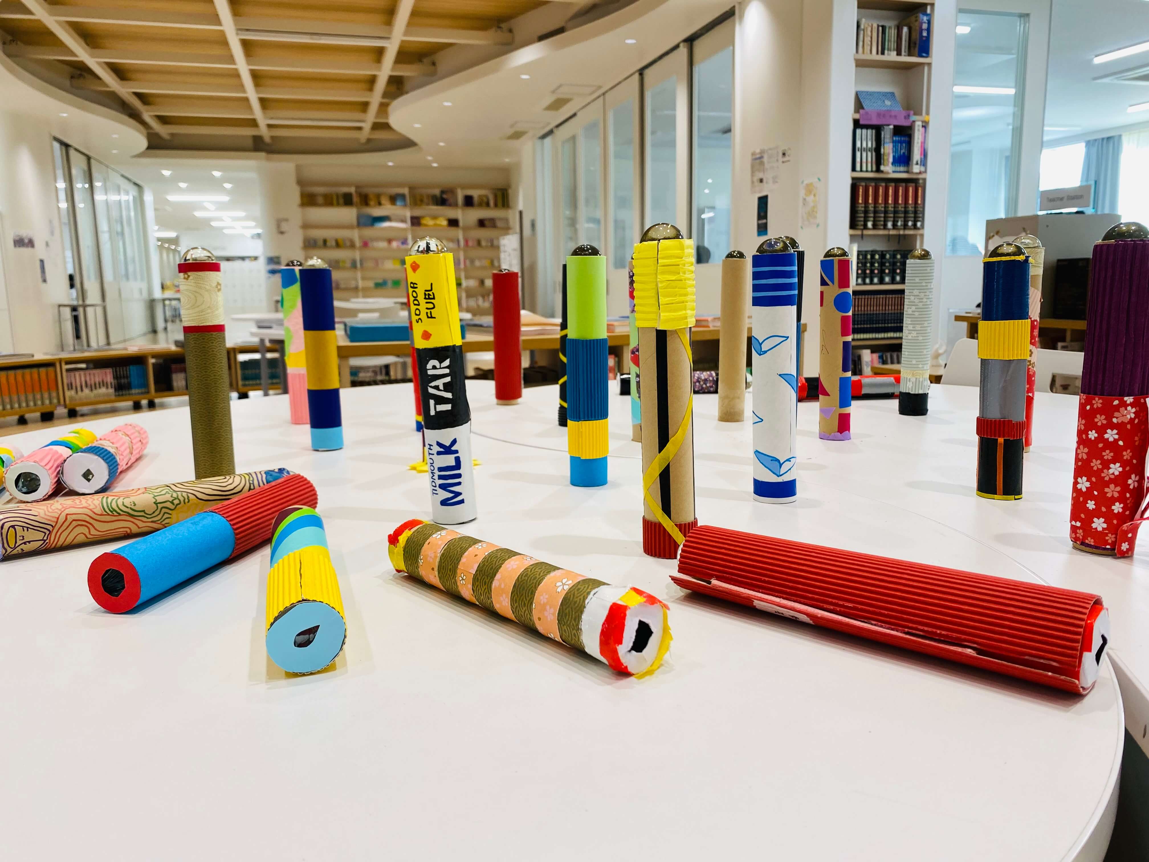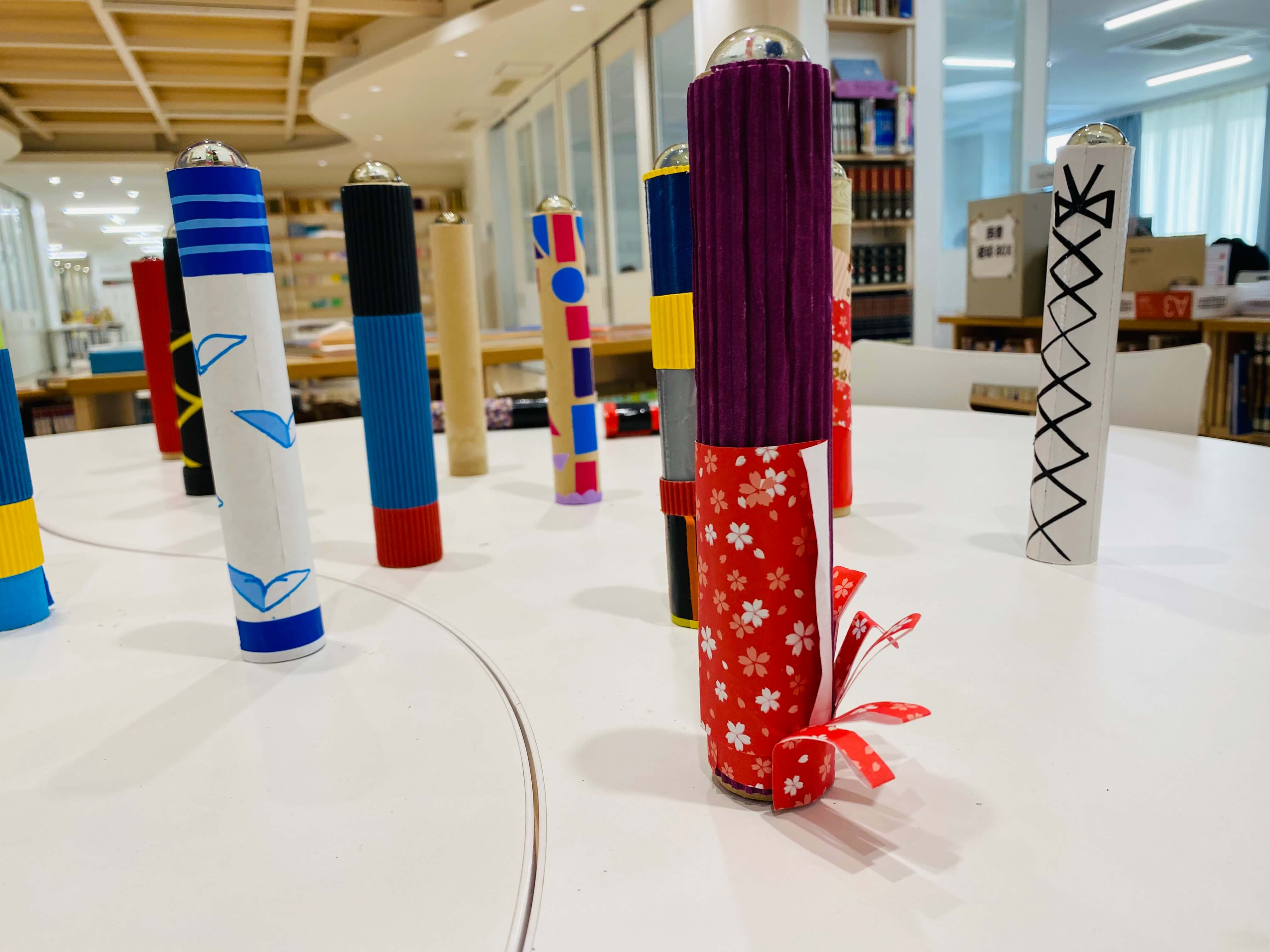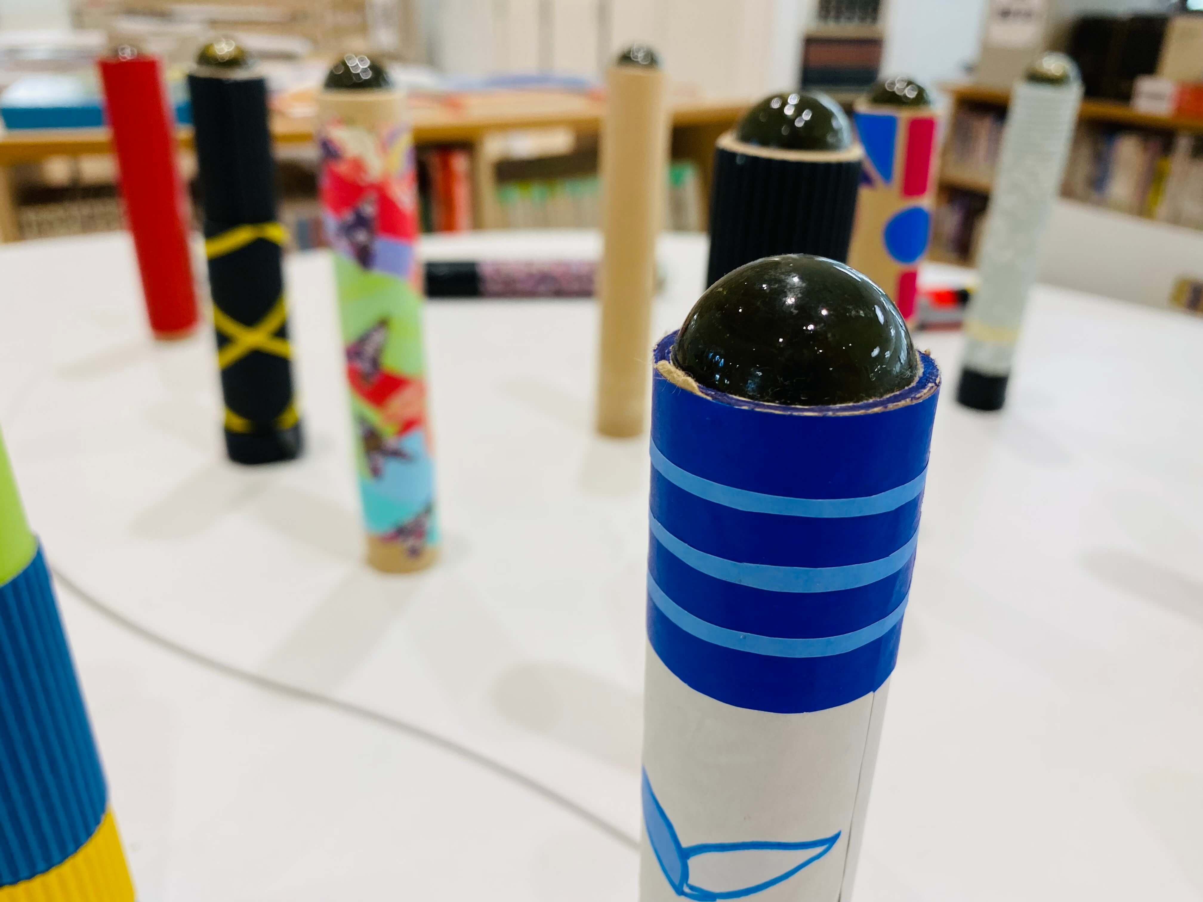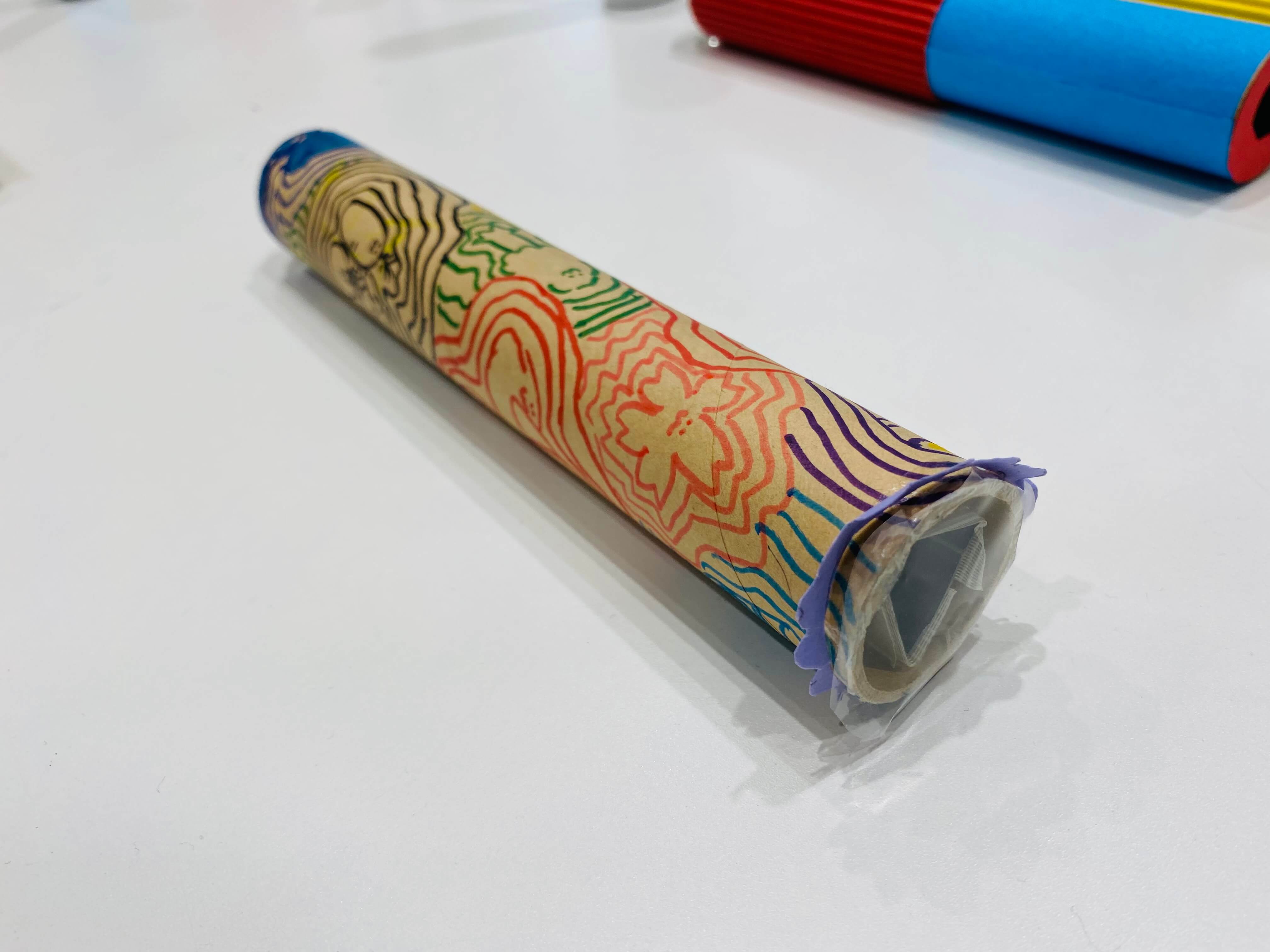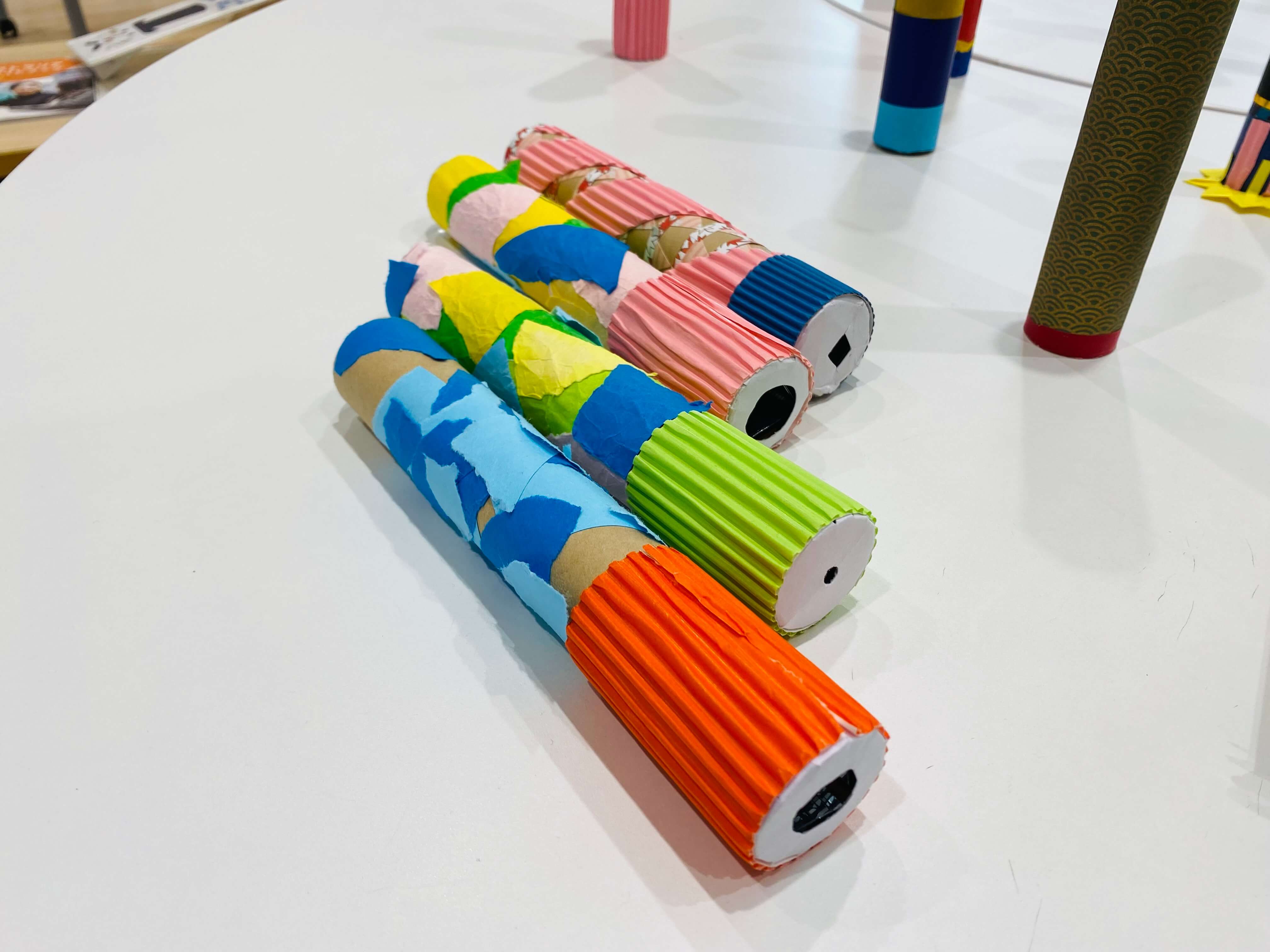 「道具」として選んだのは、万華鏡!!!先をビー玉にすることで、覗いたものが模様になって浮かび上がります。筒に合わせて反射鏡を切っては覗き込み、いい具合に調整。筒はデータをもとに自分らしく装飾します。ここでもひと悩み。「自分らしいってなんだろー」「まぁ適当にやっても自分が作るんだから自分らしいと言えるか」。ごにゃごにゃ悩みながら作っている様子でした。完成したら満足げに、いろんなものを覗き込んでいました!!!