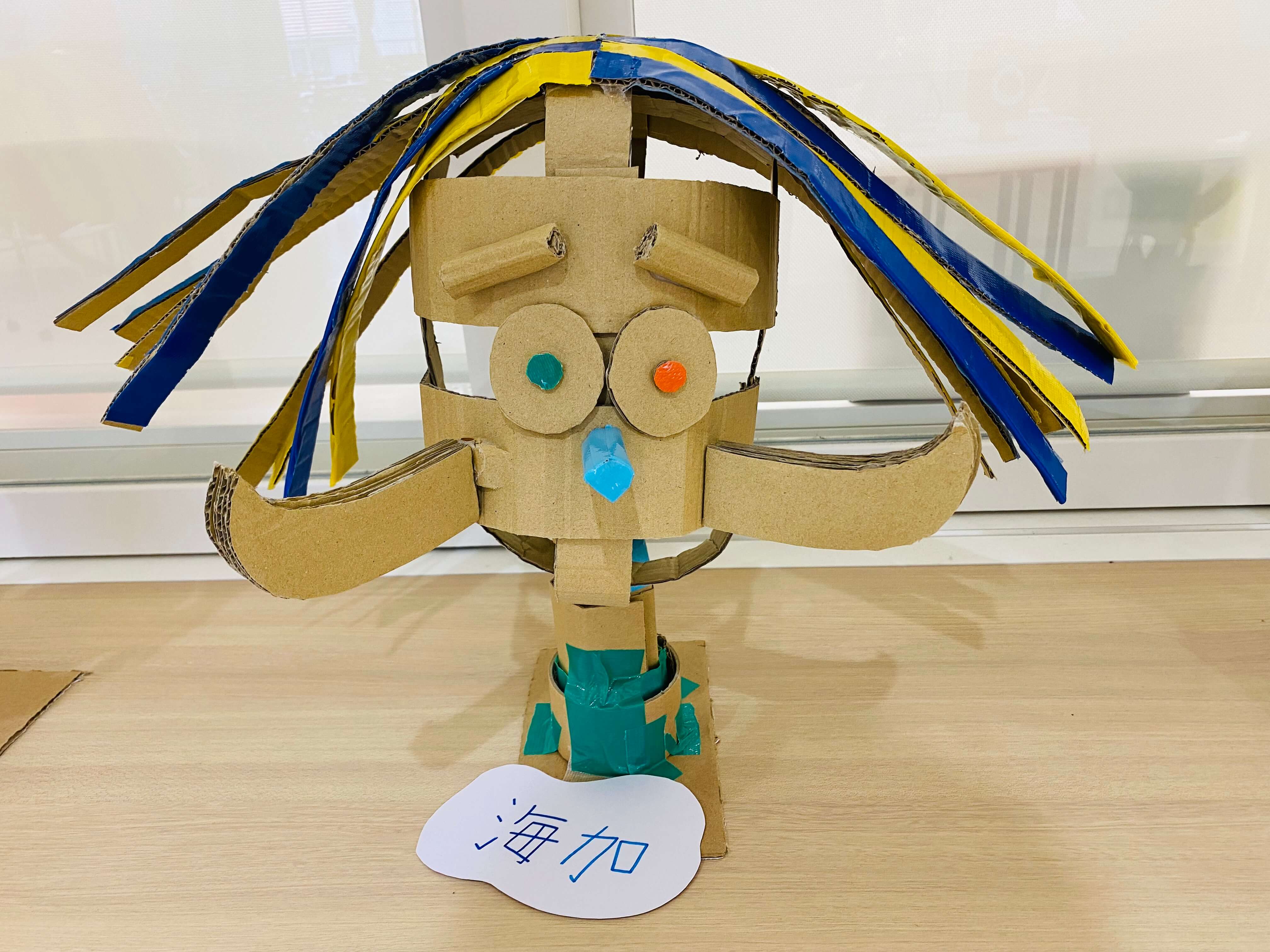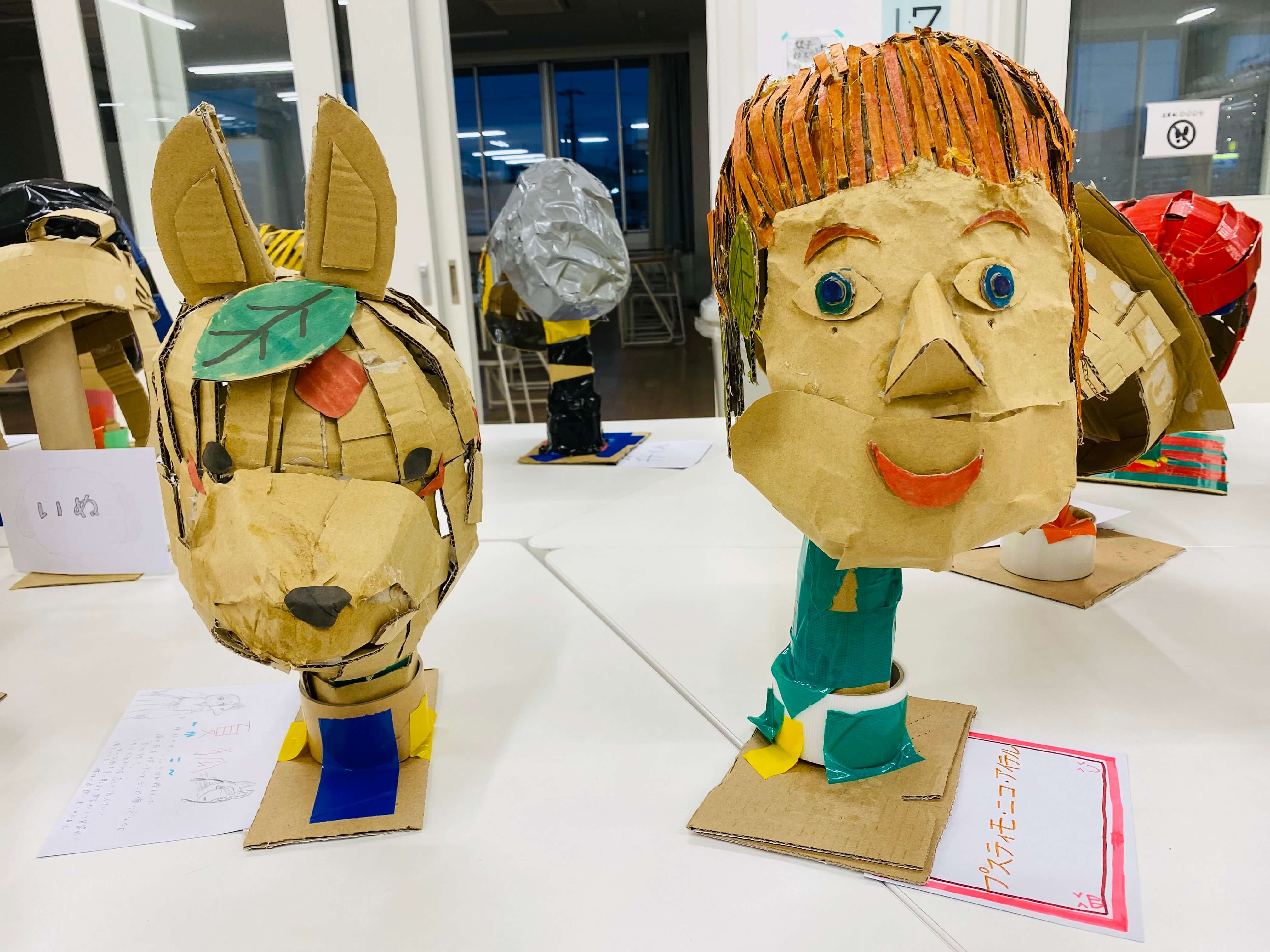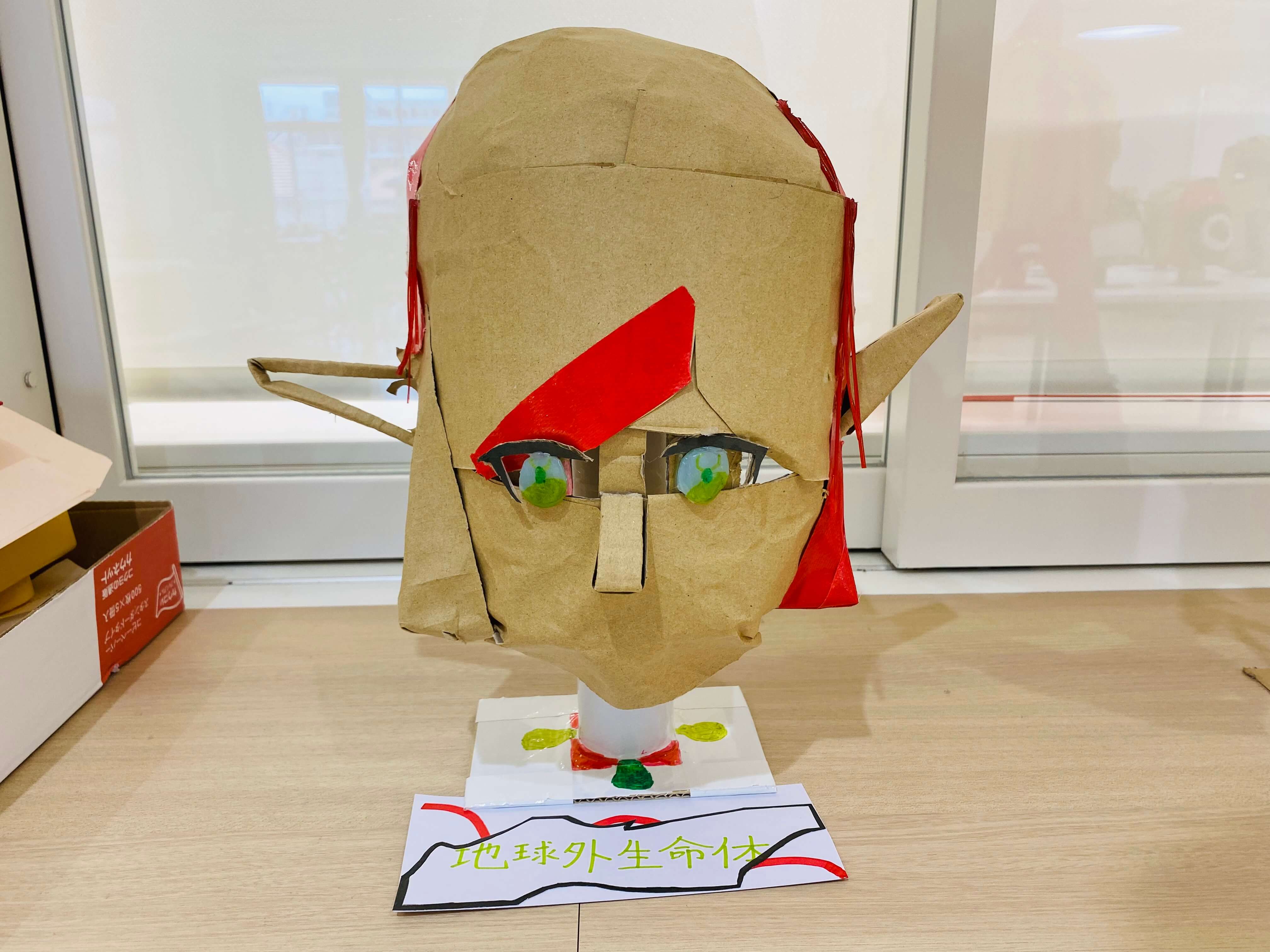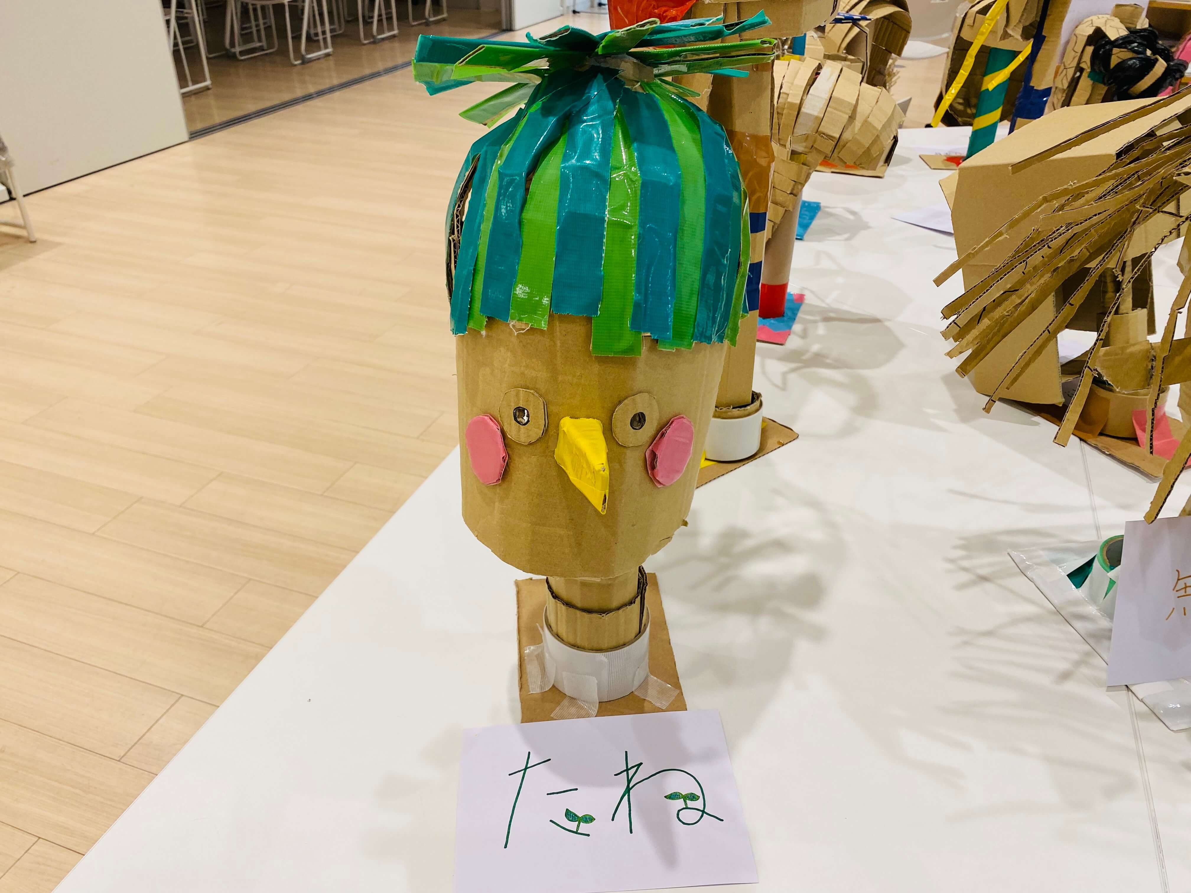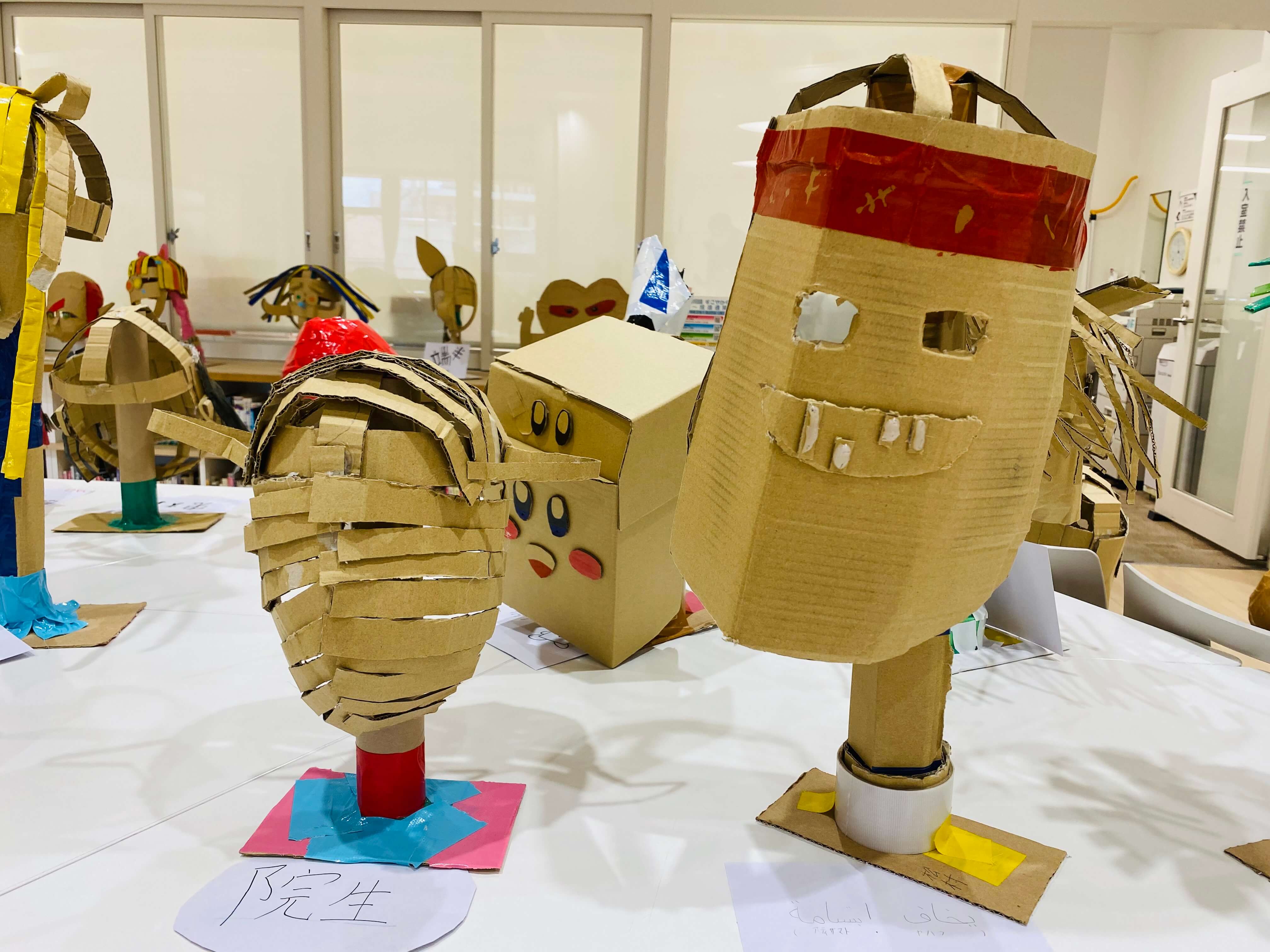 - 最初の設計図とは、全く違う方向に進んでいるけれど、悪い方向ではないのでよかったかなと思う。みんなのお面をみていると同じような材料でもみんな作っているものが全然違うくて面白いなと思った。