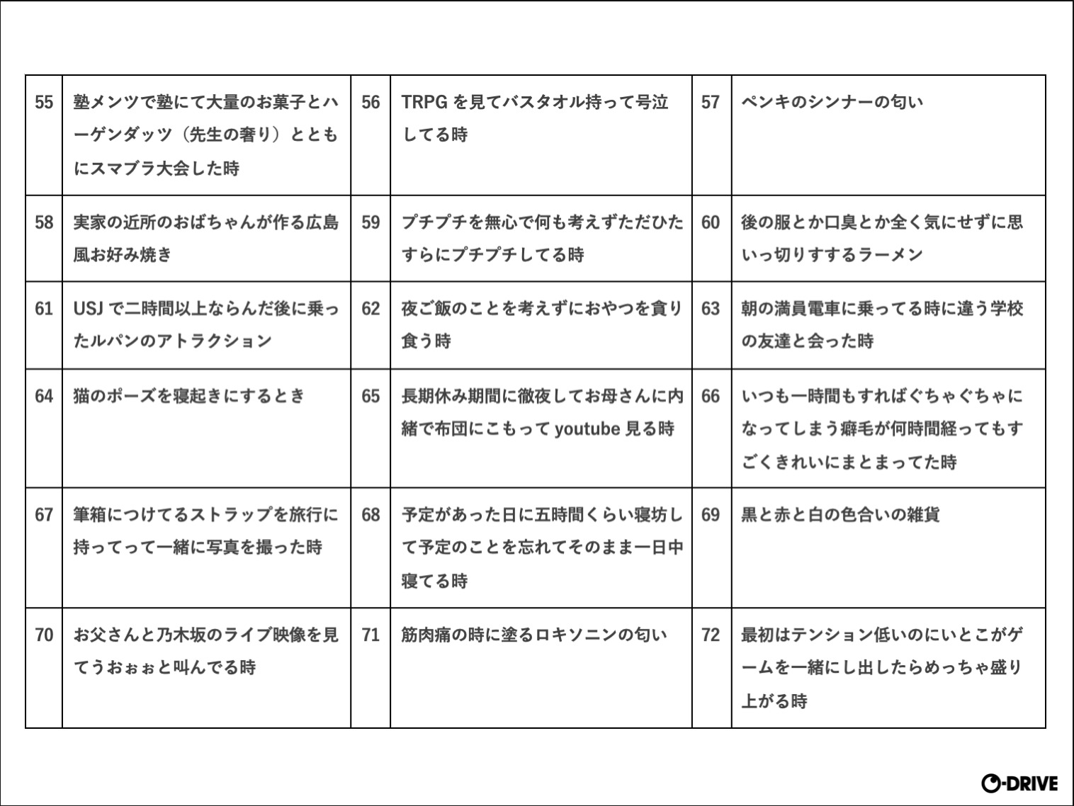 まずは自分の好きな、大切なモノこと人、何でもいいから108個出してみることから。根気のいる作業ではありますが、過去や日常を思い出したり、書くということを意識すると歩いているときにふと気づいたことにも意識的になれたりします。後半にいくにつれて、徐々に具体的になっていく内容。それがoriginalで自らの価値観を反映している可能性がありますよね。授業でシェアすると面白く、お互いのオタクを笑いながら言い合う姿がとても印象的です。