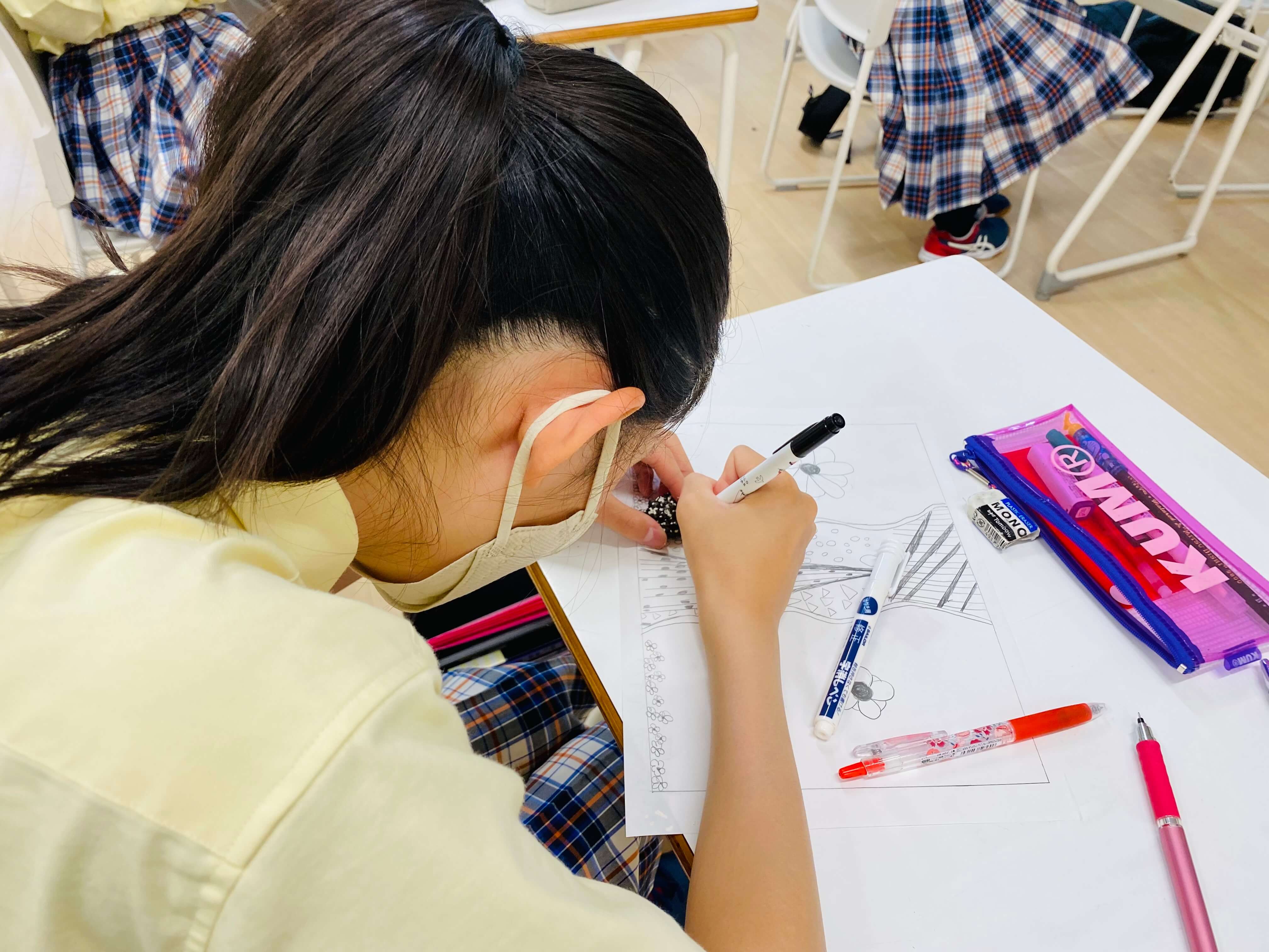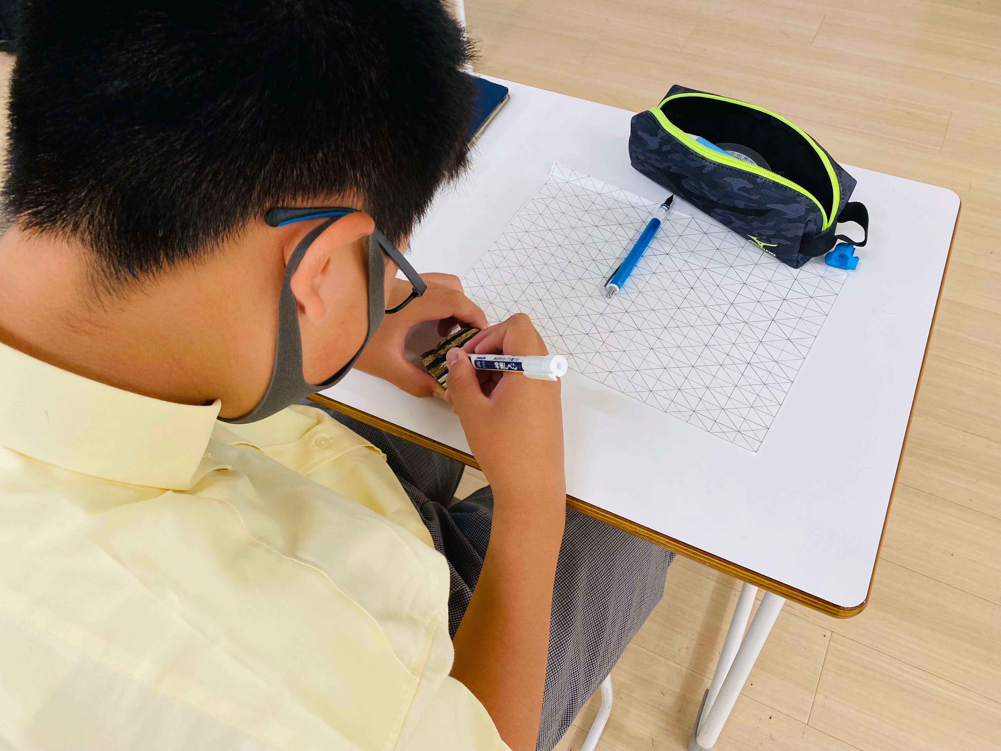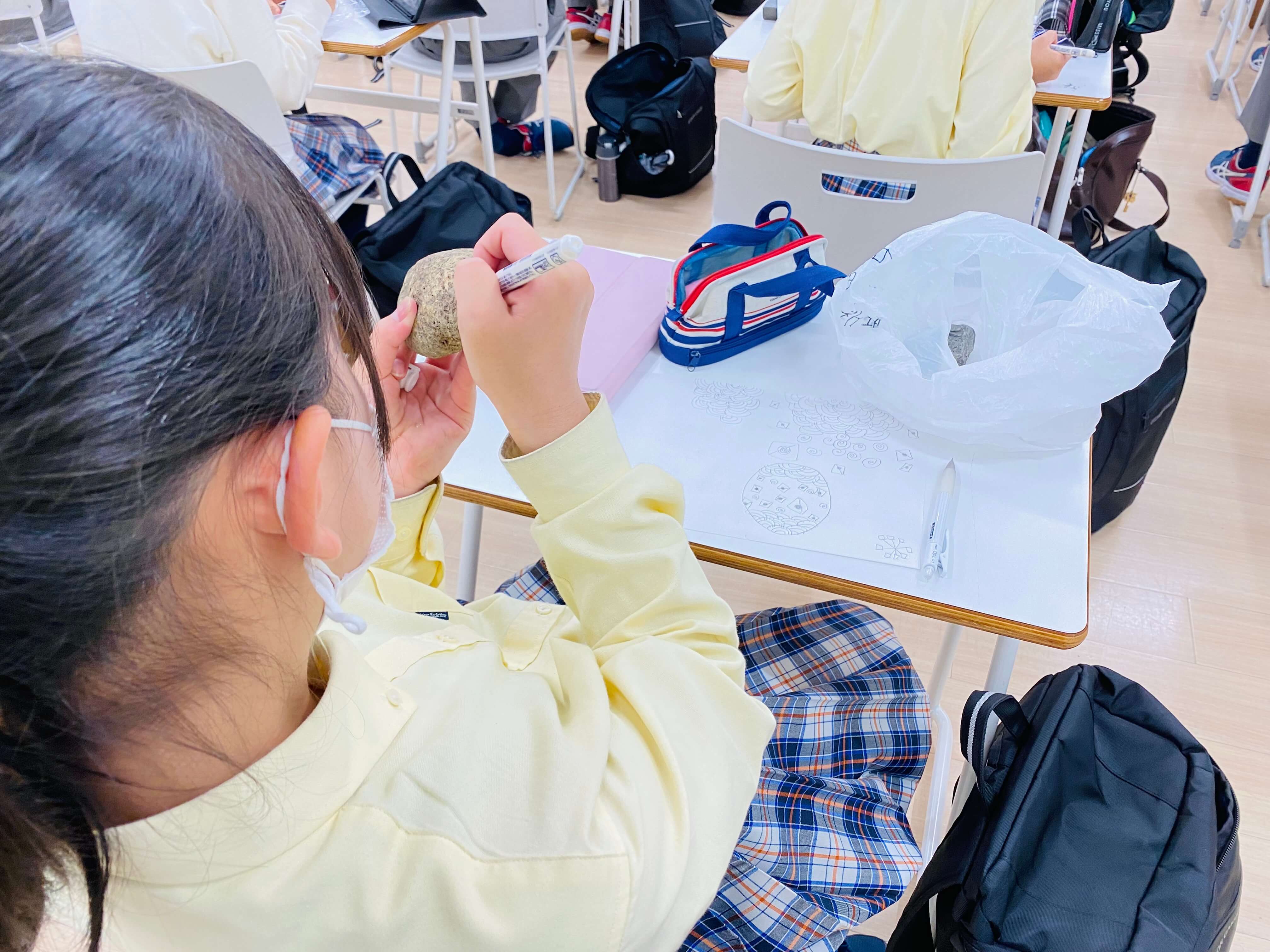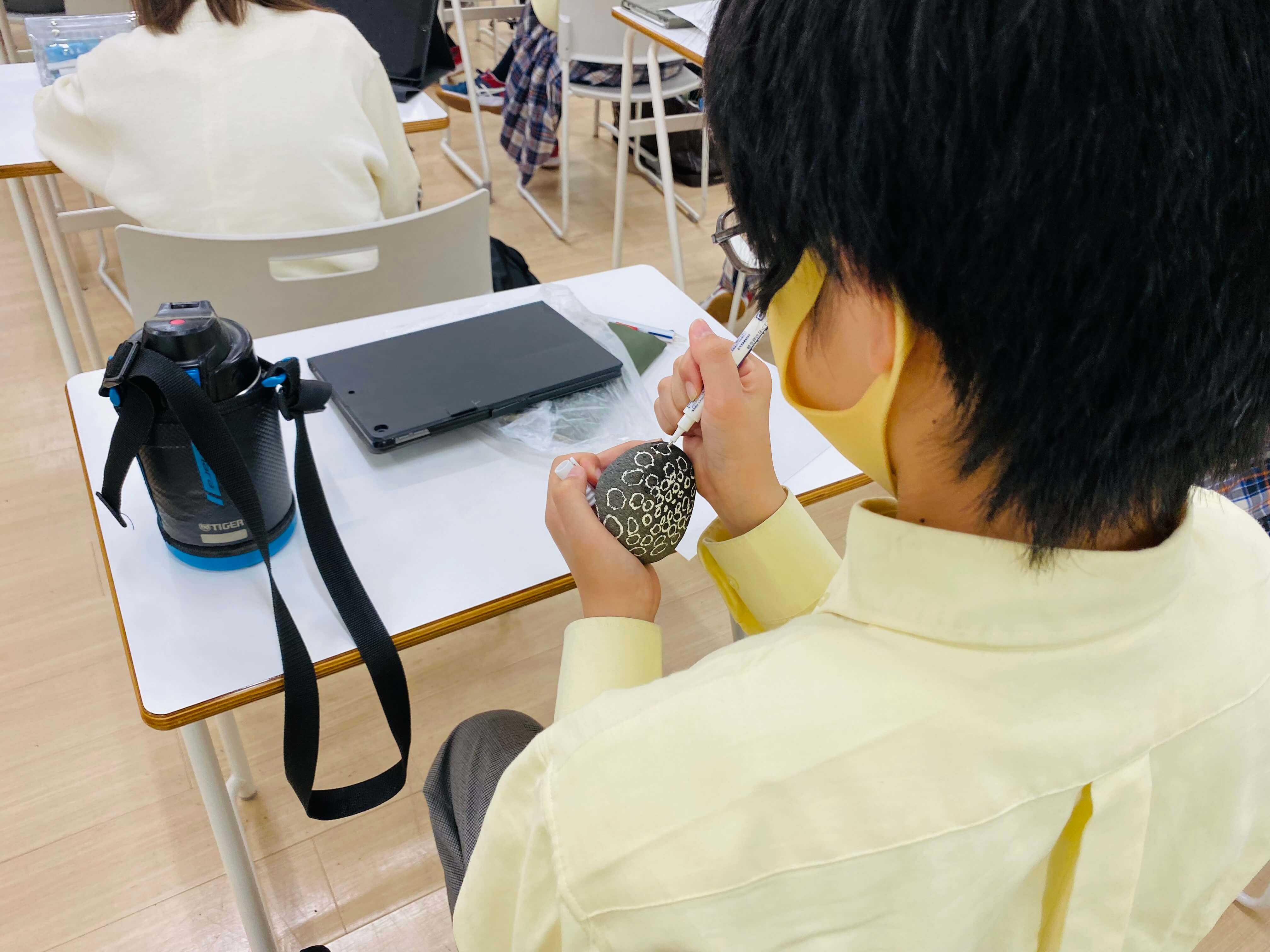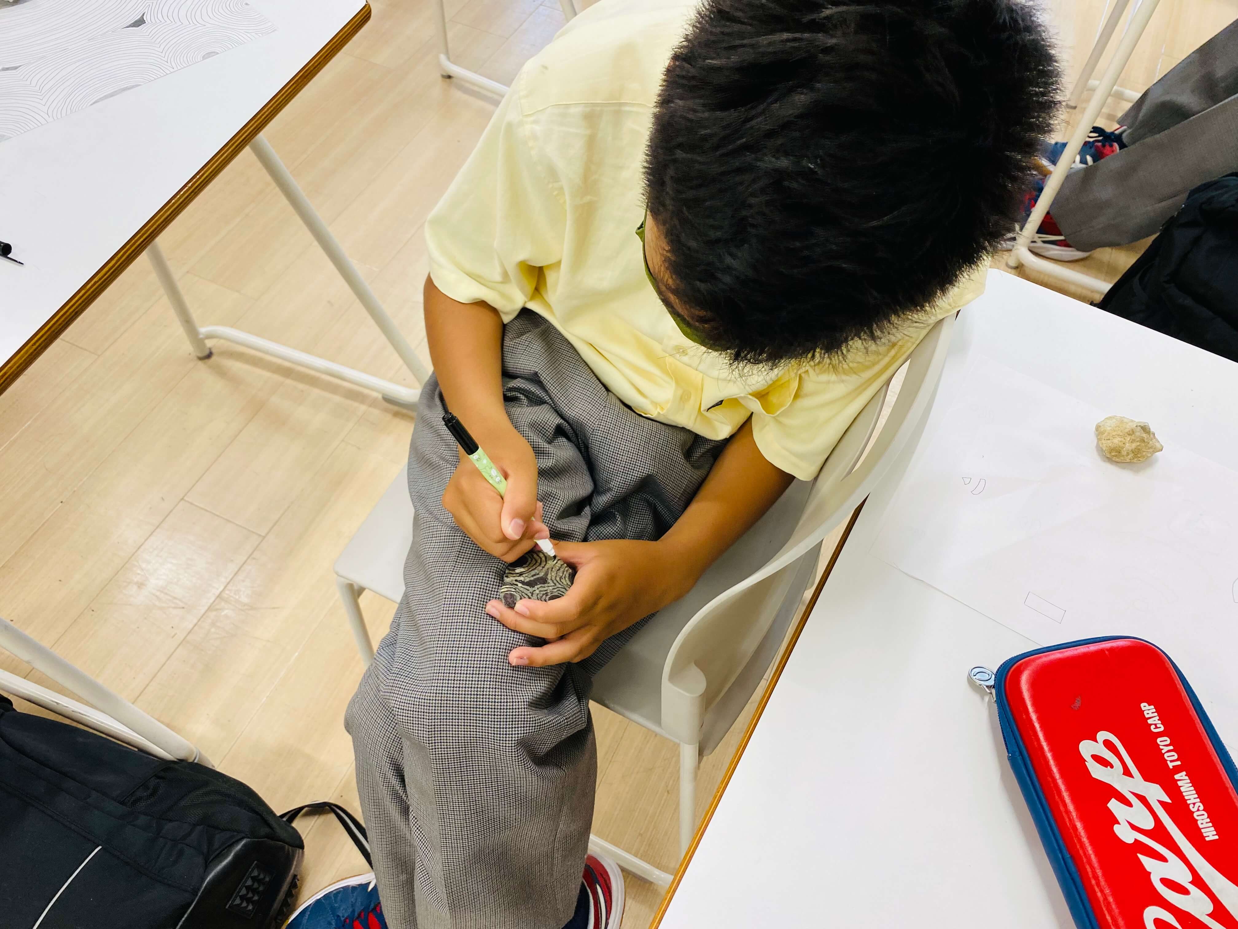 「視覚」をテーマに進んでいる中1のプロジェクト。前回仕上げたオリジナルの模様を、石の上に表現することにしました。模様から1番お気に入りの箇所を選択し、どんな石に描くかも自分で選択。というか、今回の宿題が「石、拾ってきて」でした笑。石の種類によって描く線の色も「白か黒」を選択。