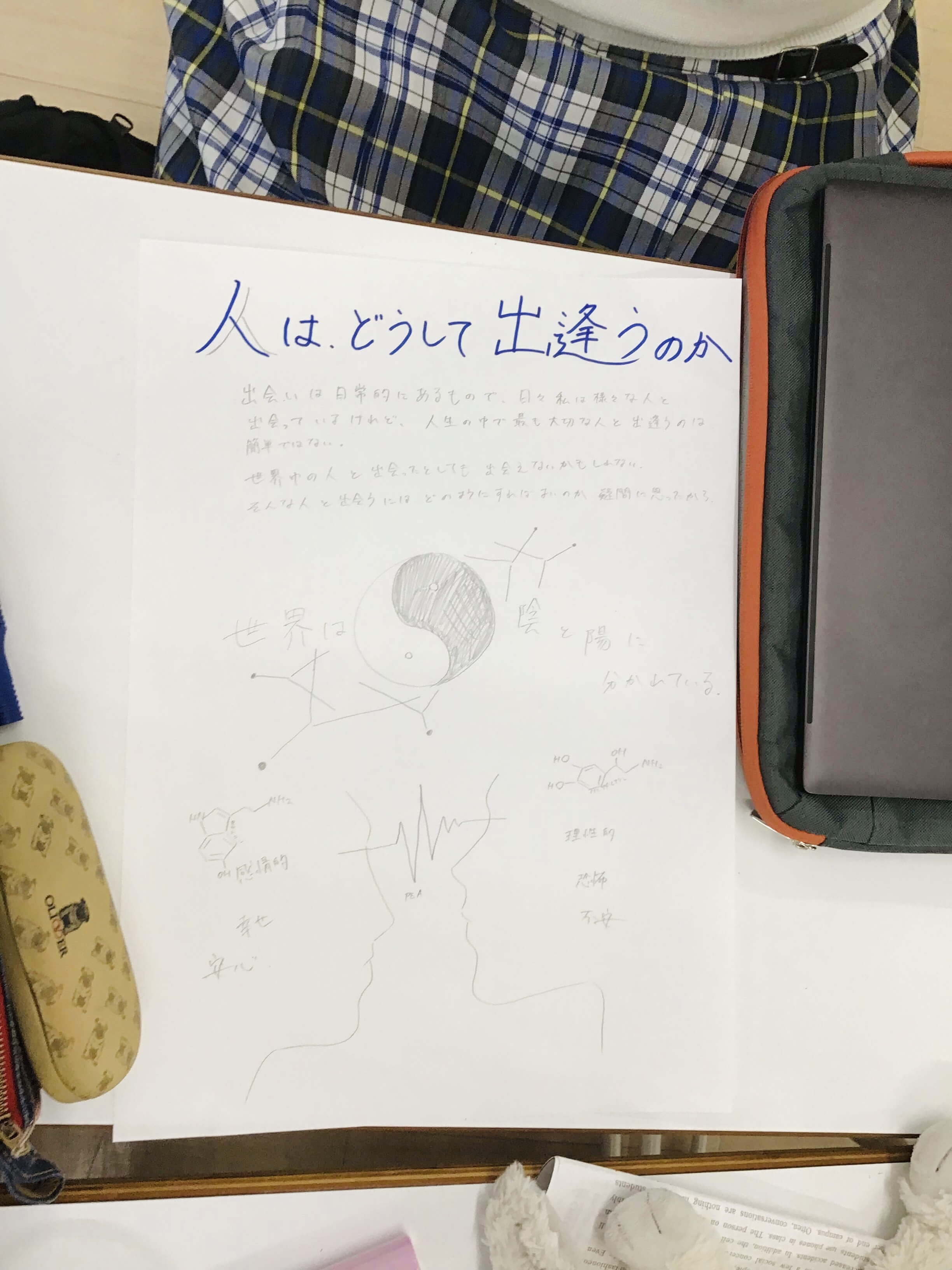 人、書籍、インターネット、とりあえず調べる。場所を変え、関わる人を変え、活動に浸ってみた。そうしてとりあえずやってみることを続けた結果、少しでも見えてきたことや感じること、気づいたことはあったのか?中間発表では全員に同じサイズの紙を配り、アウトプットの形式を制限してポスターセッションを行なった。自分の探究していることって本当に面白いのかな?意味があるのかな?お互いに感じている不安も、興味を示し合うことができれば小さな自信につながるかもしれません。「どんなことしているの?」興味を持って貰えたからこそ、説明をしている表情も自然と笑顔になっていました。
