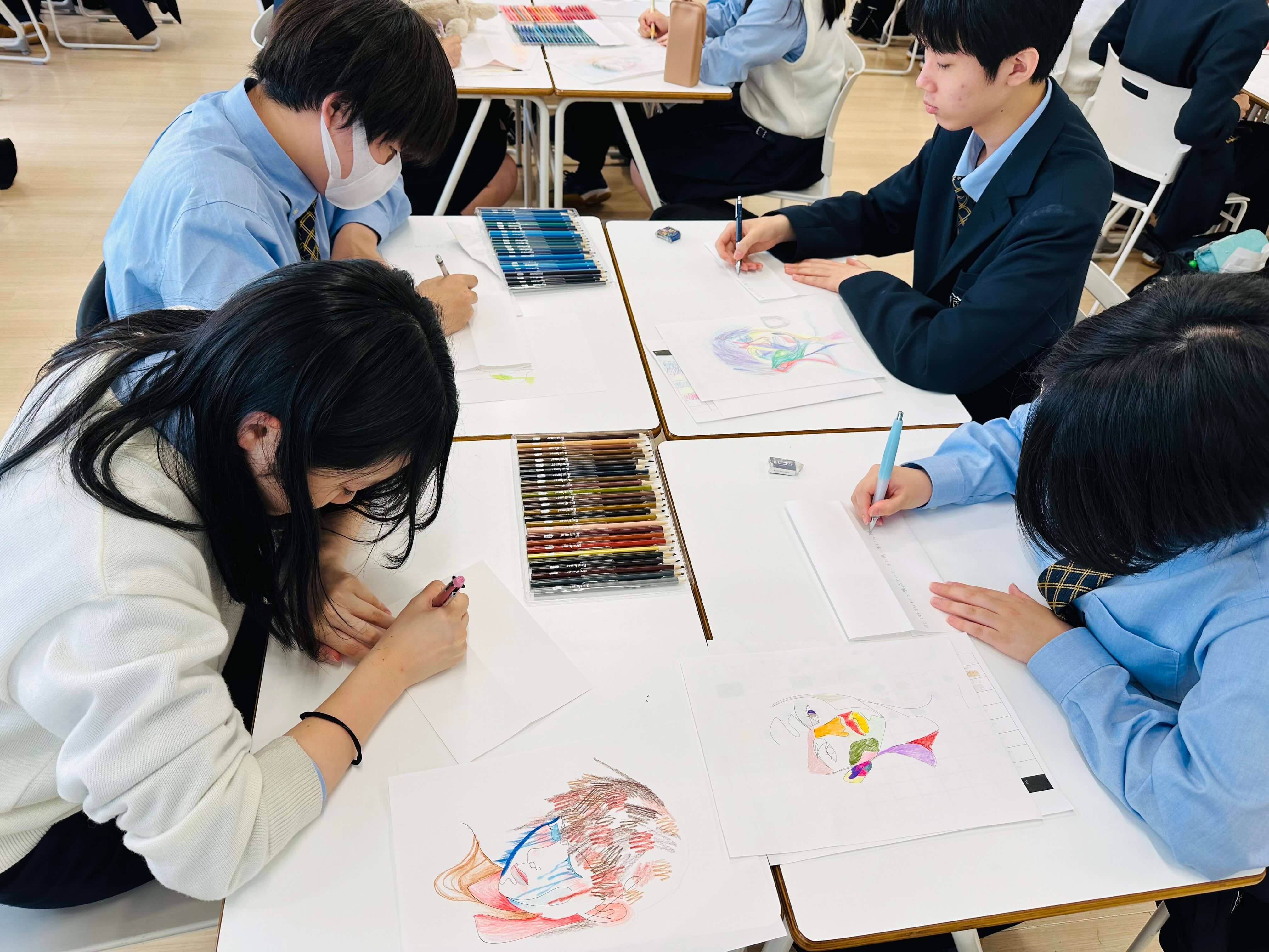 カラーパレットが仕上がると、自由度の高い線画に対して、それぞれの好き・大切の108のカラーを使って表現をしてみます。ここで描かれるものは、同じ色であっても同じ意味のものは存在せず、同じものが出来上がることもありません。こうして、完全オリジナルなカラーアートが出来上がります。出来上がったものは、自分にとどまらずにクラスや他クラスも交えて鑑賞会を実施します。
