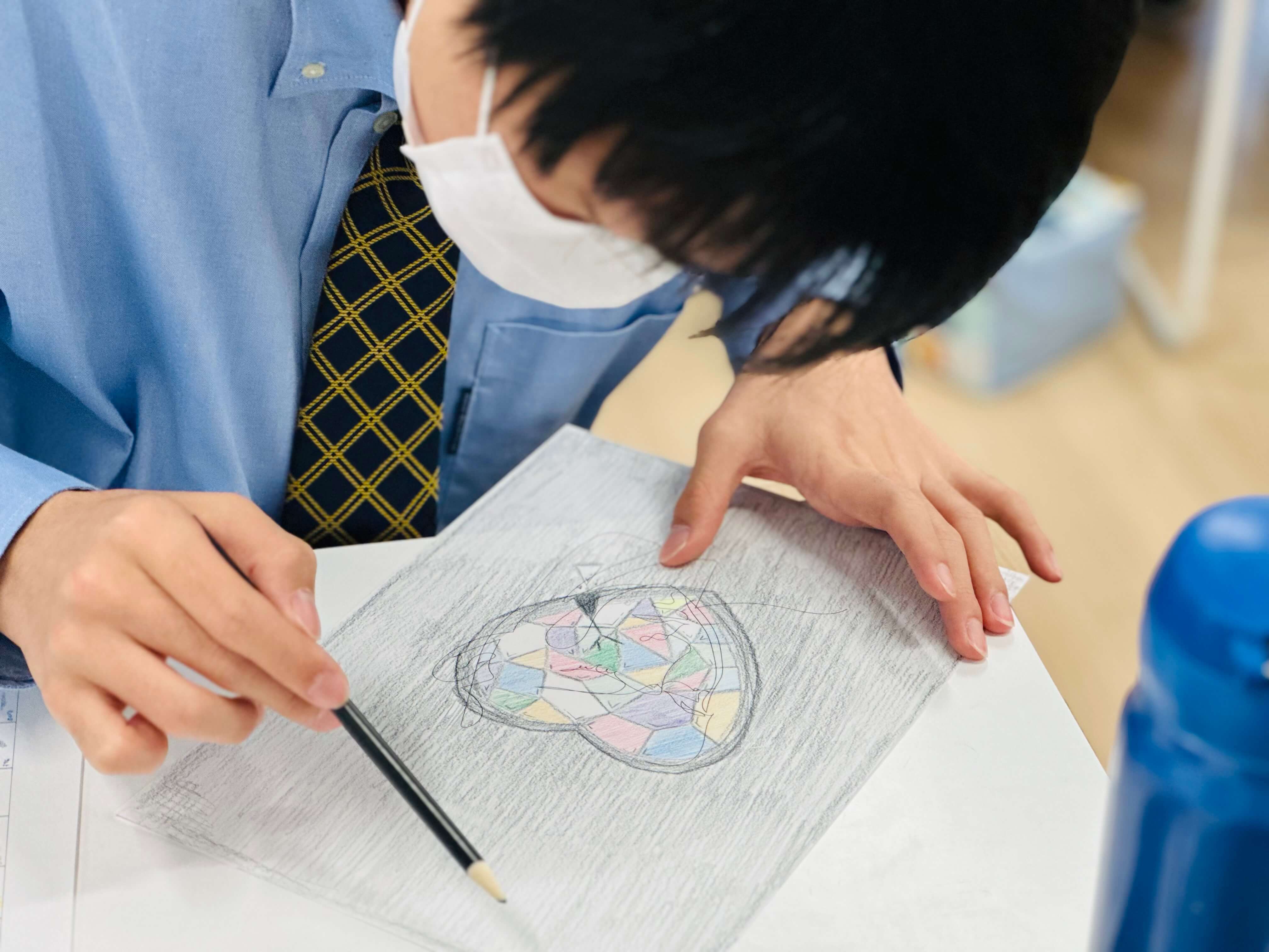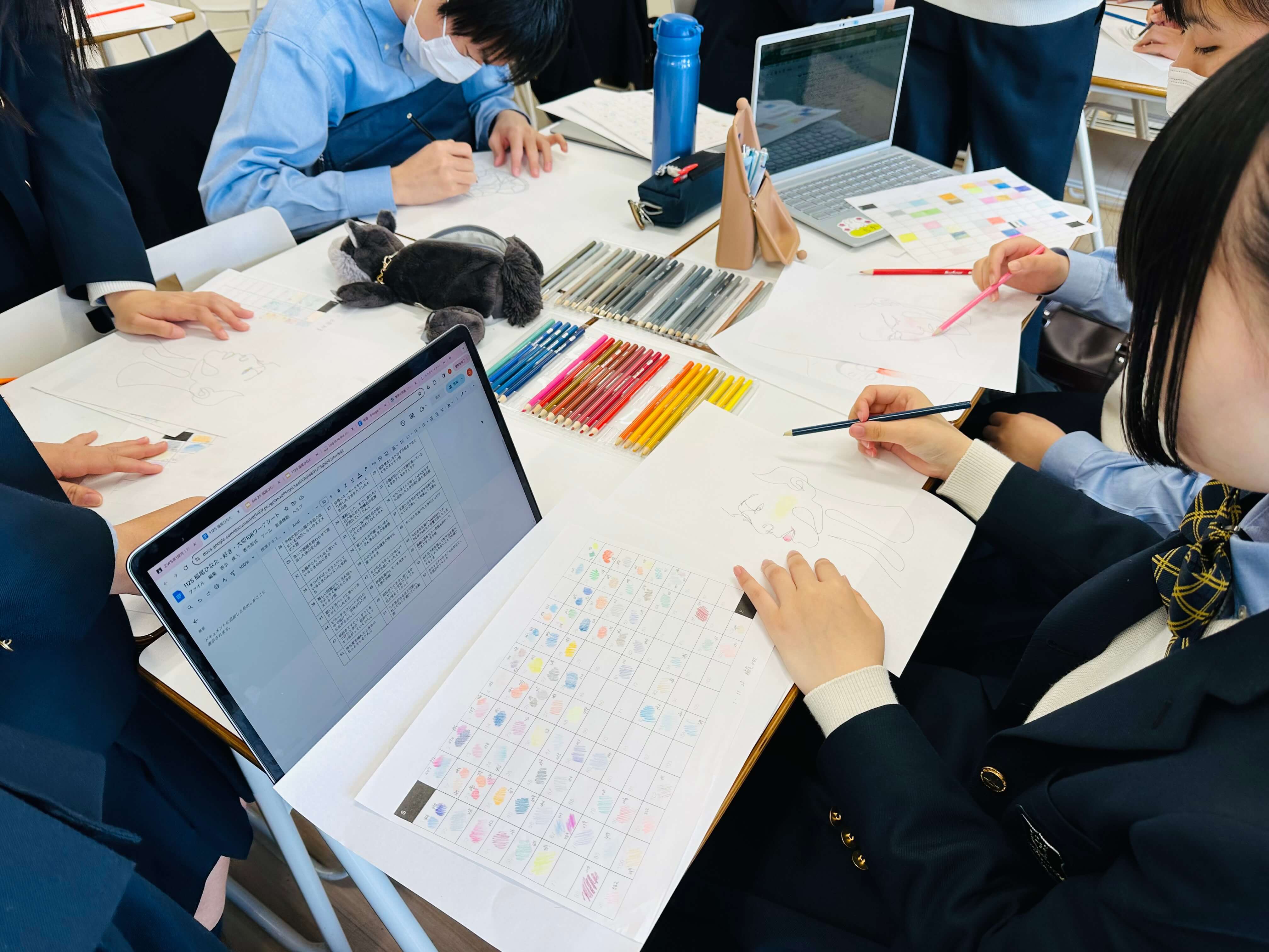 カラーパレットが仕上がると、自由度の高い線画に対して、それぞれの好き・大切の108のカラーを使って表現をしてみます。ここで描かれるものは、同じ色であっても同じ意味のものは存在せず、同じものが出来上がることもありません。こうして、完全オリジナルなカラーアートが出来上がります。出来上がったものは、自分にとどまらずにクラスや他クラスも交えて鑑賞会を実施します。