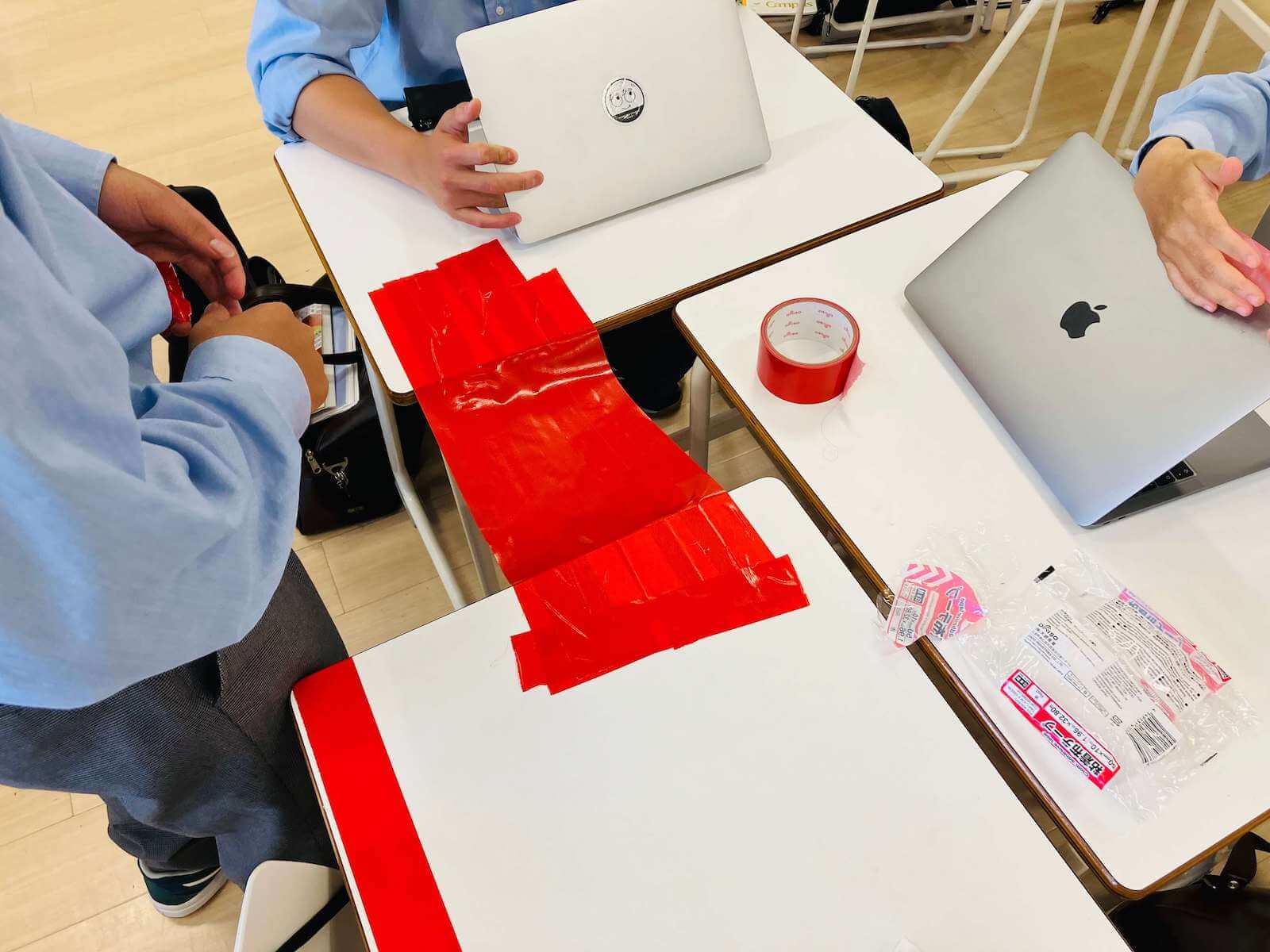 まずは取り敢えずチームやペアでブレインストーミング。新たな活用方法を見出すために、とにかく数を出します。最初はガムテープに繋がる動詞から。ガムテープといっても動きは様々。貼る、剥がす、転がす、堅める、書くなど。新たなアイデアに繋がるきっかけを集めて行きます。その後は出した動詞の解像度を高めていきます。何に対して、どういった目的で使用することでガムテープのその動きに繋がっていくのか。日常の中での自分の困りごとに対する解決策としてガムテープを活用することはできないのか。アイデアのきっかけ達を掛け合わせてイメージを膨らませます。