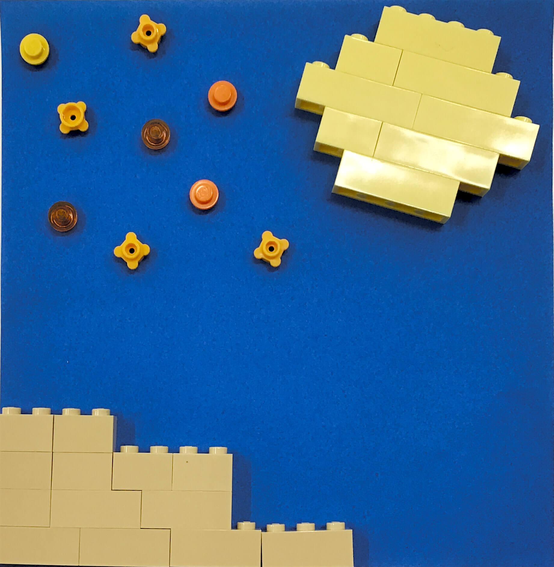 • 星、月、海の空。星みたいに小さい部品を散りばめ、月を三日月ではなく、あえて満月の形にし、海の空のイメージなので、砂浜を段差にして作りました。