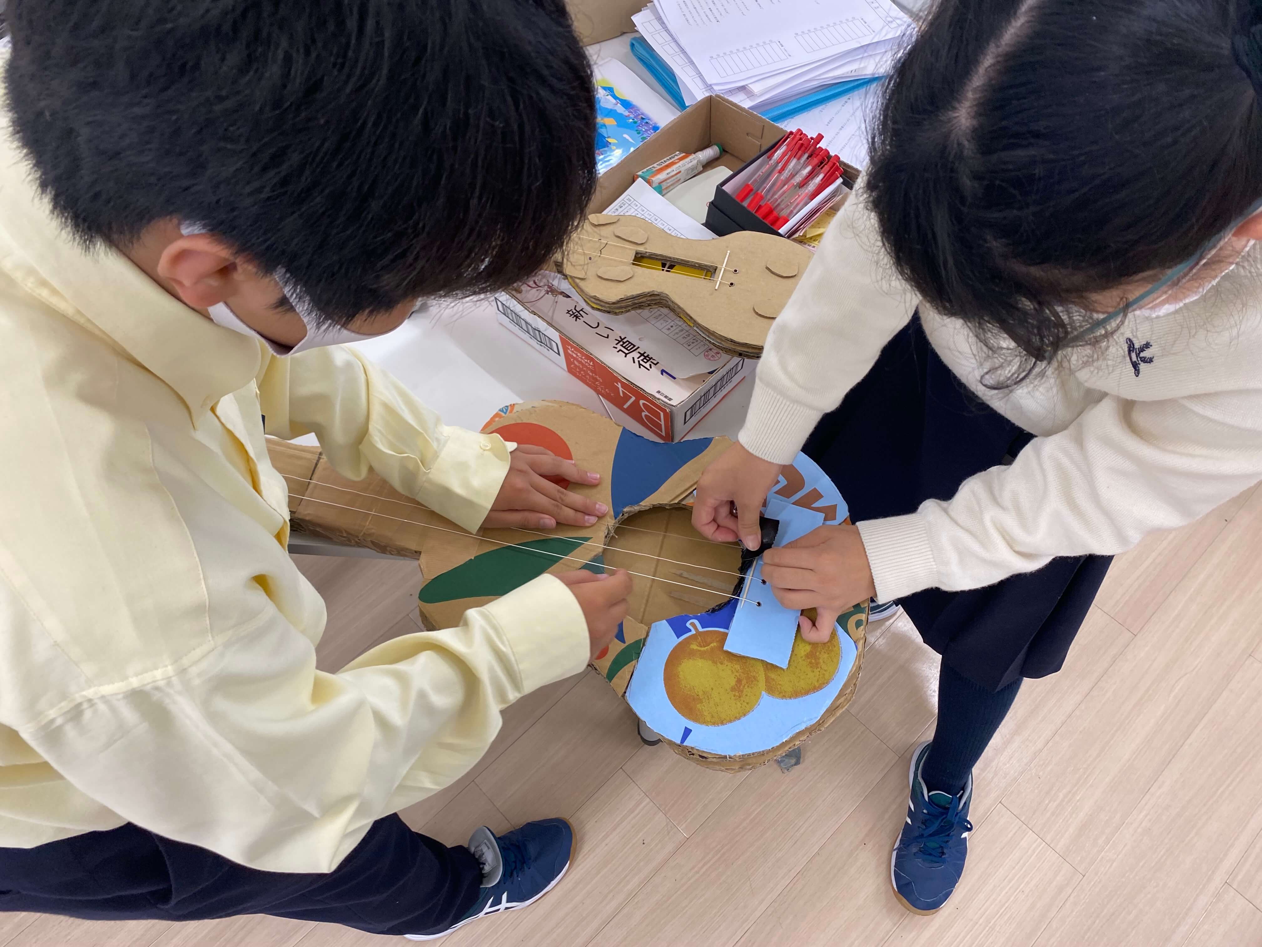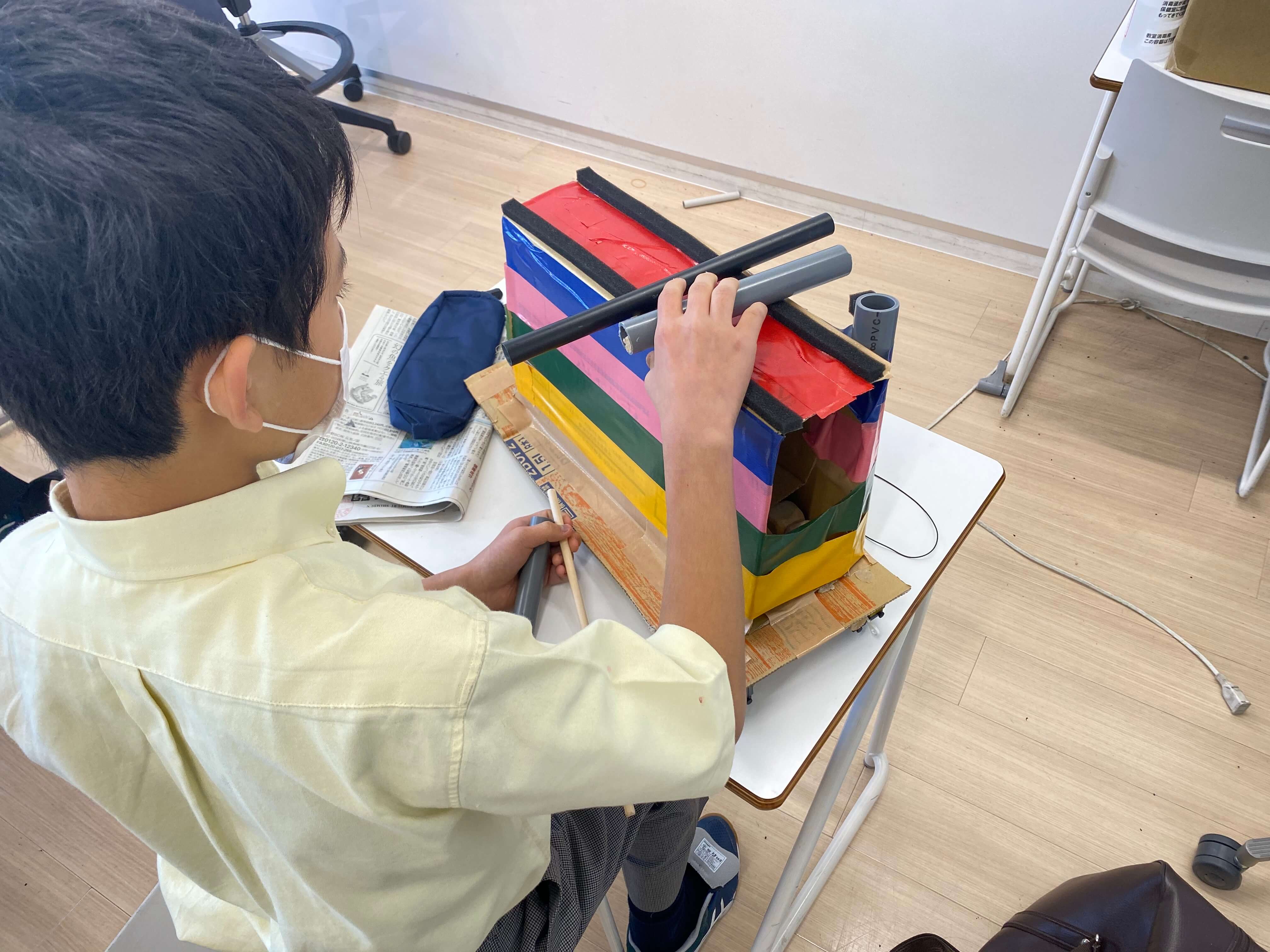 音の探究が進んでいます。ちょっとだけ本格的に「楽器」を作ってみることにしました!段ボールなどを使って時間をかけて作ったものからどんな音が出るのか。「本当にこんなので音が出るの?」。「楽器なんて作れるの?」。半信半疑、作業は進んでいきます。