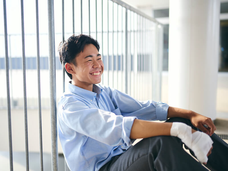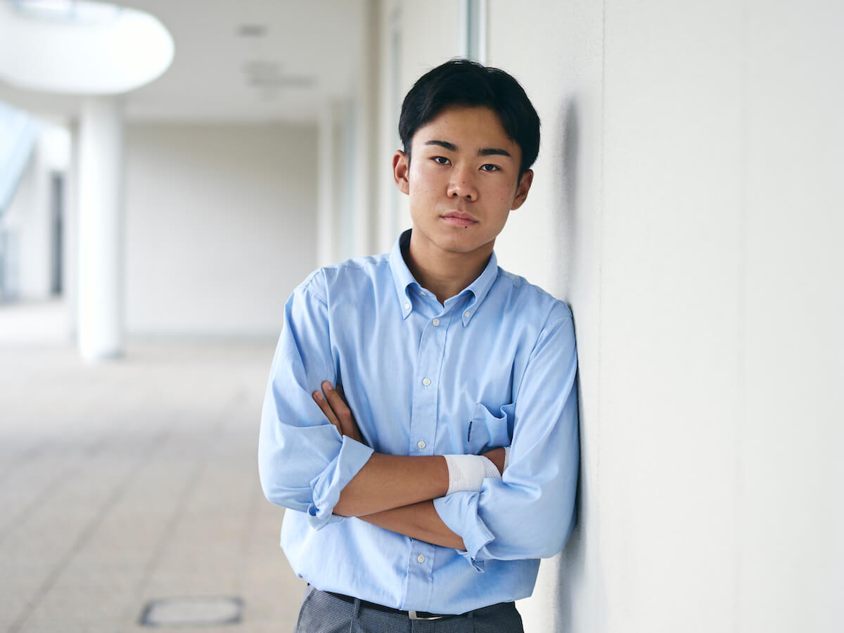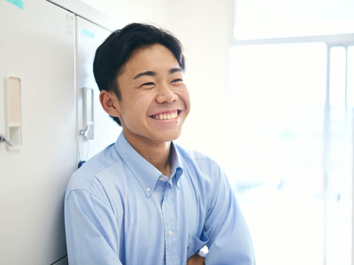 僕が追手門に興味を持ったのは、中学の時に見たパンフレットで、探究の授業を知ってから。『スペースバルーン』に関するプロジェクトの記事を読んで、生徒たちが主体的に取り組む姿に惹かれました。入学してから1番驚いたのは、生徒と先生の距離感が近いこと。中学校までは用事がないかぎり職員室に行くことがなく、先生との会話の機会も多くはありませんでした。でも追手門では職員室とは別に『ティーチャーステーション』という場所があります。ここは仕切りもなく、話しやすい雰囲気をつくってくれているので、勉強の相談や雑談を気軽にできるのがいいですね。また授業中にどんな提案しても、先生たちは絶対に否定せず、まずは話を聞いてくれるので、自分を素直に表現できています。