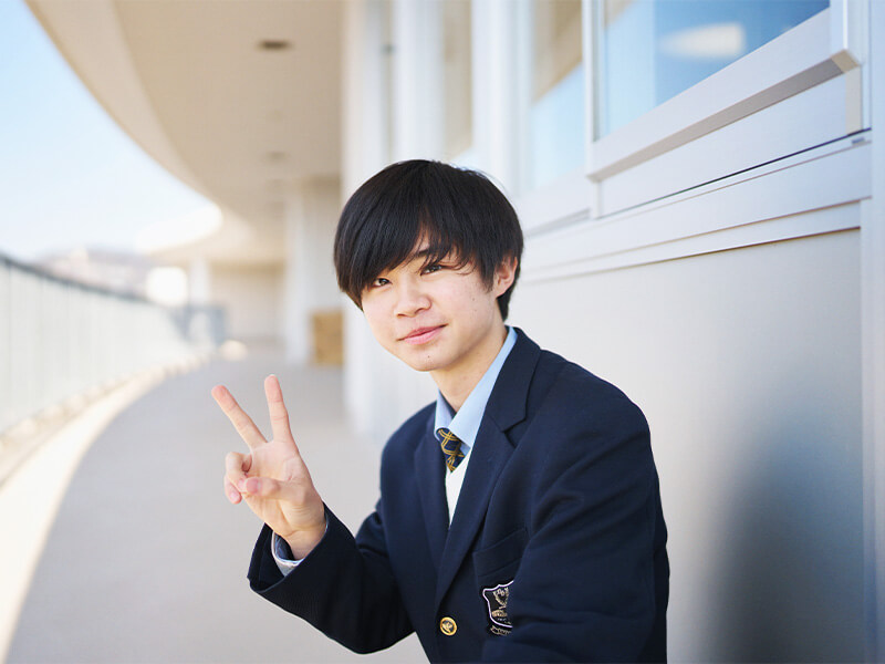 僕が追手門高校への入学を決めたのは、グループで行う授業が楽しそうだと感じたから。中学の時に通っていた塾でも、複数人がひとつのチームとなった進めるカリキュラムがあったので、その形式を幅広く取り入れているこの学校に共感を覚えました。実際に授業を受けてみると、まわりの人たちからさまざまな意見や考え方をインプットできるだけでなく、自分の思いを人に伝える必要も出てくるので、とてもおもしろいと同時に、自分を鍛える場にもなっています。探究の授業の中で特に印象に残っているのは、企業の方たちに事業プランを提案するというプロジェクト。僕はたまたまチーム編成を決める時に欠席をしてしまったこともあり、1度も話したことのない人ばかりたちのグループに入ってしまいます。しかし勇気を出して自分で考えたアイデアをプレゼンすると、それがチームとして提案する案に採用されました。その経験から、どんな環境でも物怖じせず、自分自身の意見を相手に伝えることが大切だと学びましたね。