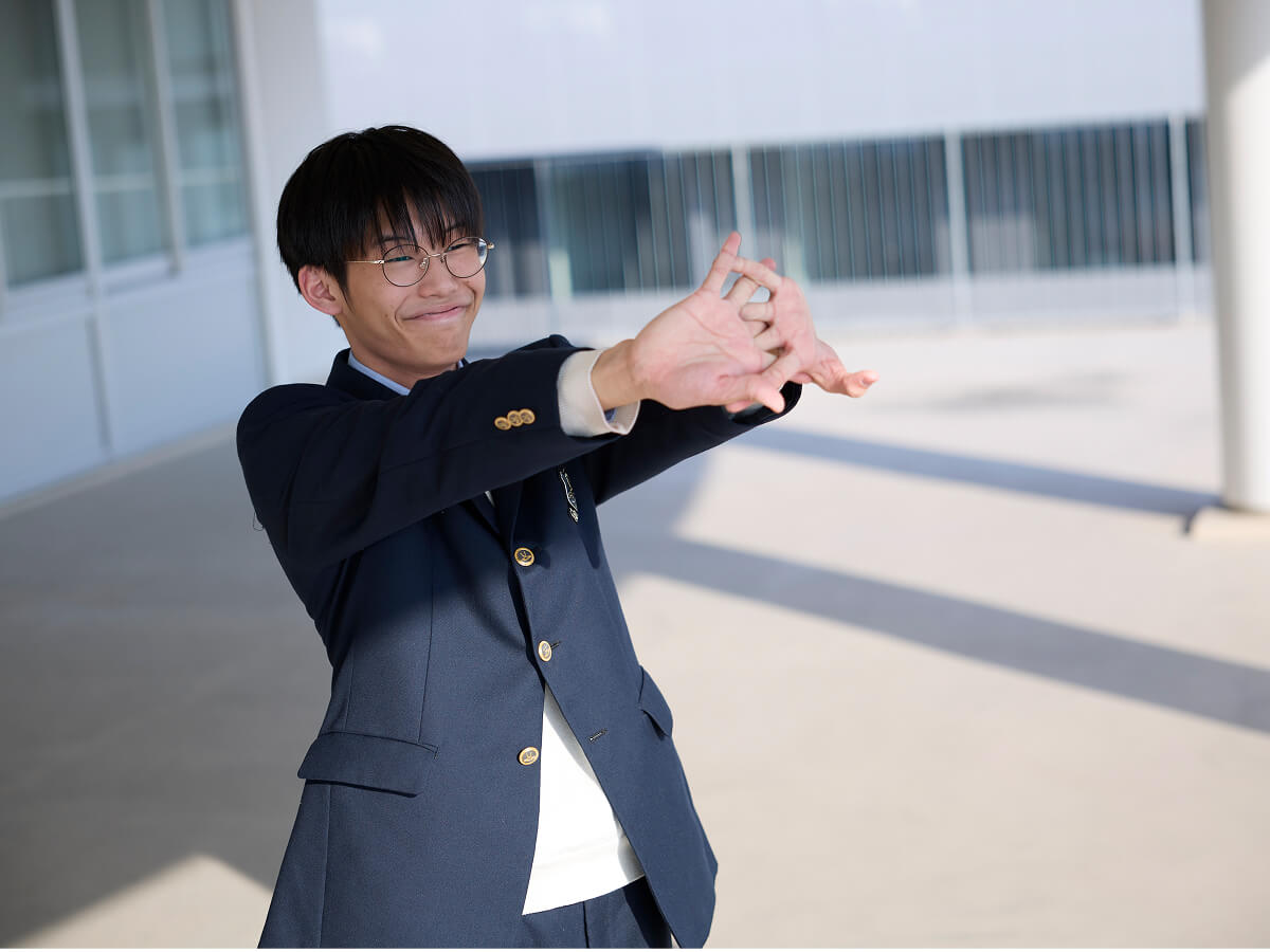 僕は中学3年生の時に、追手門学院のオープンスクールに来て、創造コースの体験授業を受けました。その時に先生ではなく、たった1〜2歳上の先輩が授業を担当していたことに驚きとかっこよさを覚えます。そして「ここに来れば自分もこれくらい成長できるかも」と感じて入学を決意しました。創造コースでは、勉強そのものよりも、勉強を通して気づきを得て、それを自分の生活へと落とし込むような授業が多く、例えば数学の公式などの知識をどんどん覚えていって受験の準備につなげるといった旧来型のスタイルではありません。
