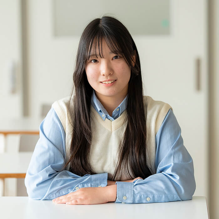 私が追手門学院に進学を決めた理由はふたつあります。ひとつ目は職員室ではない先生たちの居場所『ティーチャーステーション』という制度に魅力を感じたこと。もうひとつは、オープンスクールでの説明会で、グループワークを通して意見の交流を大切にしている学校だと知ったことです。中学校までは職員室の持つ独特の雰囲気が得意ではありませんでした。ティーチャーステーションの前を通る時は、特に質問がなくても、勉強のことだけでなく部活やプライベートの話題で先生たちと気軽に話すことができます。また私は日頃から他者とたくさんコミュニケーションをとることを大切に考えてきました。しかしもちろん自分と同じ価値観を持つ人ばかりではありません。この学校に入学して、探究の授業を中心にグループワークの中でさまざまな意見に触れることで、凝り固まりがちな自分の価値観を見直すきっかけができ、視野を広げることができました。