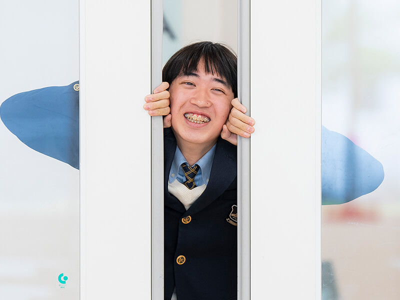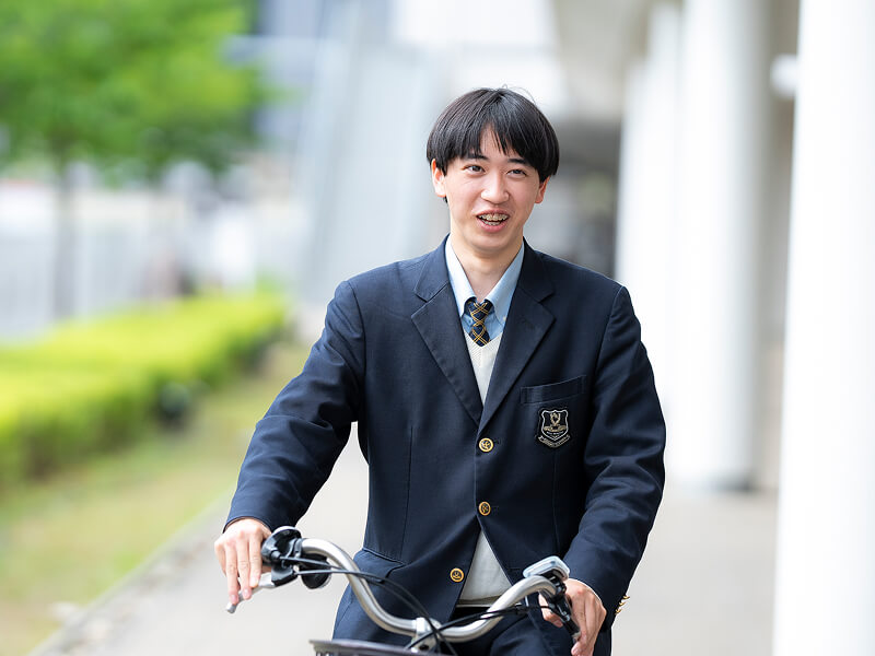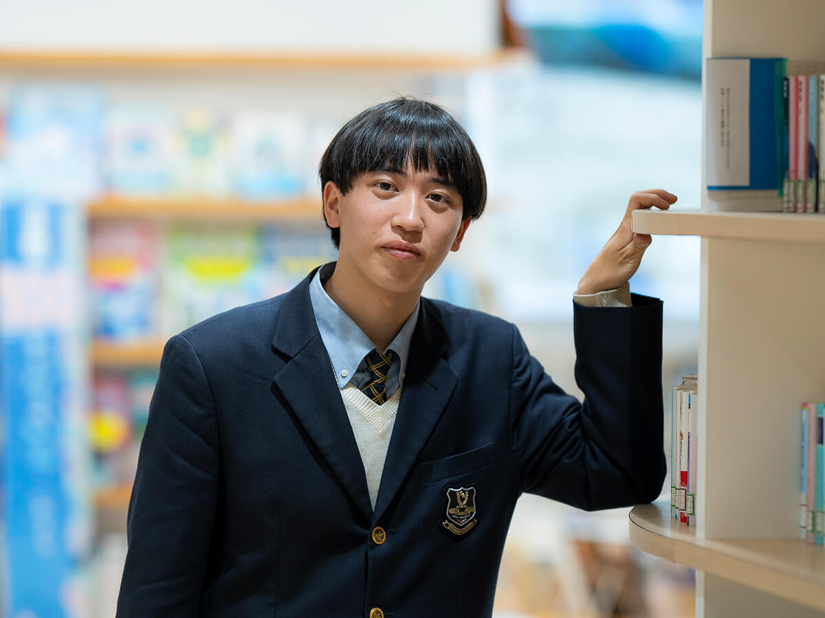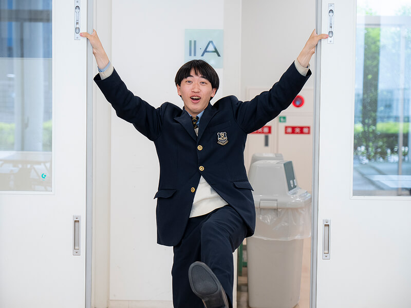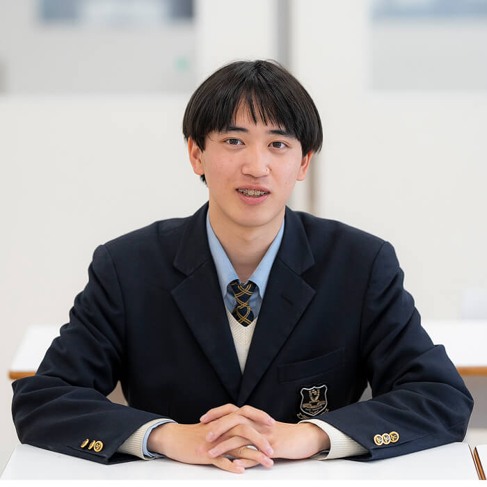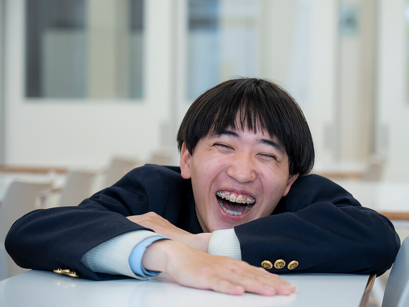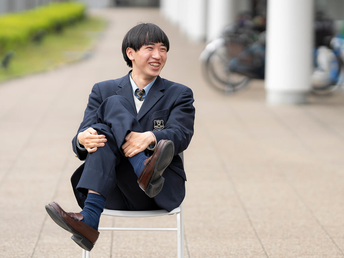 僕がこの追手門学院に行くことを決めたのは、オープンキャンパスに参加したのがきっかけ。当時は公立の中学校に通っていて、国語の授業のカタチに楽しさを感じていました。具体的には、クラスメートとチームになって意見を出し合ったり、答えに辿り着くまでのそれぞれの考え方をまとめたりしながら進めるスタイルです。追手門のオープンキャンパスでも同じような形式を体験できて、そのカタチが自分に合っていることを思い出し、進学を決意しました。僕が今いる創造コースでは、机が教室の前を向いているわけではなく、チームごとに“島”になっていて、授業の中で分からないことがあれば、いつでも周りの人に聞けるのが特徴です。また「分からないこともあっても、それが普通」という空気感があるので、とても良い環境だと思います。