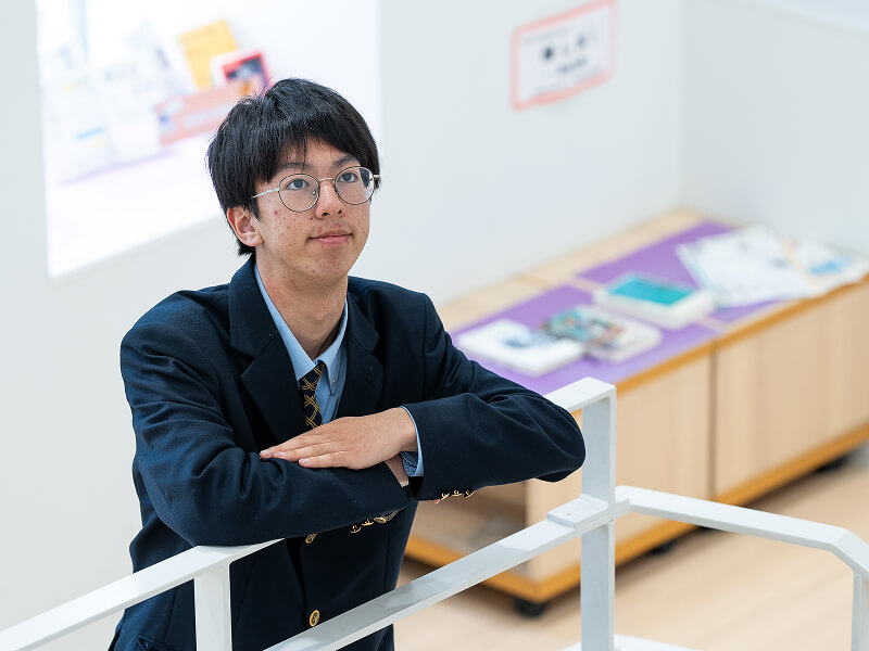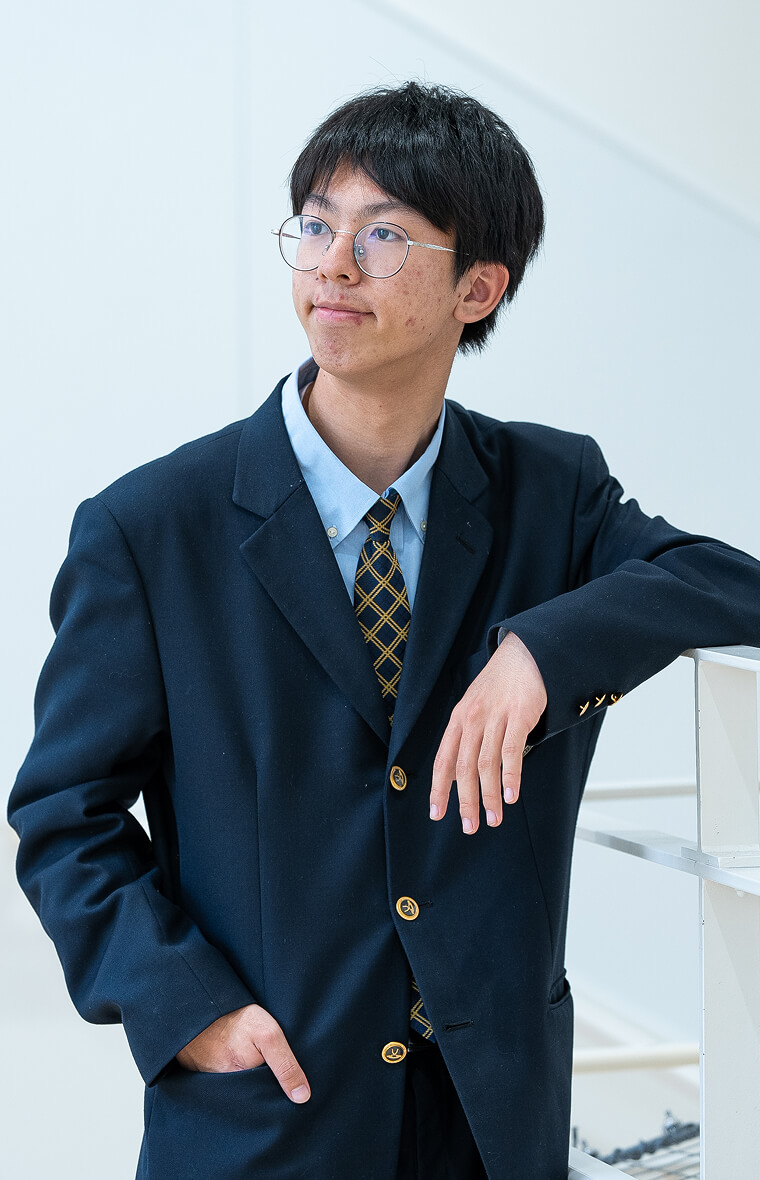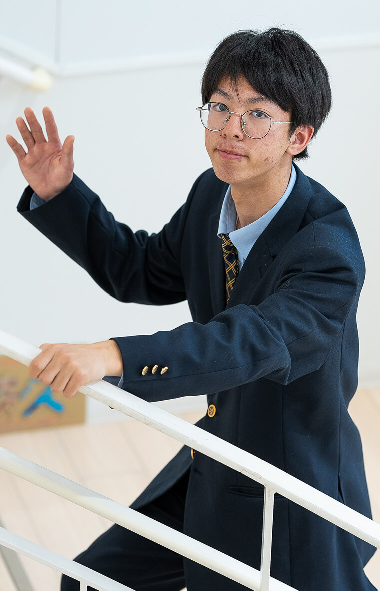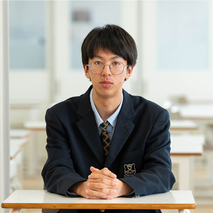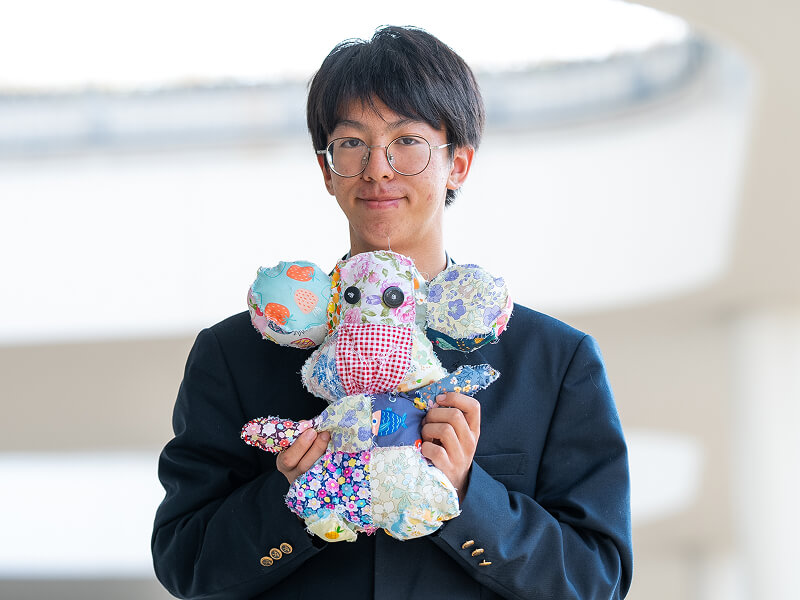 僕が追手門への進学を考えたのは、オープンスクールに参加して、自分に合っているように感じたのがきっかけ。まずは学内が騒がしすぎないこと、そしてだからといって勉強一色という感じでもなく、ある程度自由にできそうなところが、僕がなんとなく求めていたイメージと合っているような気がしました。入学時はⅠ類でしたが、2年生からは特進SSコースに変わって、今は生物や科学、物理などの教科に特に意欲的に取り組んでいます。また1年生の時から所属しているのが創作部です。絵でも粘土でも、とにかく「創作」できるものであれば何をやってもいい部活で、僕はもともとは水彩画に力を入れていて、最近は手芸やパッチワークにはまっています。
