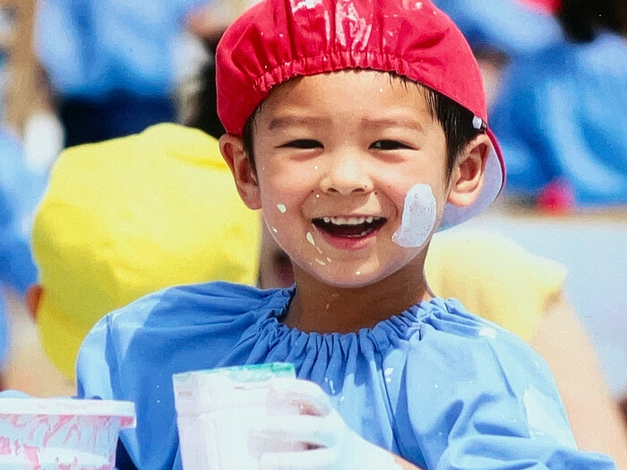 幼稚園の頃、絵の具を使って遊んだ写真。この頃から絵を描くのが好きで、この時も笑顔で楽しんでいました。