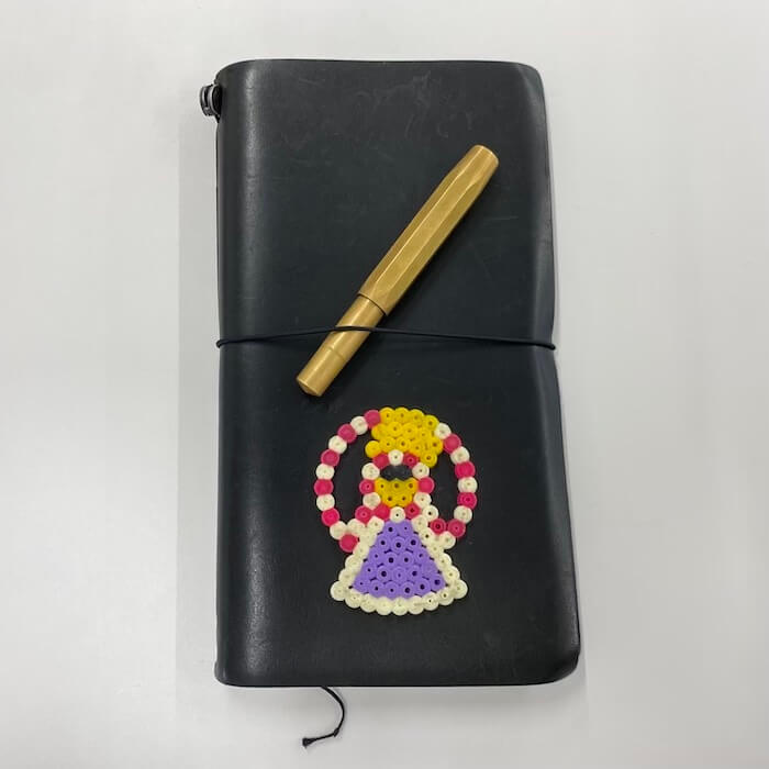 子どもにもらったアイロンビーズを貼り付けたノートと、SFMOMAで一目惚れしたペン。中身は自分のリフレクションそのもの。